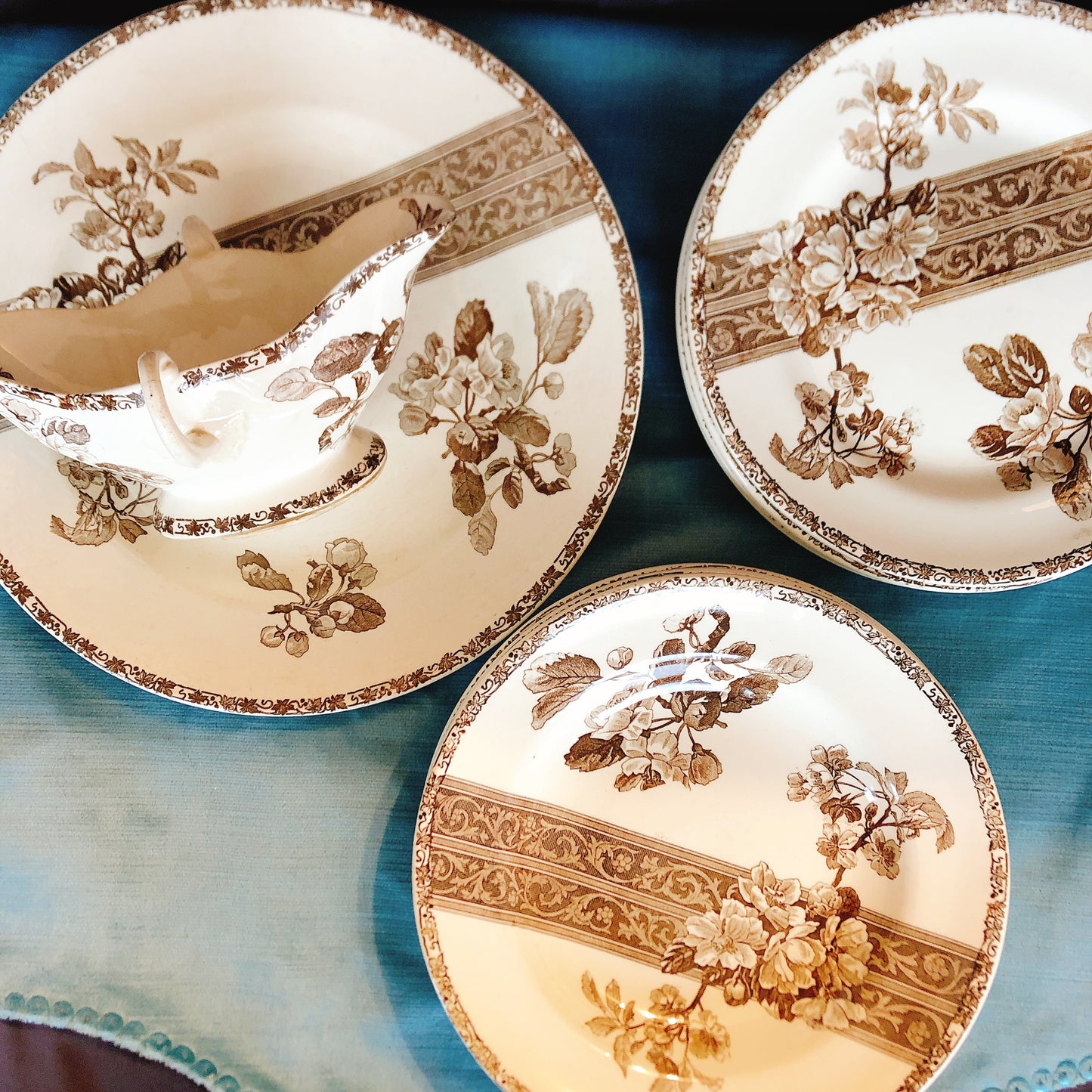 上品なブラウンカラーでレース柄とお花が描かれた、エレガントで上質な逸品。ブルジョアに愛された大変人気の希少なお宝です。