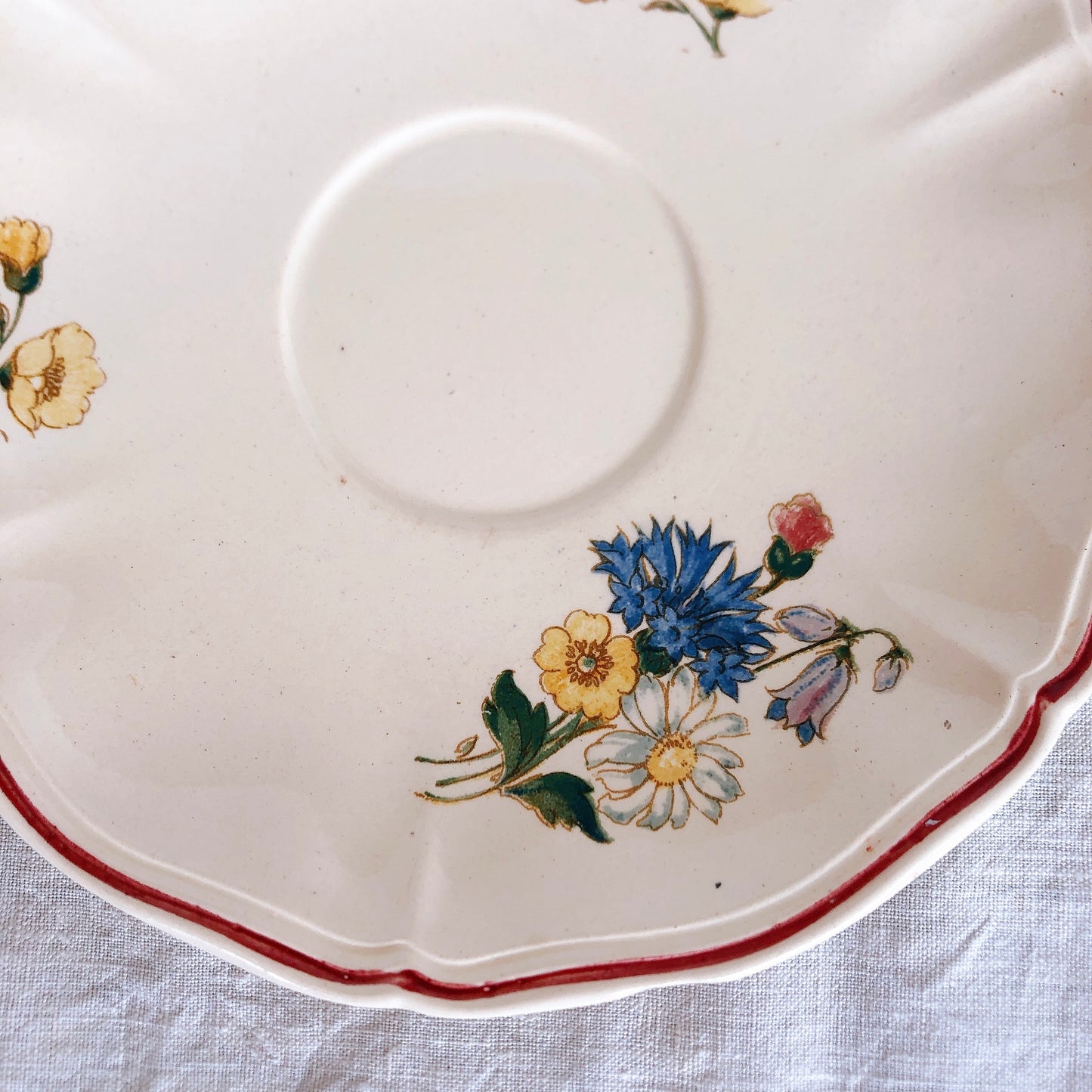 サルグミンヌ窯の人気シリーズ花リムを原型に、縁取りに赤いライン、真ん中と周りにポピーやひな菊などの野花をちりばめた、定番・人気の、アグレストシリーズです。