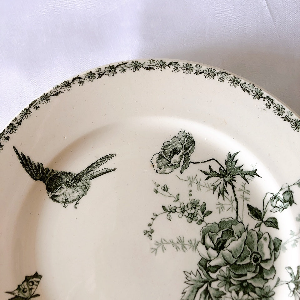 落ち着いた深いグリーンカラーでレース柄、鳥、蝶、お花が描かれた、エレガントで上質な逸品。ブルジョアに愛された大変人気の希少なお宝です。