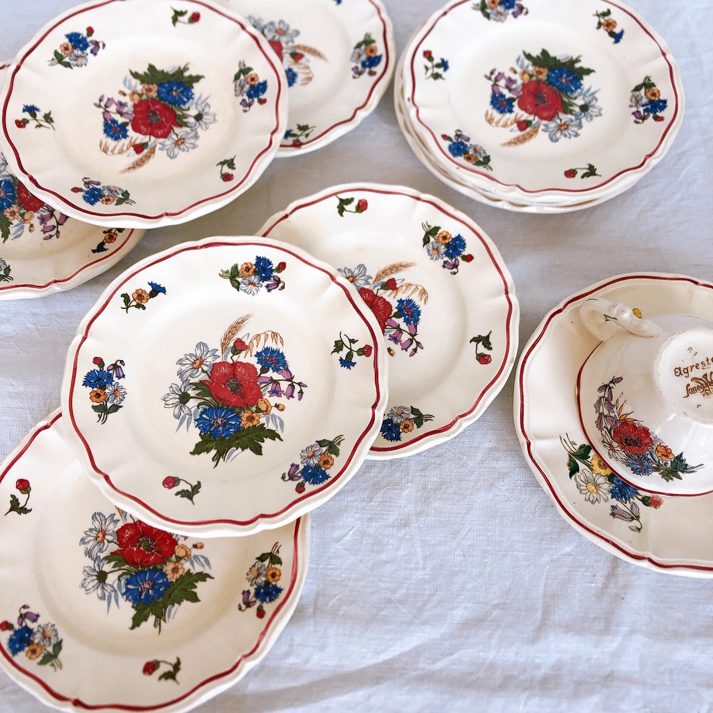 サルグミンヌ窯の人気シリーズ花リムを原型に、縁取りに赤いライン、真ん中と周りにポピーやひな菊などの野花をちりばめた、定番・人気の、アグレストシリーズです。