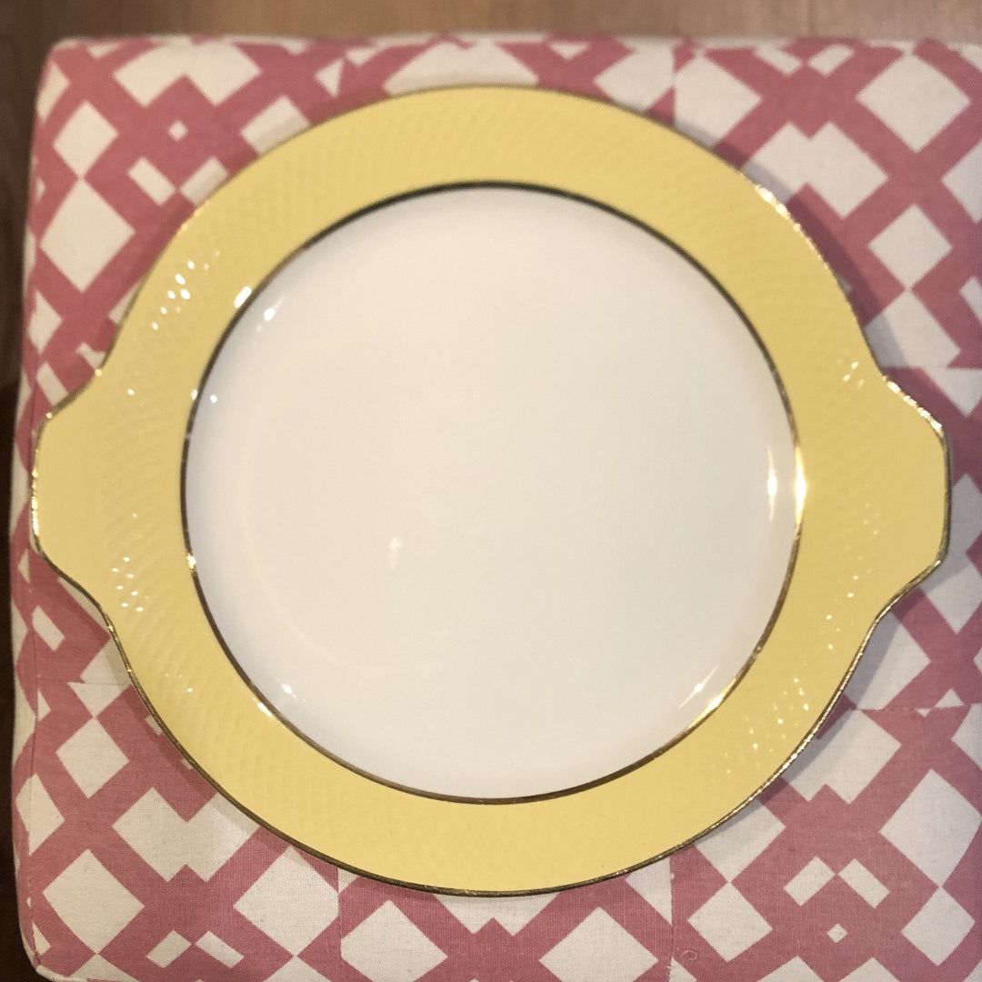ムーランデルー-Moulin des Loups-ディナープレート です。白い陶器に黄色の縁取りと金色のラインが入ったシンプルなデザインで華やかなお色です。