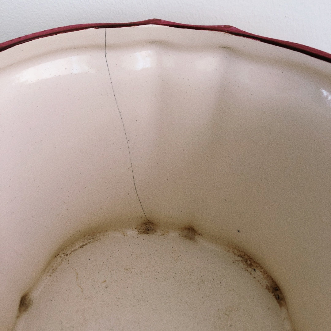 一か所ラインがございますがご使用には問題ないと思います。縁の上側に一か所小さなチップがございますがさほど目立ちません。アンティーク品としては良好なコンディションです。