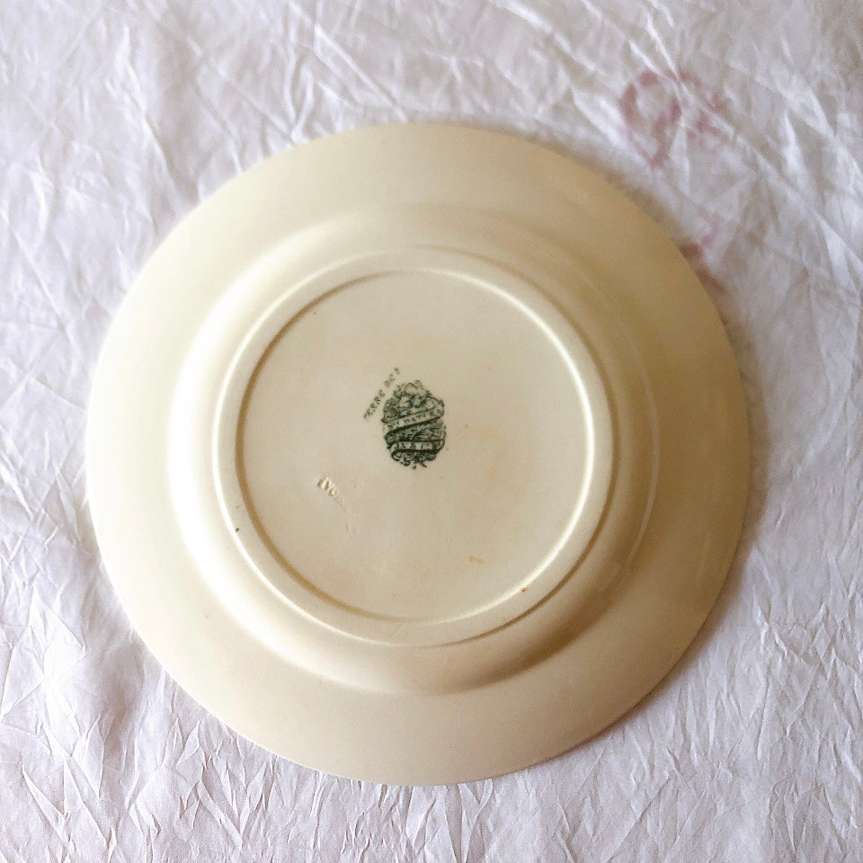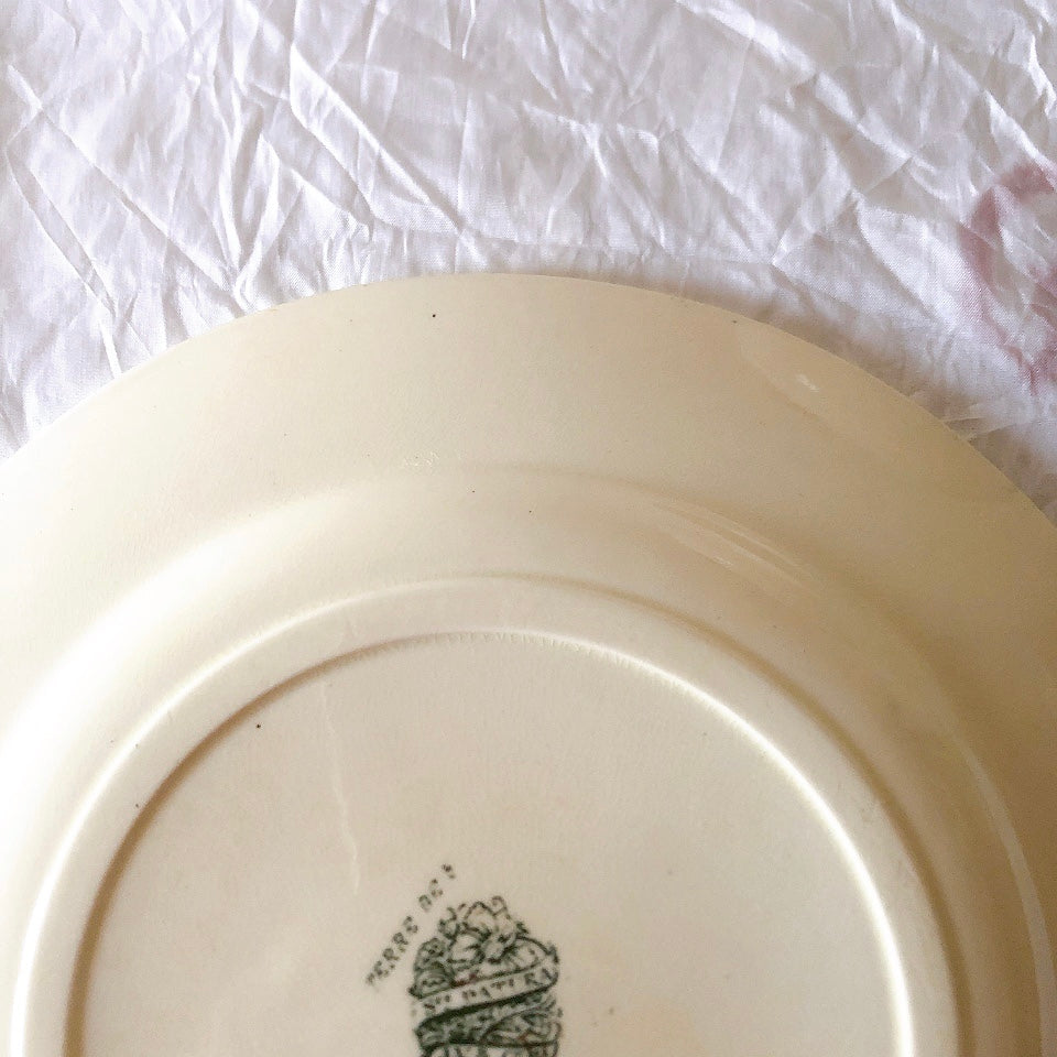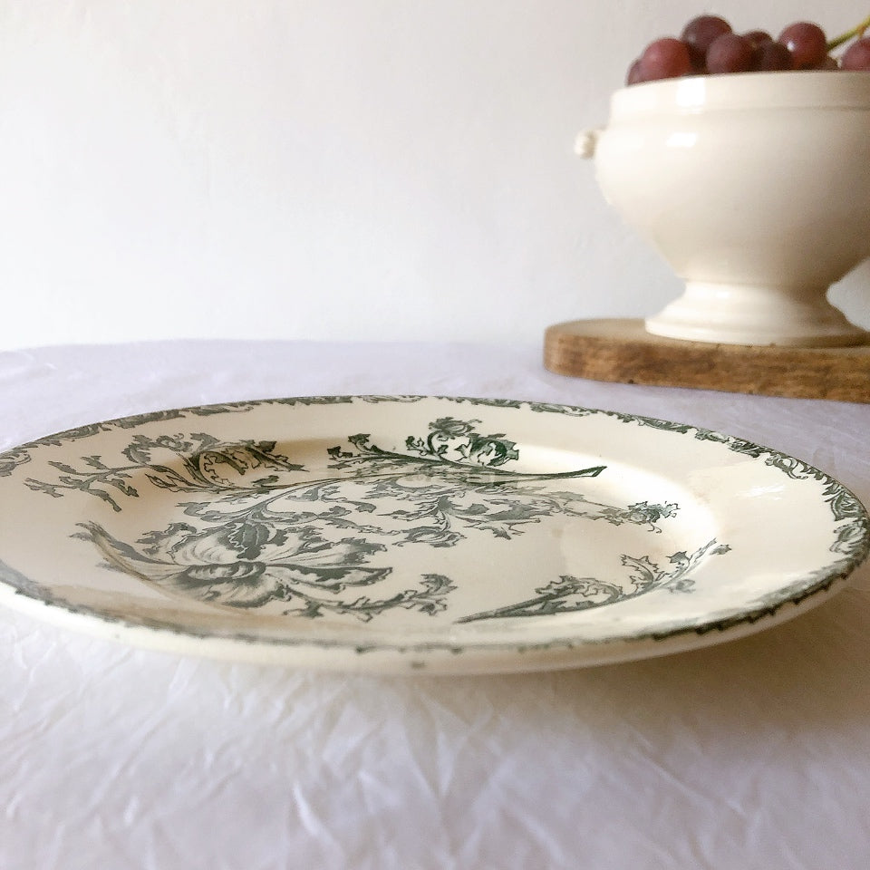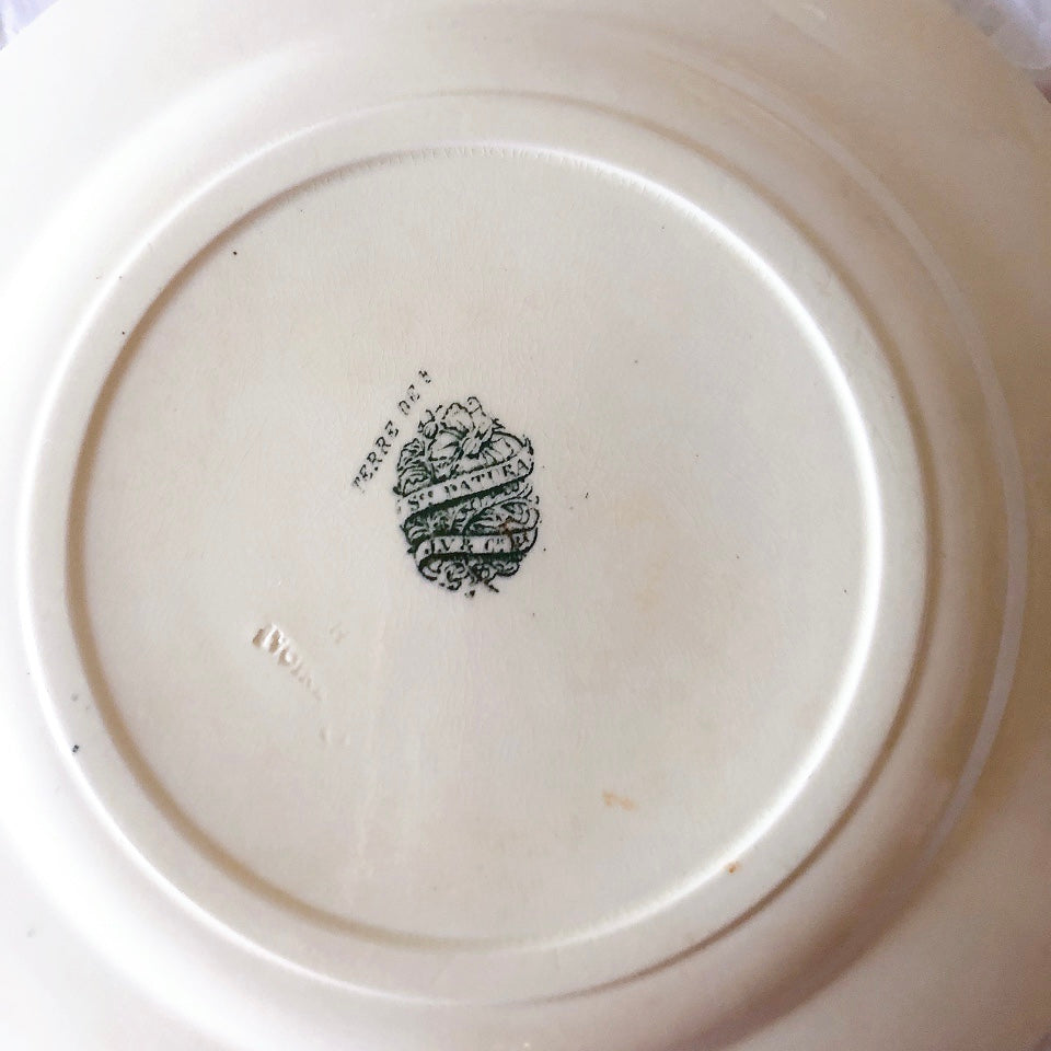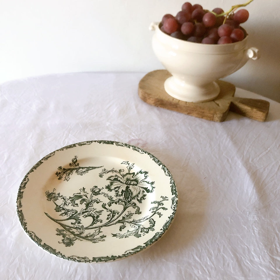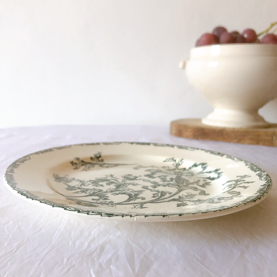 アイボリー色の地に深いグリーンの植物模様が描かれています。コレクションとしてはもちろん、クラシックなフレンチインテリアとしてもお勧めです。