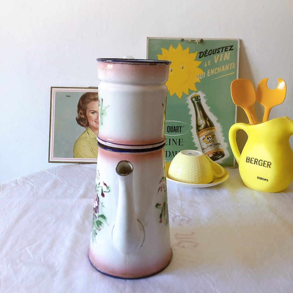 ホワイト地にピンクとライラックのグラデーション、そして手描き風のフラワーモチーフが施された華やかなデザインが魅力です。上下に分かれたデザインは、伝統的なドリップ式のコーヒーポット(カフェティエール)ならでは。上部にはフィルター付きで、当時の人々が丁寧にコーヒーを淹れていた様子が想像されます。