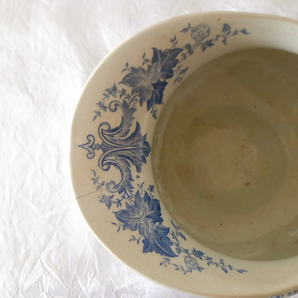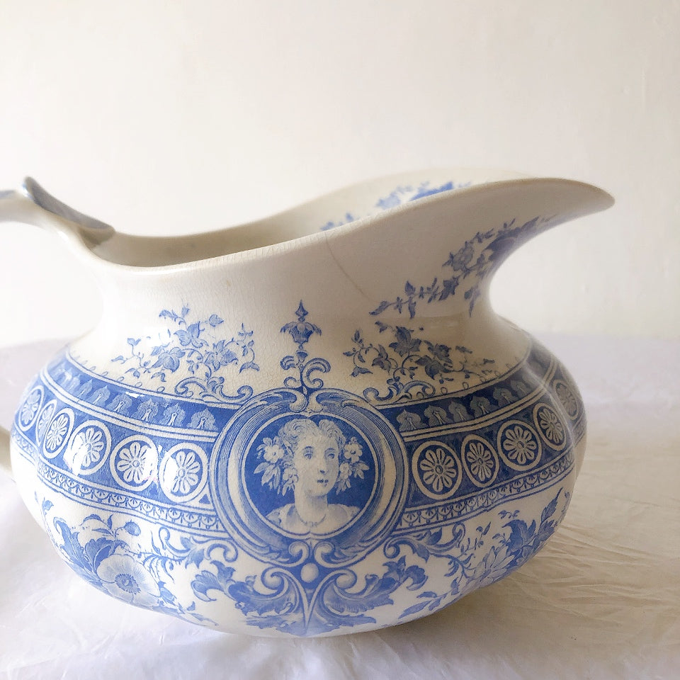 19世紀フランスの美意識を感じさせる、ブルー&ホワイト。やわらかなアイボリー地に、繊細なブルーの花文様とクラシカルな人物メダリオンがあしらわれ、エレガントで気品のある佇まいが魅力です。