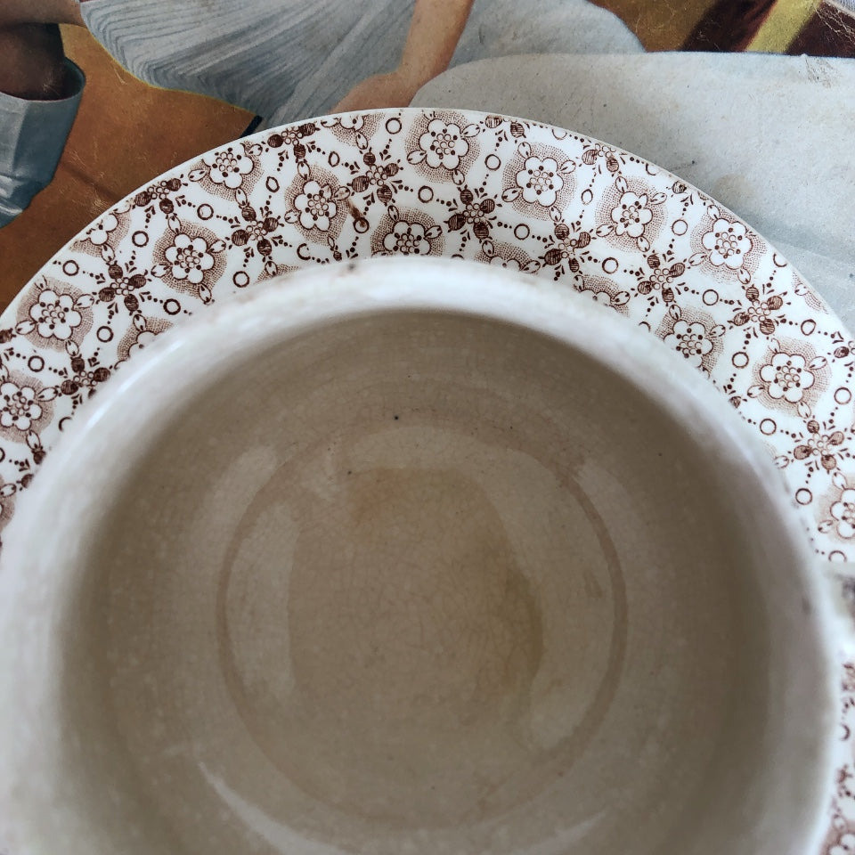 アンティーク品としては良好なコンディションです。カップとソーサーの足の一部に一か所チップがあります。内側に経年による貫入、ステインがみられますが、こちらも魅力の一部となっております。