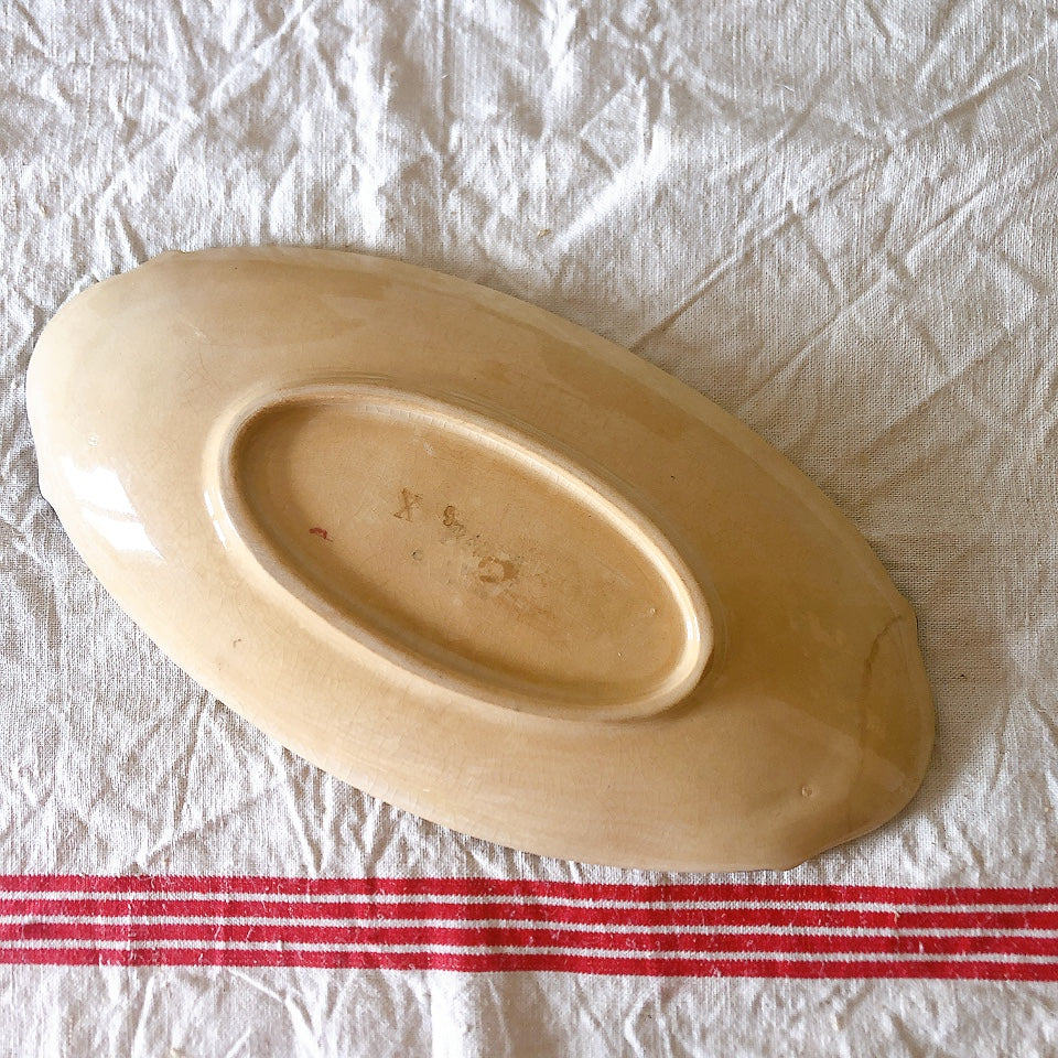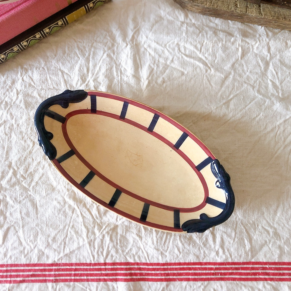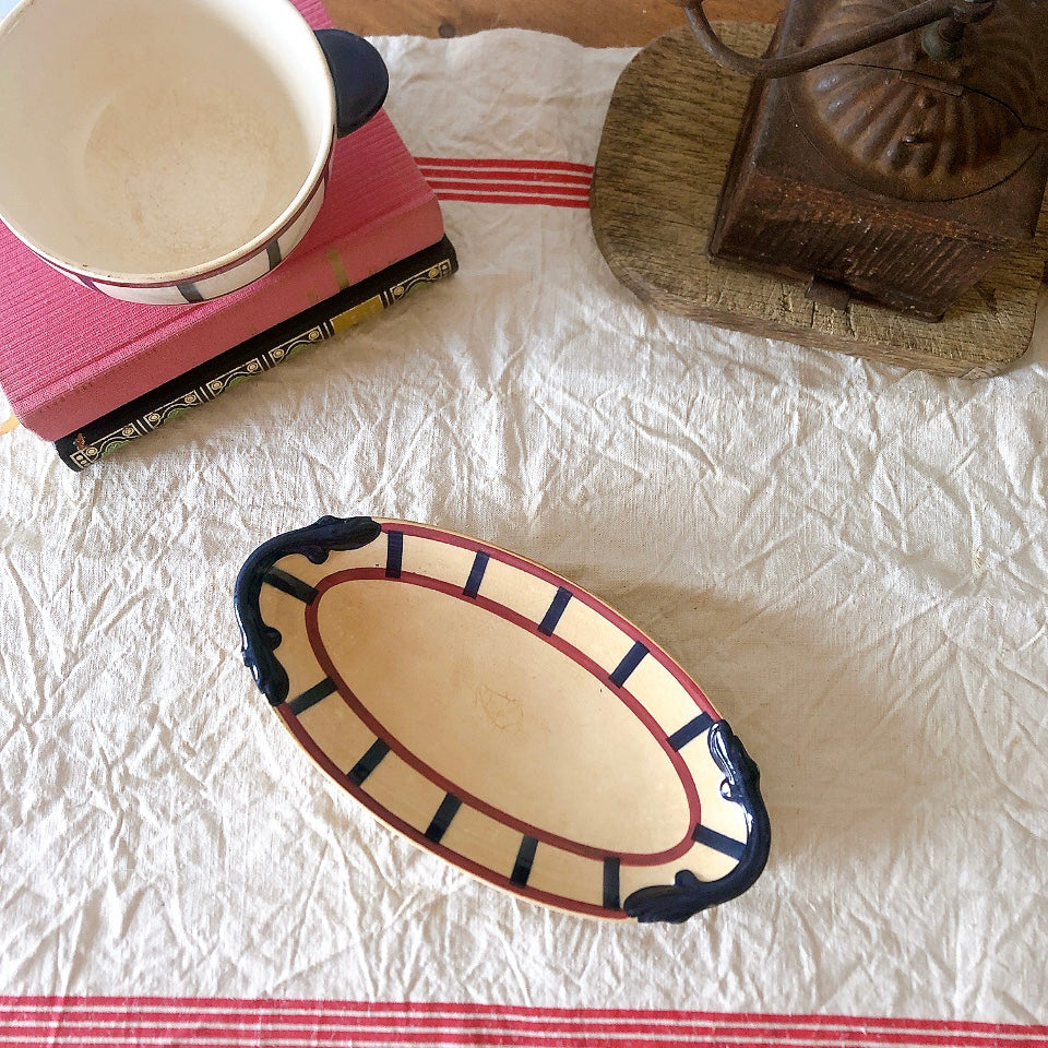 クレイユモントロー HBCM Béarn バスク柄ラヴィエ オーバル皿 「レッドxブルー」フランスアンティーク食器 ブロカント 蚤の市 バスク柄アンティーク