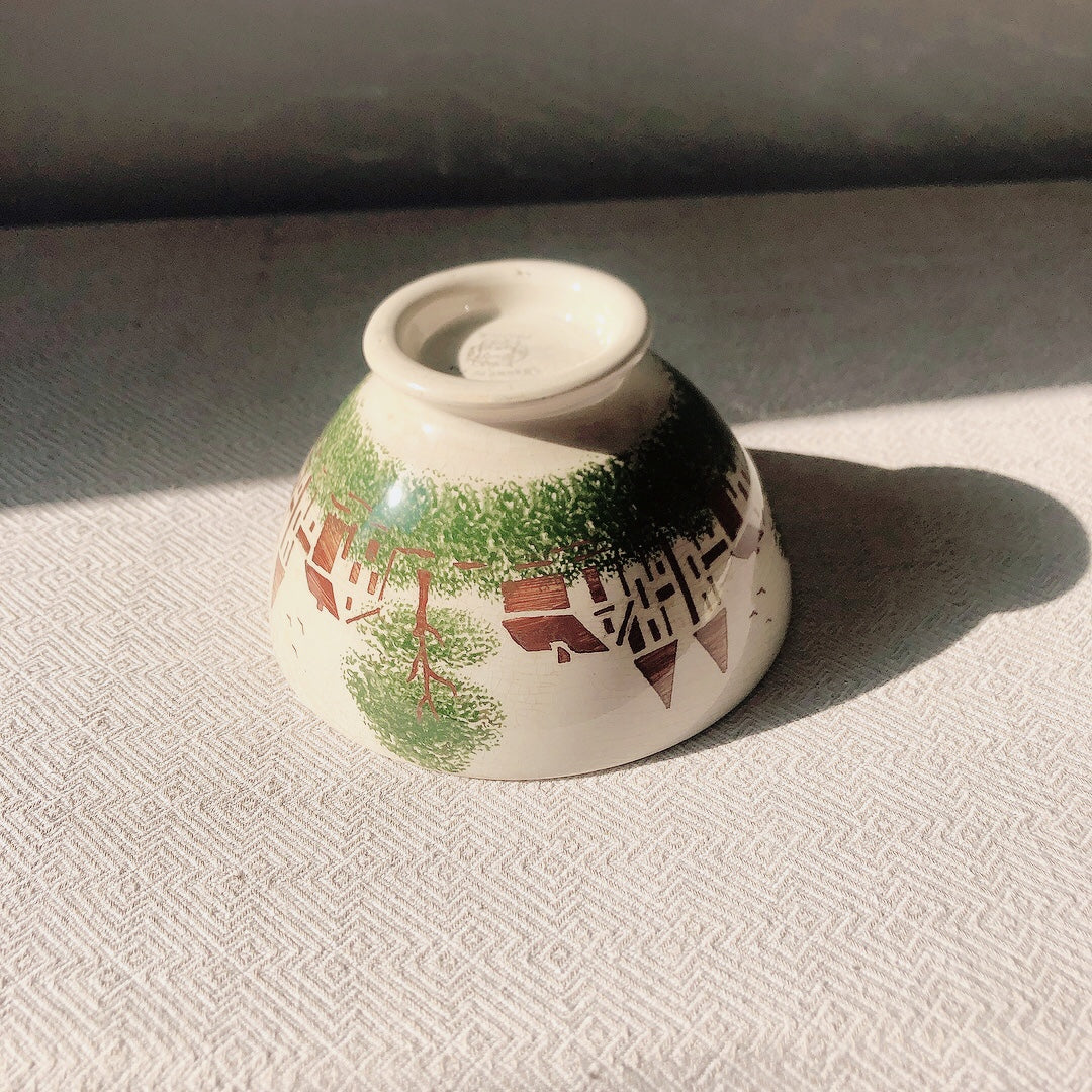 木々の緑にお家、鳥が舞い、小さなカフェオレボウルに沢山の幸せがつまった逸品です。
