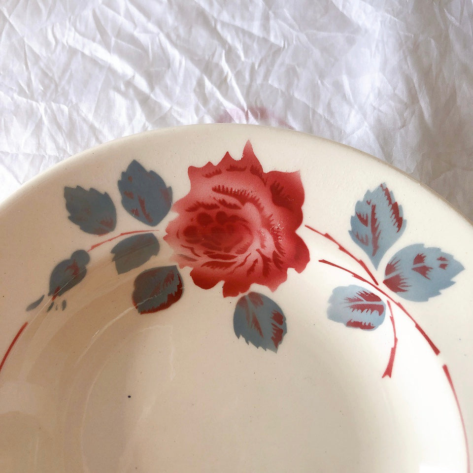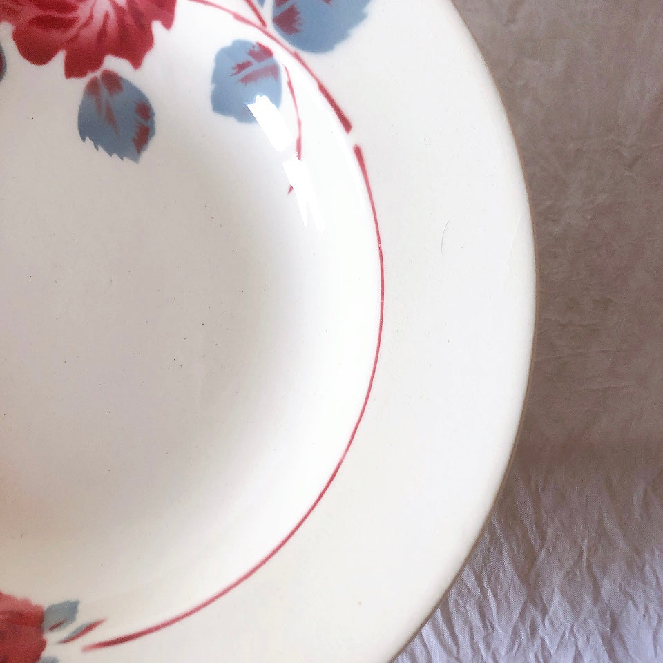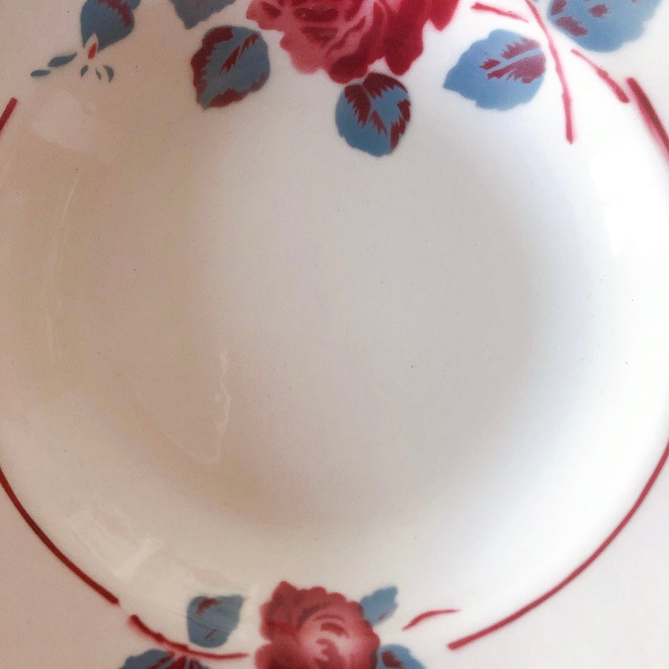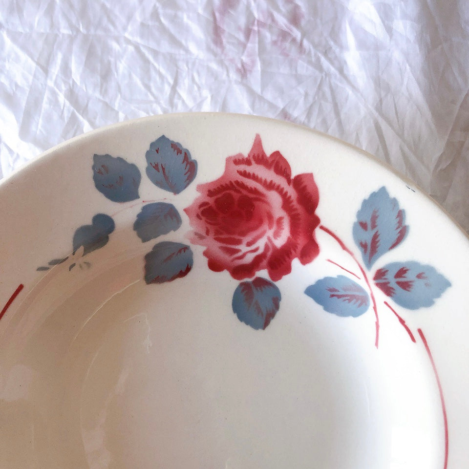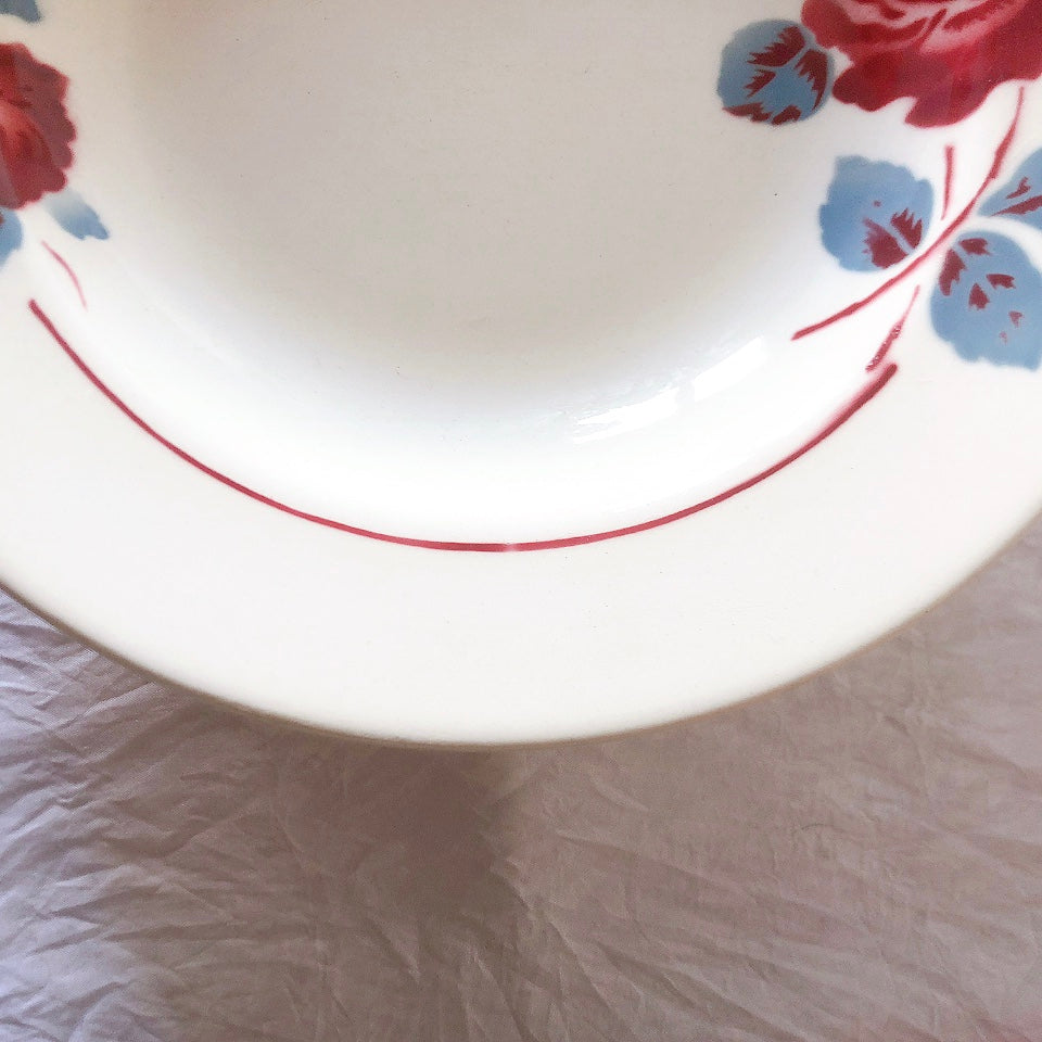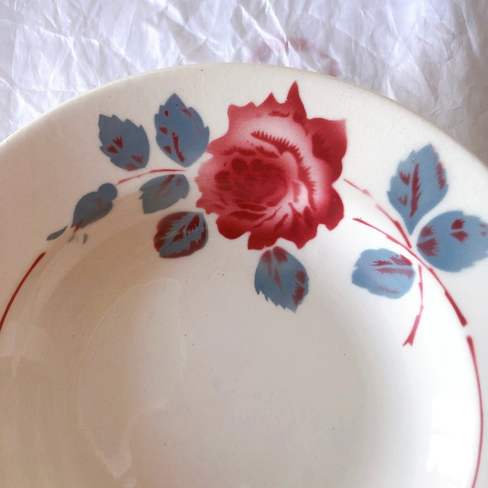 フランスアンティーク バドンヴィレーのバラ柄スーププレート、深皿。赤&白&ブルーグレー。