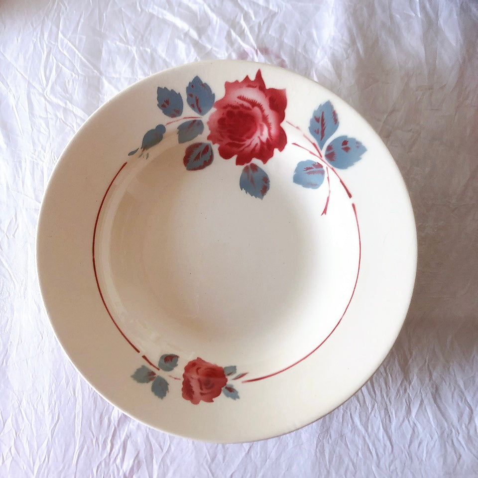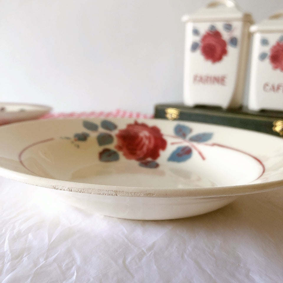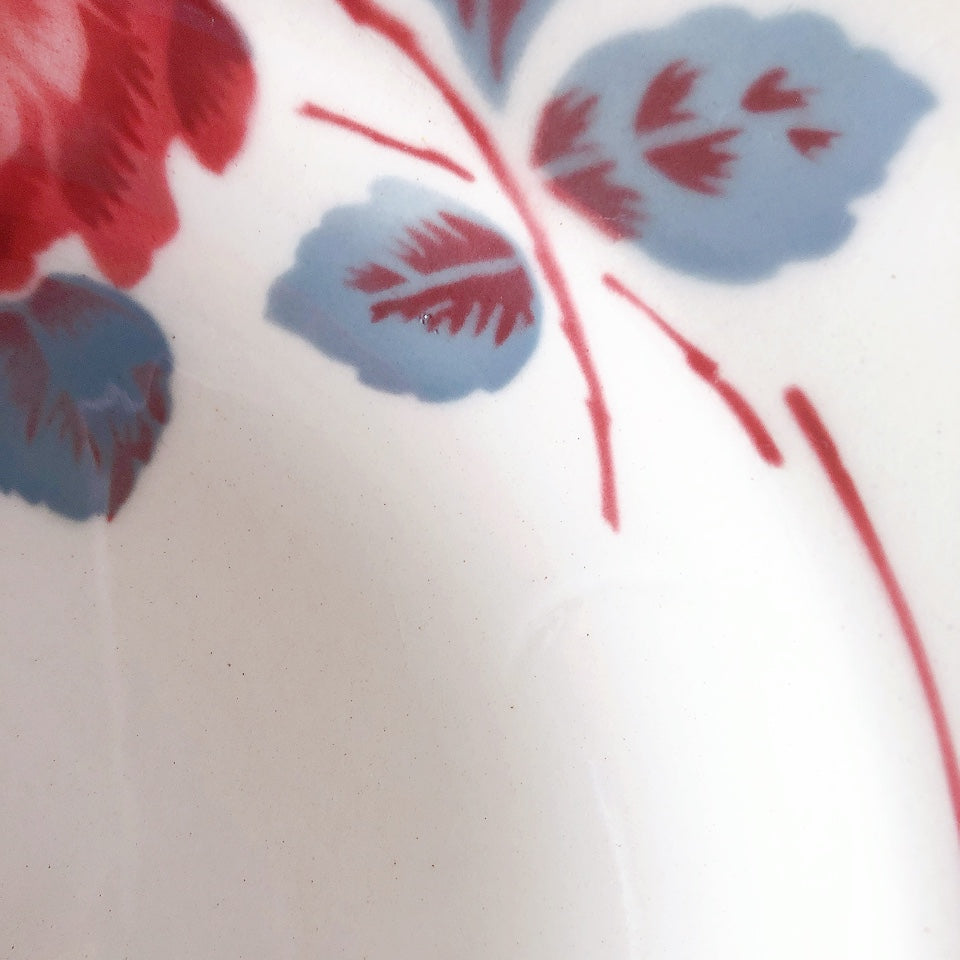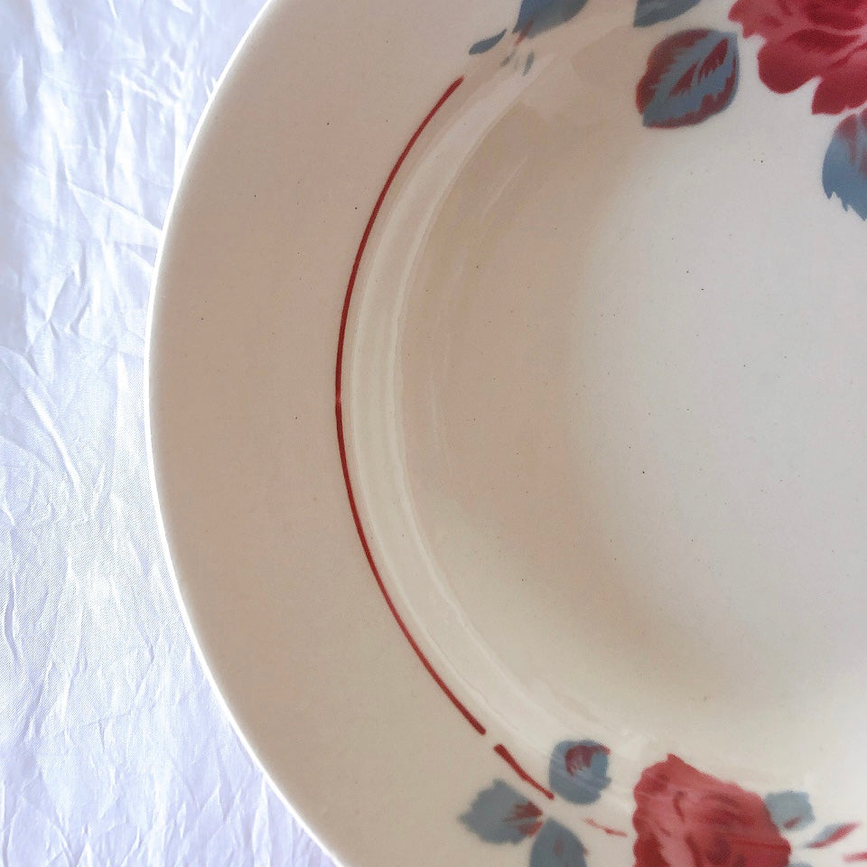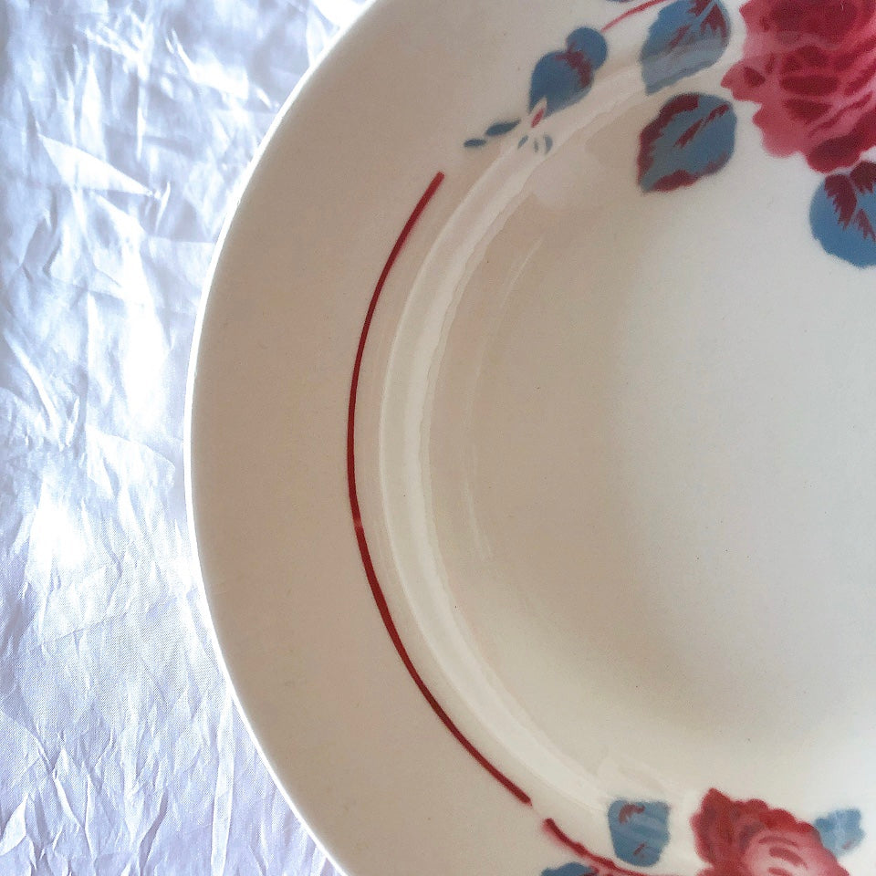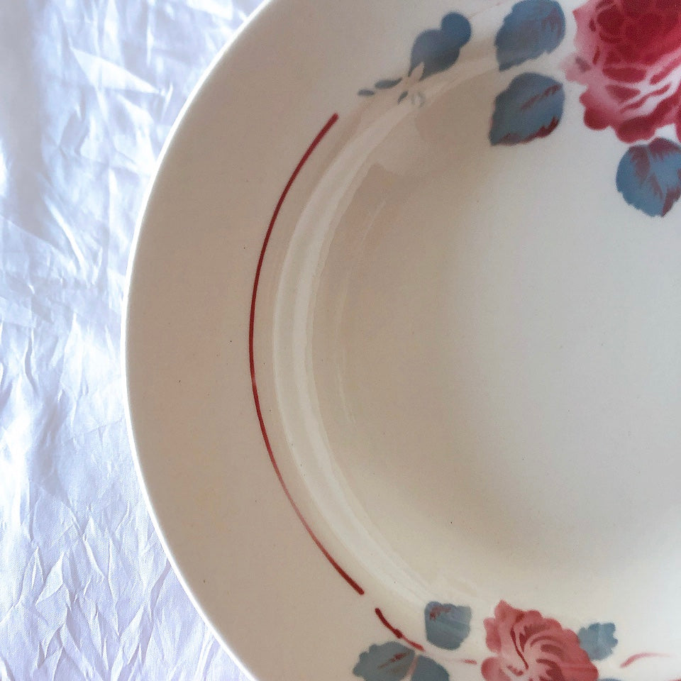 フランスアンティーク バドンヴィレーのバラ柄スーププレート、深皿。赤&白&ブルーグレー。