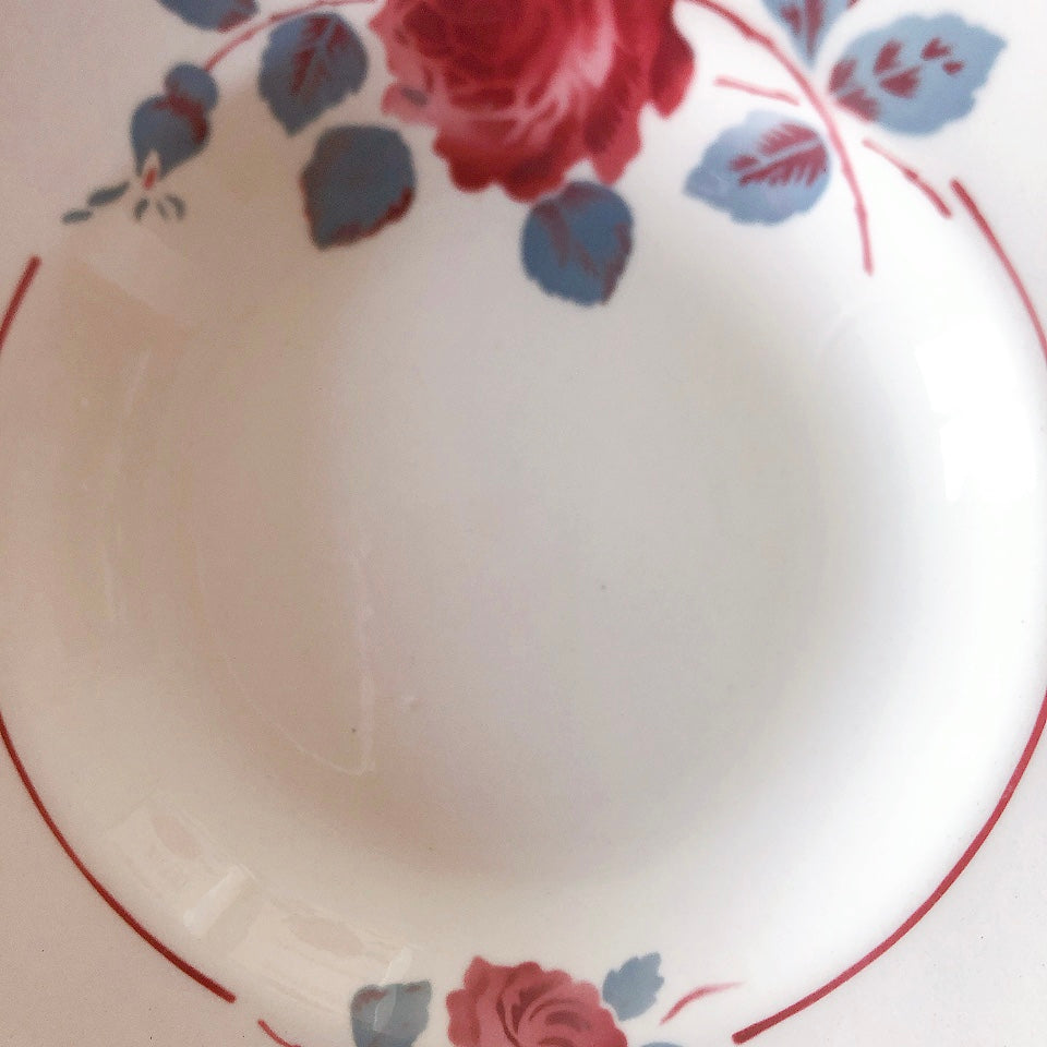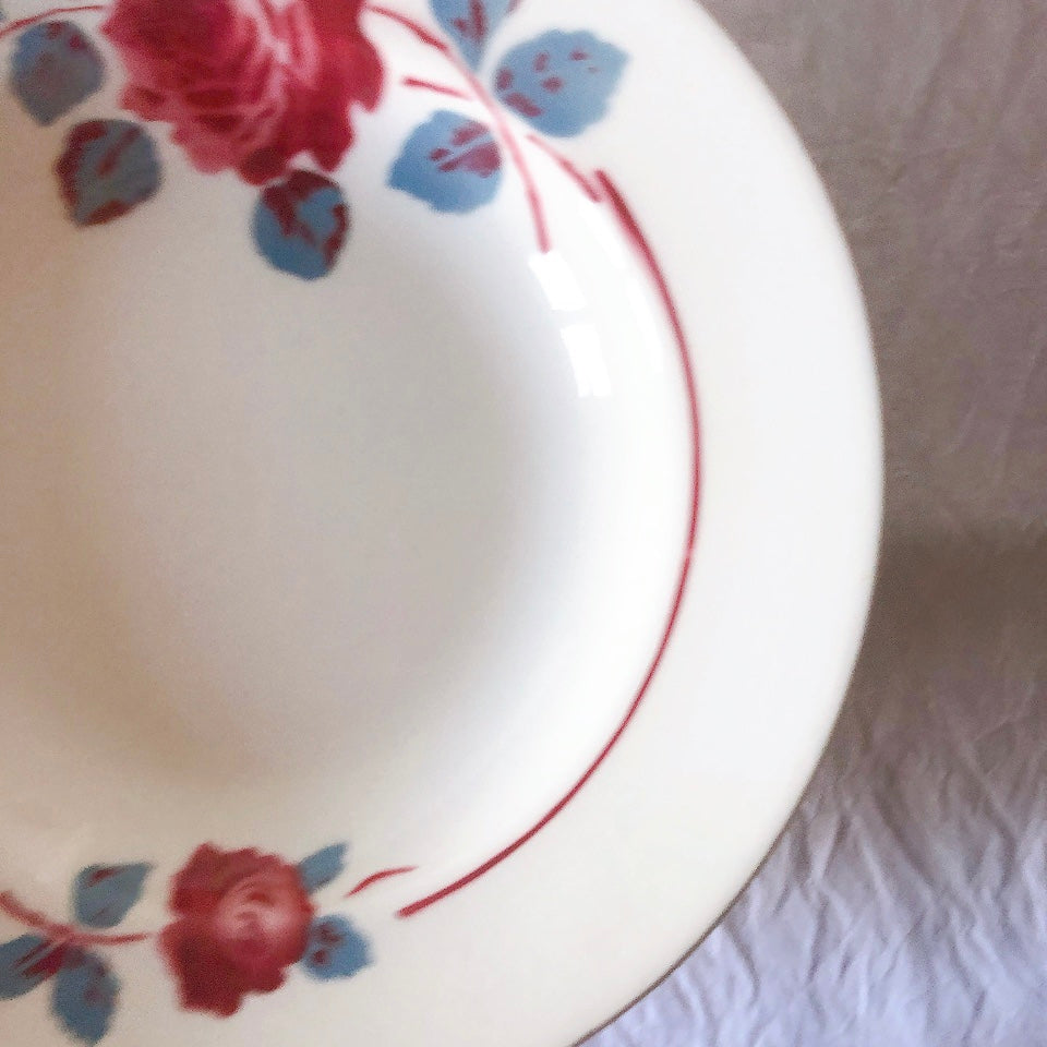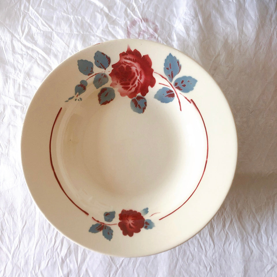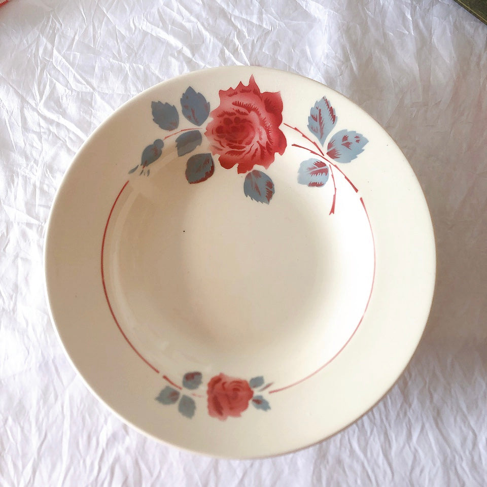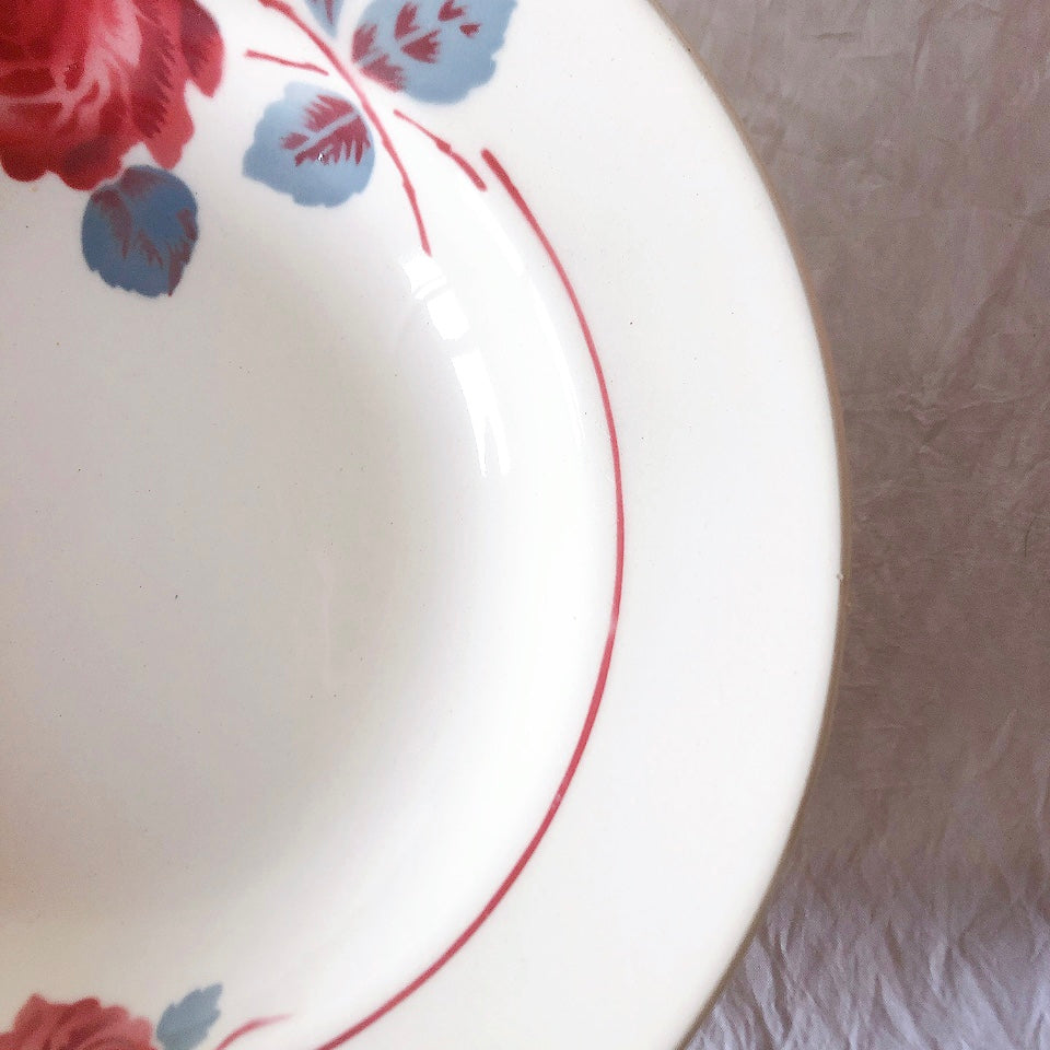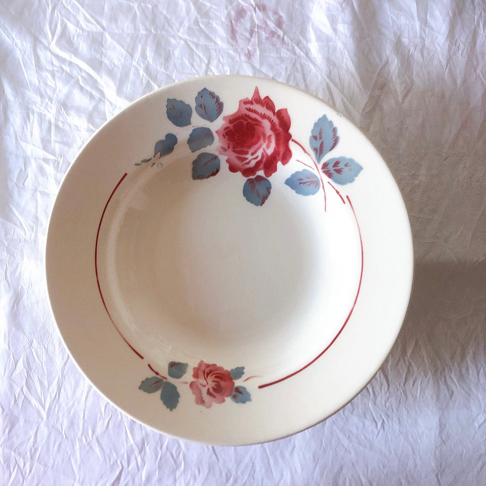 フランスアンティーク バドンヴィレーのバラ柄スーププレート、深皿。赤&白&ブルーグレー。