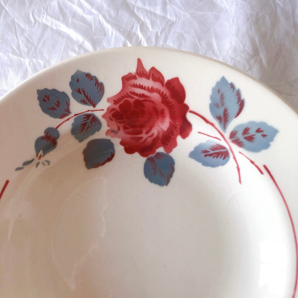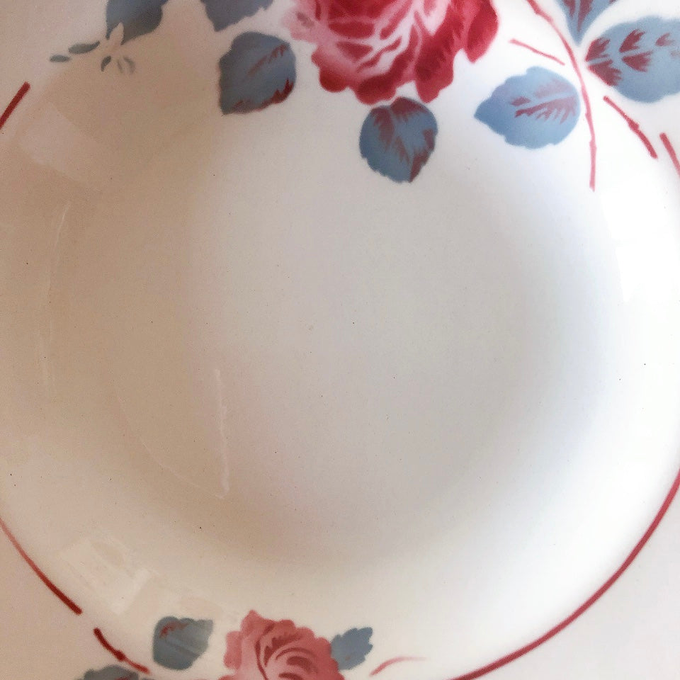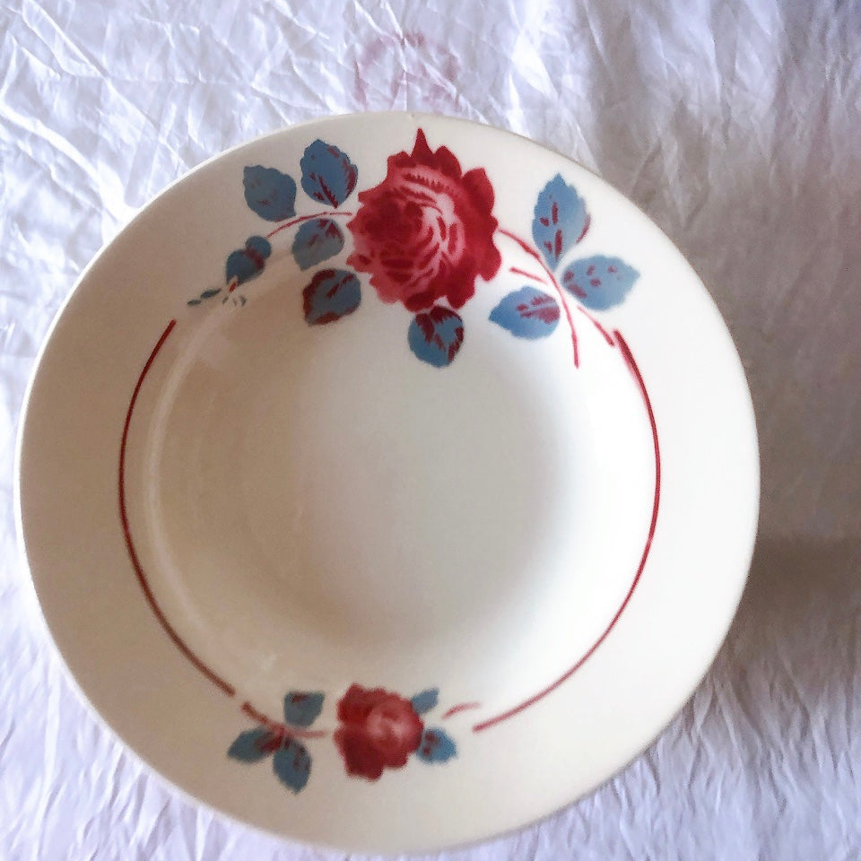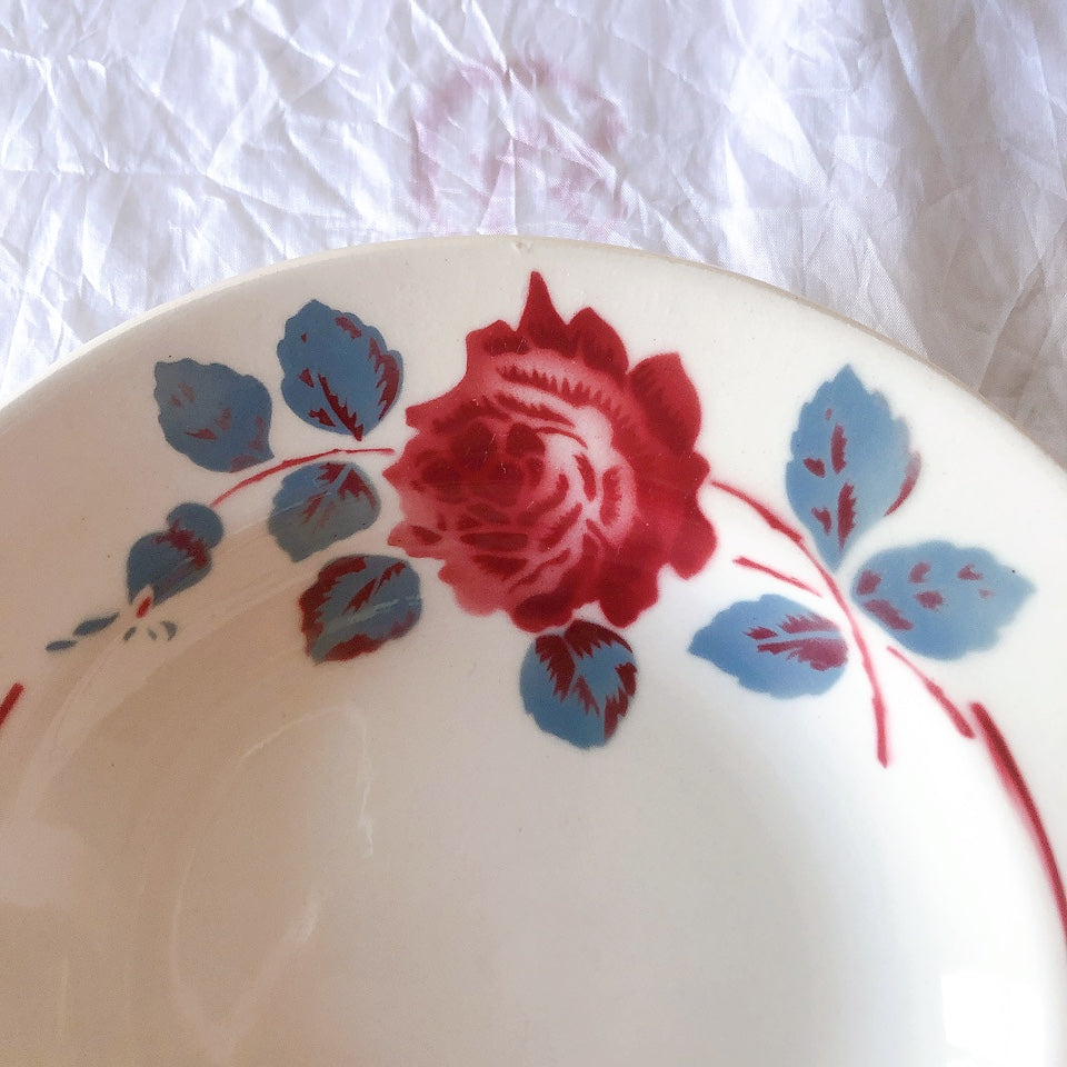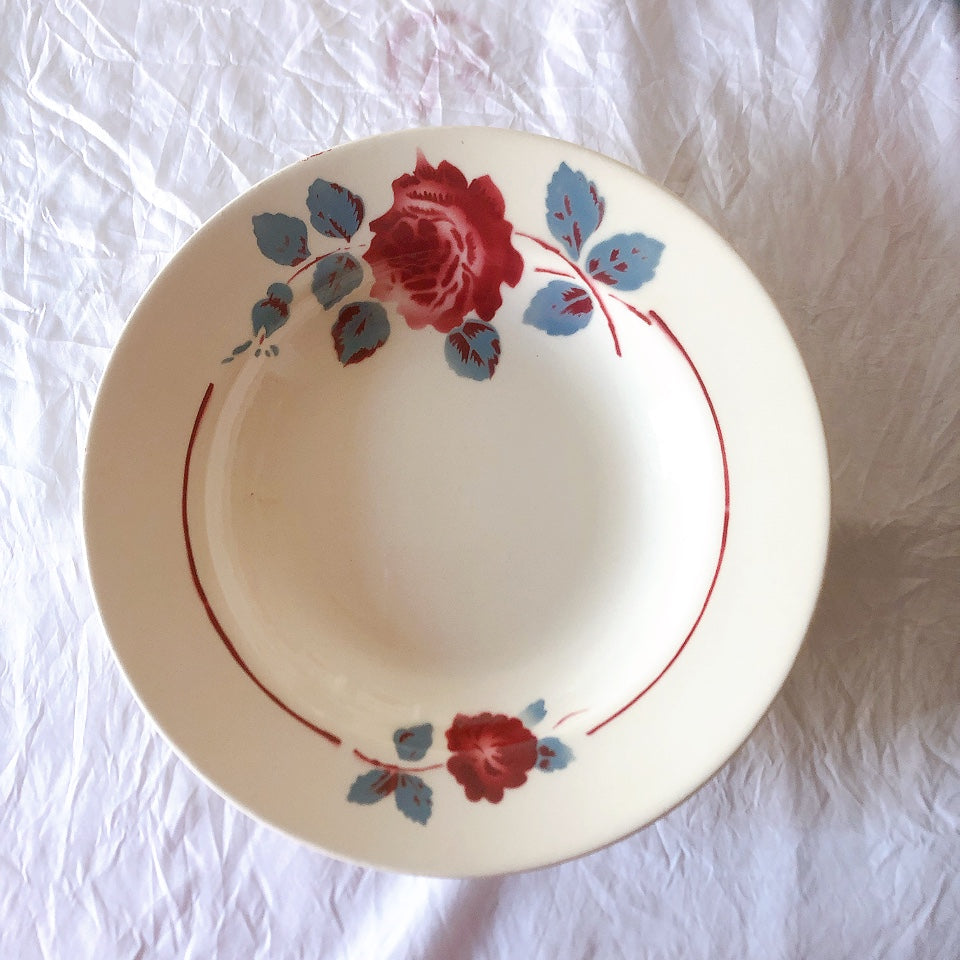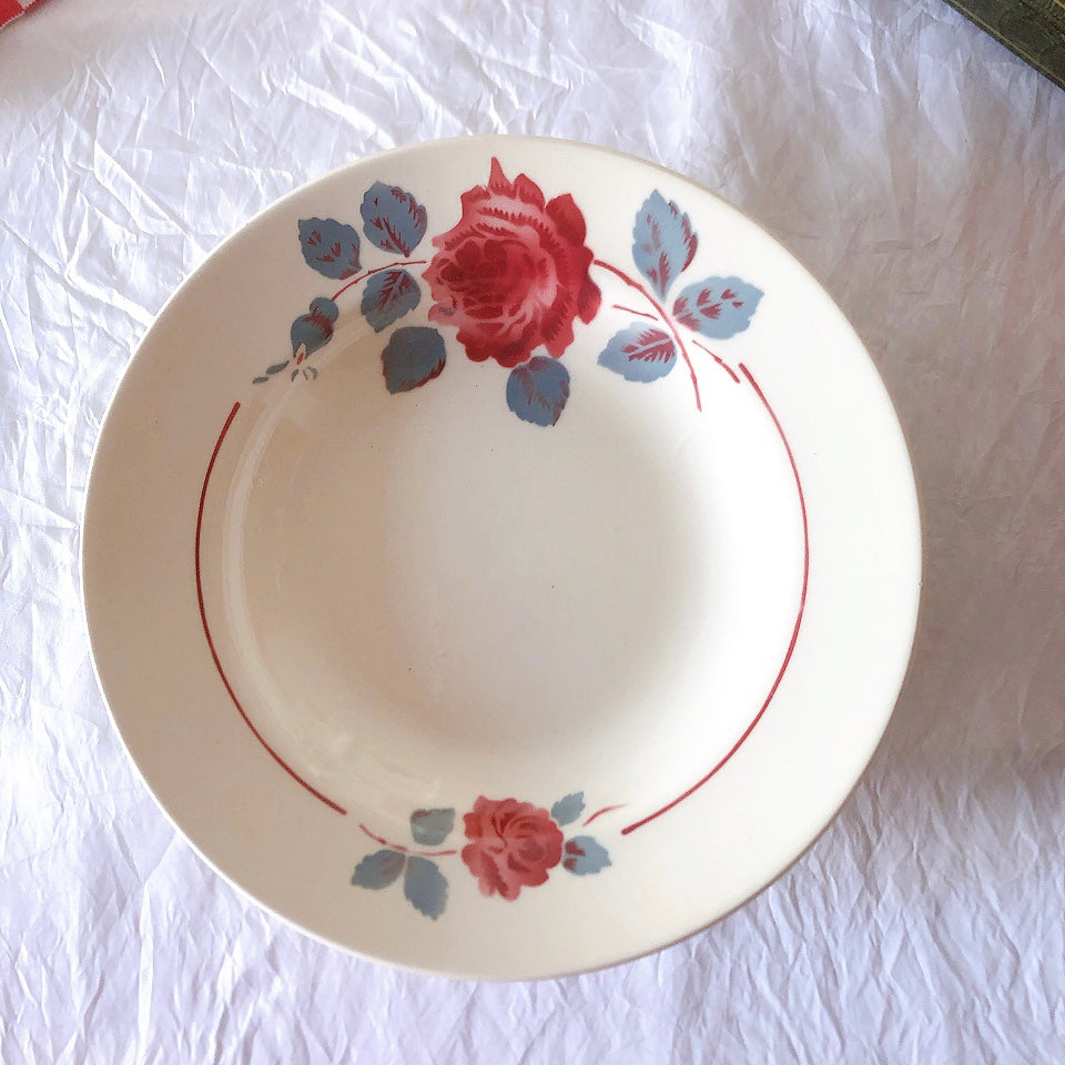 フランスアンティーク バドンヴィレーのバラ柄スーププレート、深皿。赤&白&ブルーグレー。