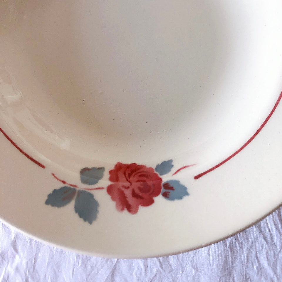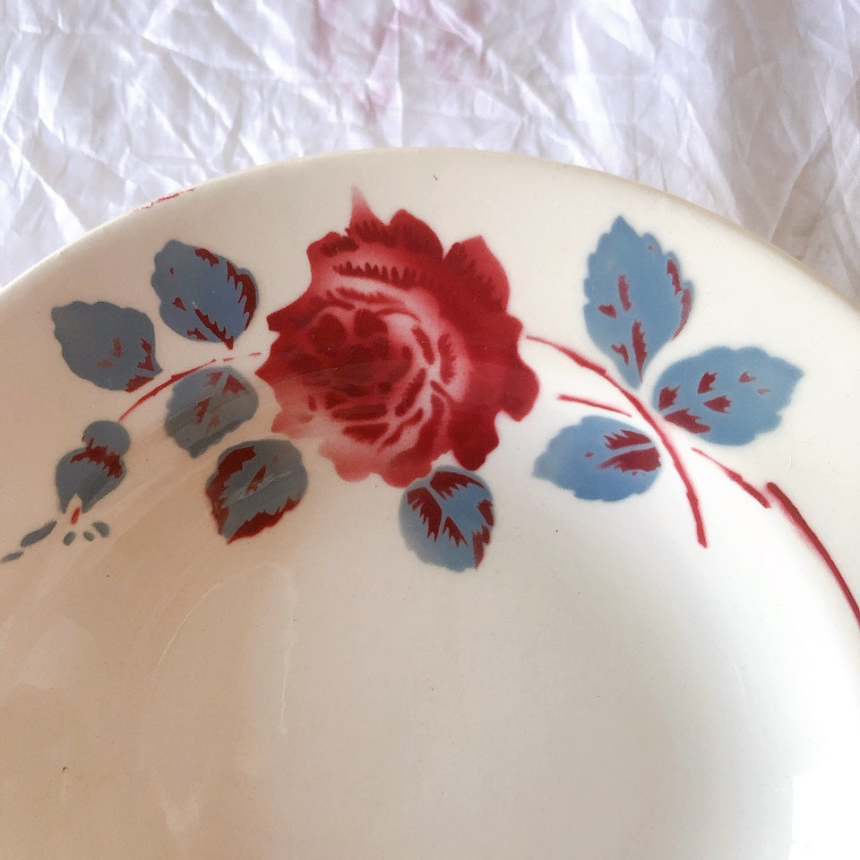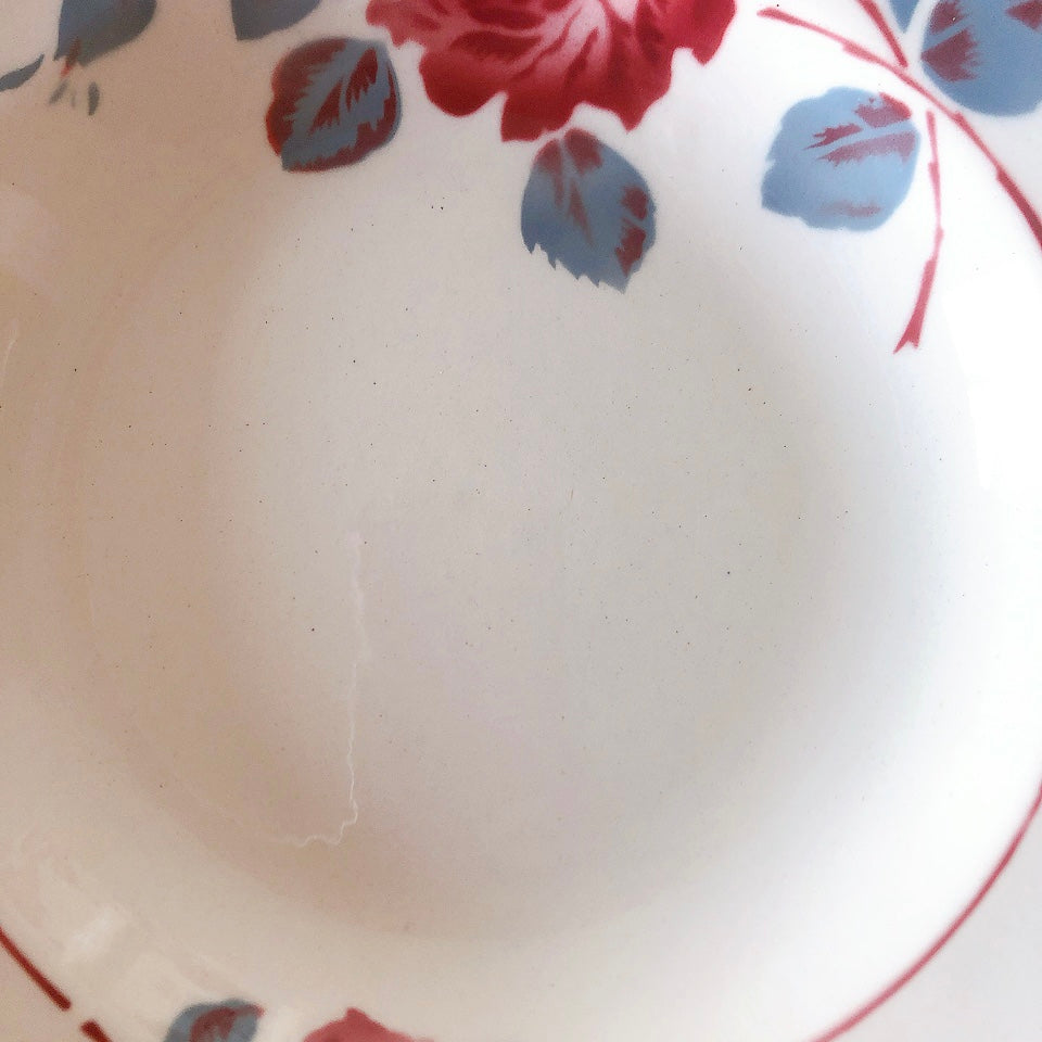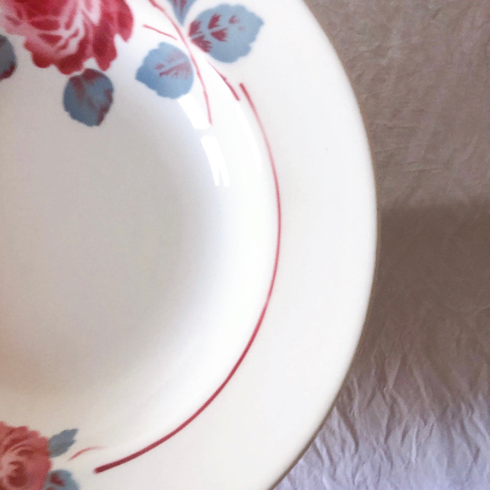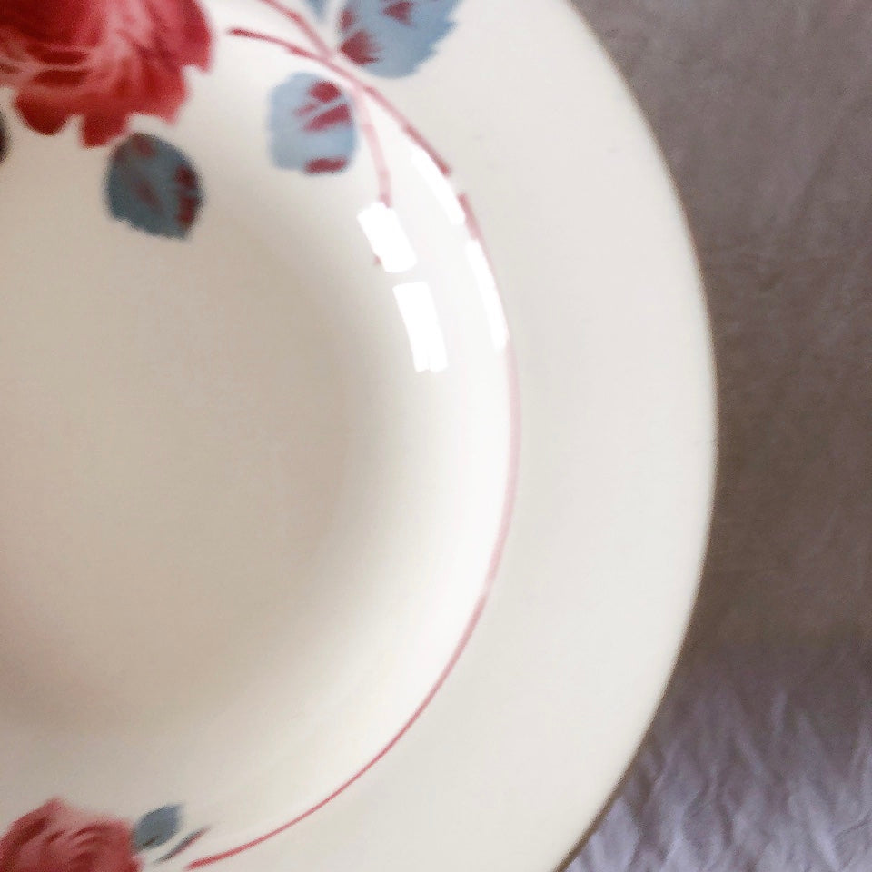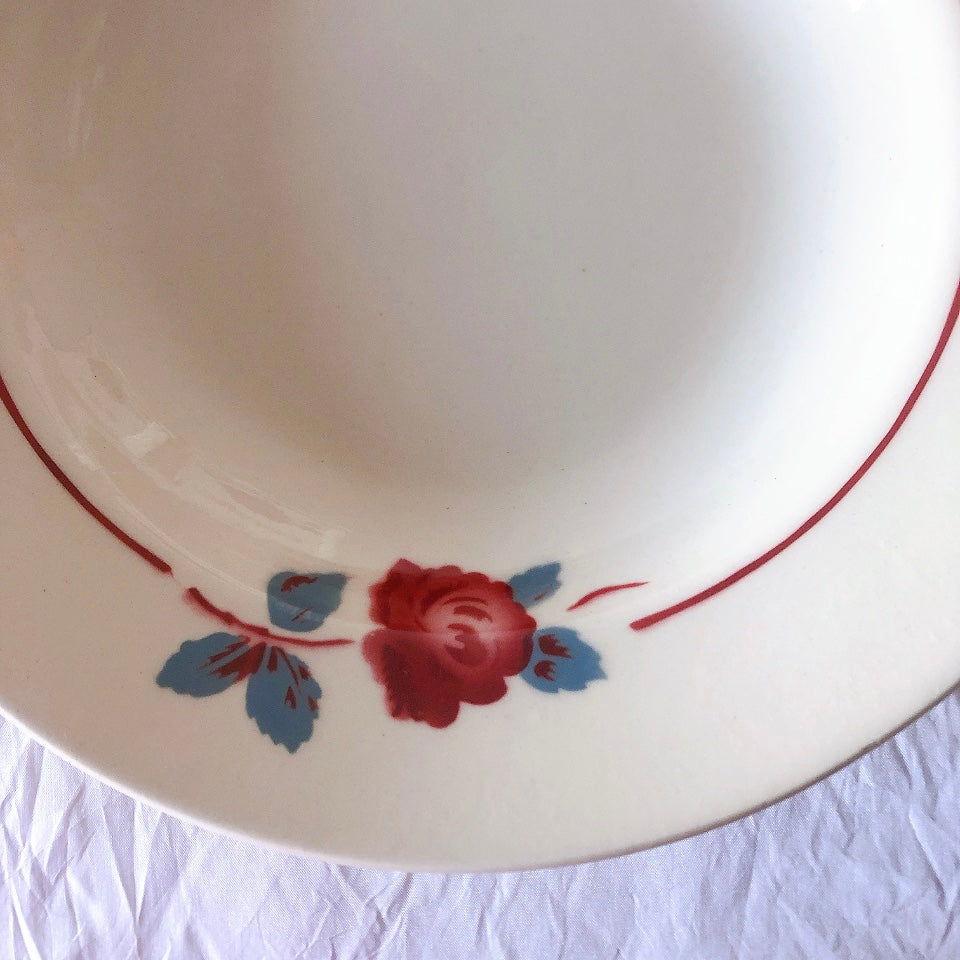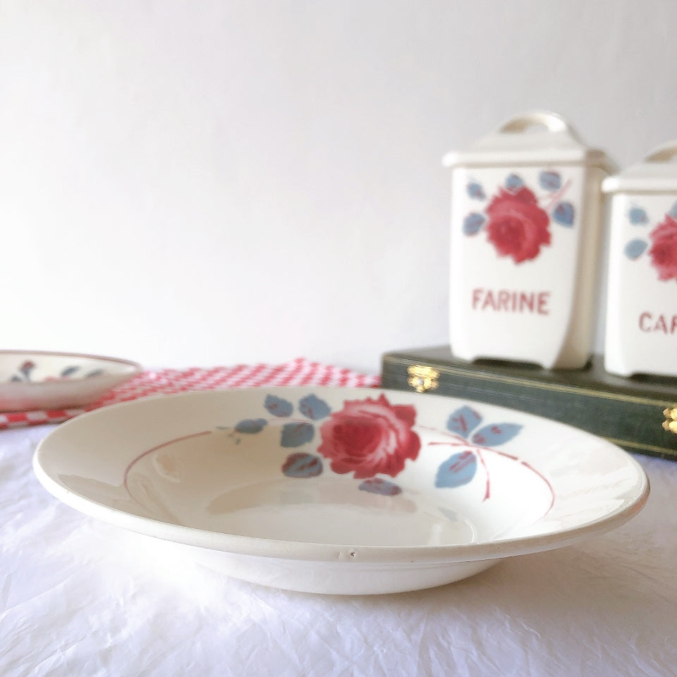 フランスアンティーク バドンヴィレーのバラ柄スーププレート、深皿。赤&白&ブルーグレー。