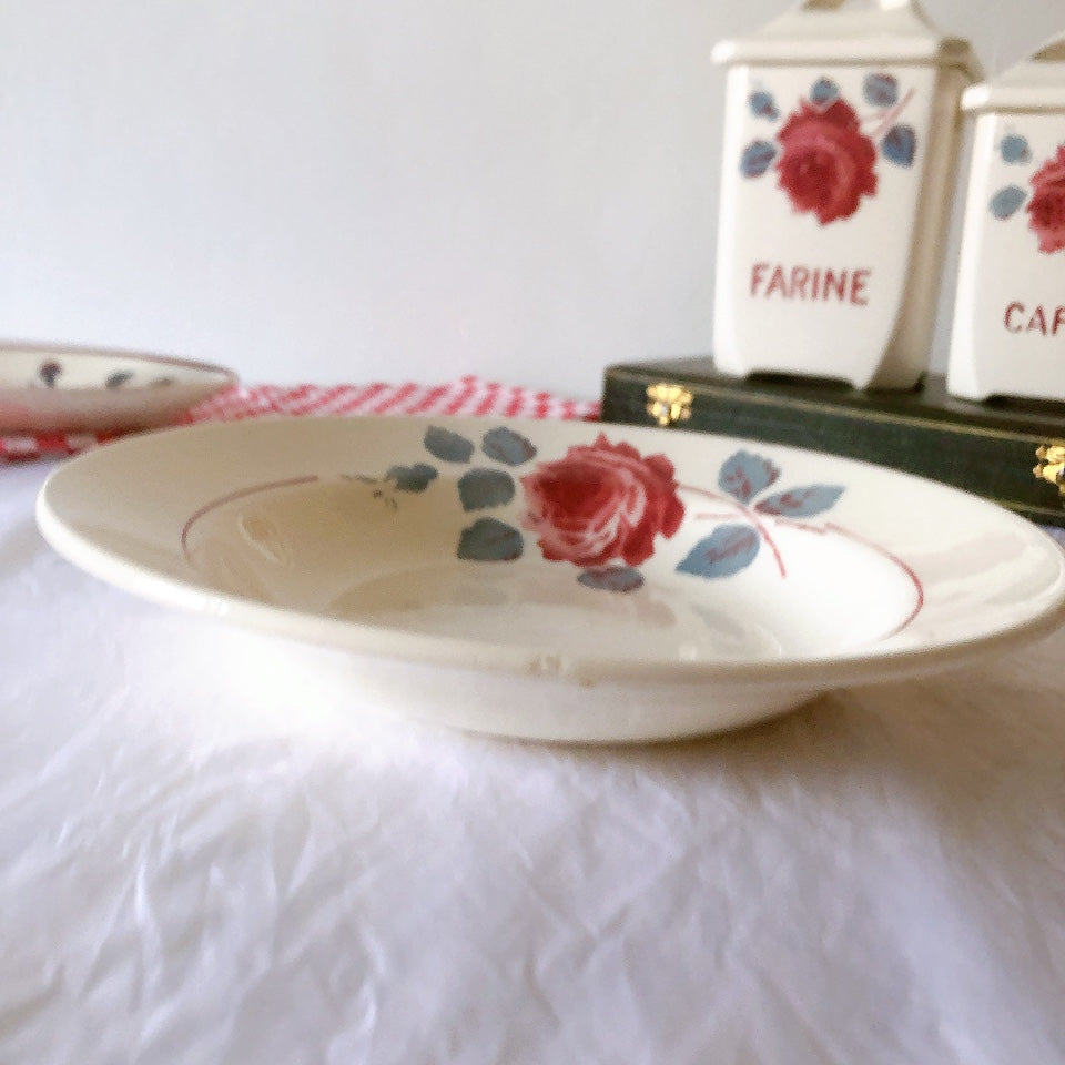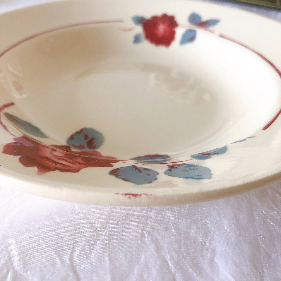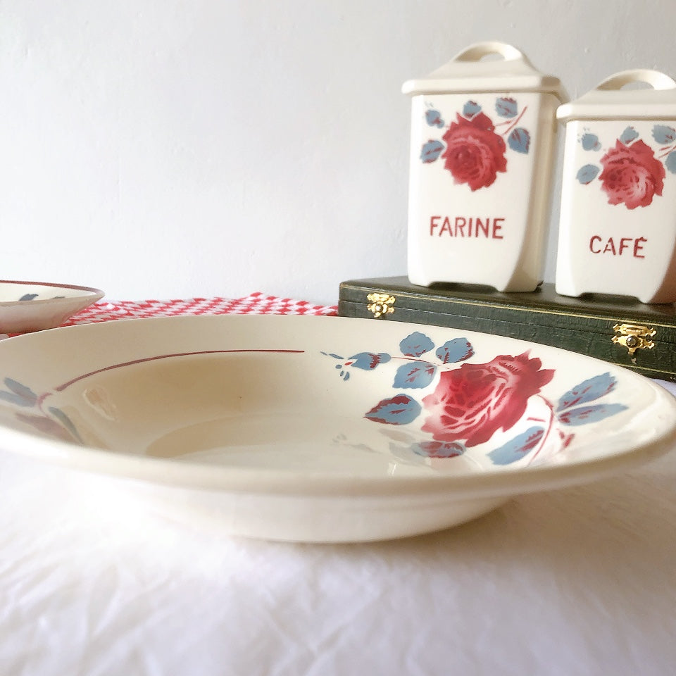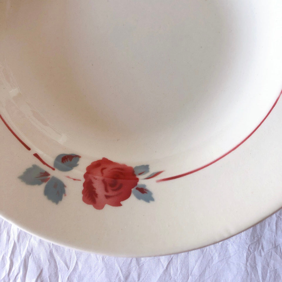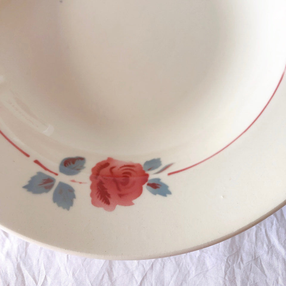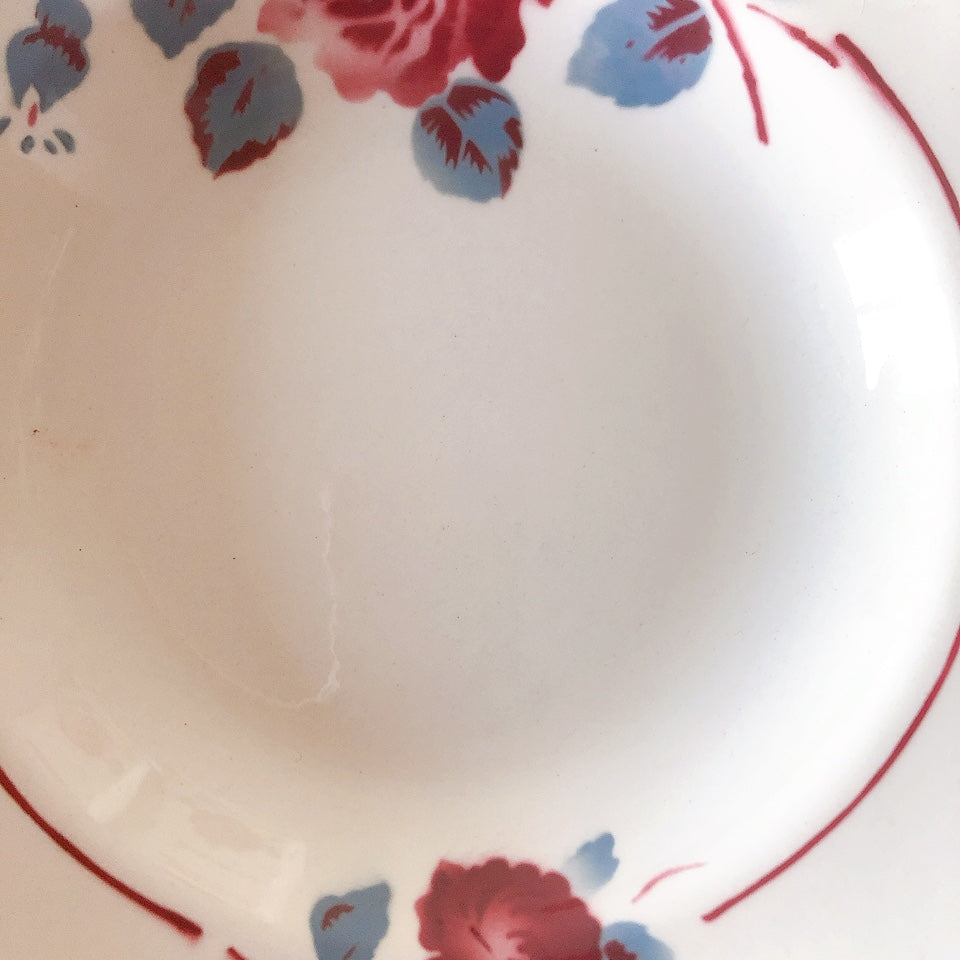 フランスアンティーク バドンヴィレーのバラ柄スーププレート、深皿。赤&白&ブルーグレー。