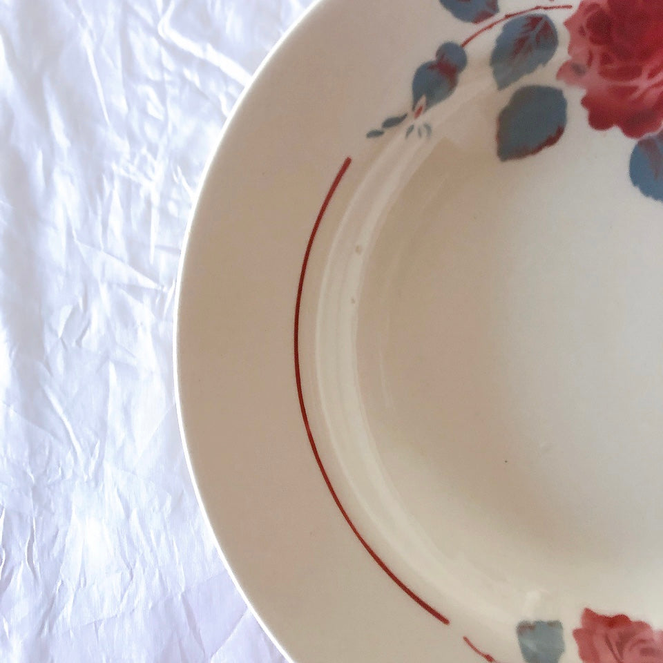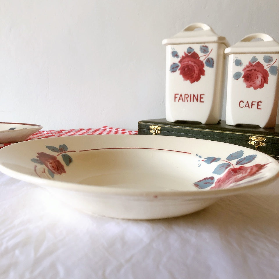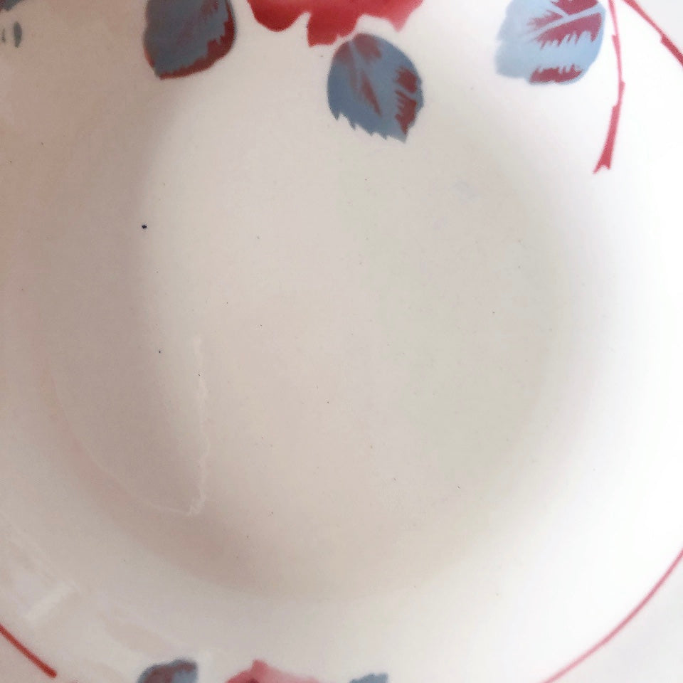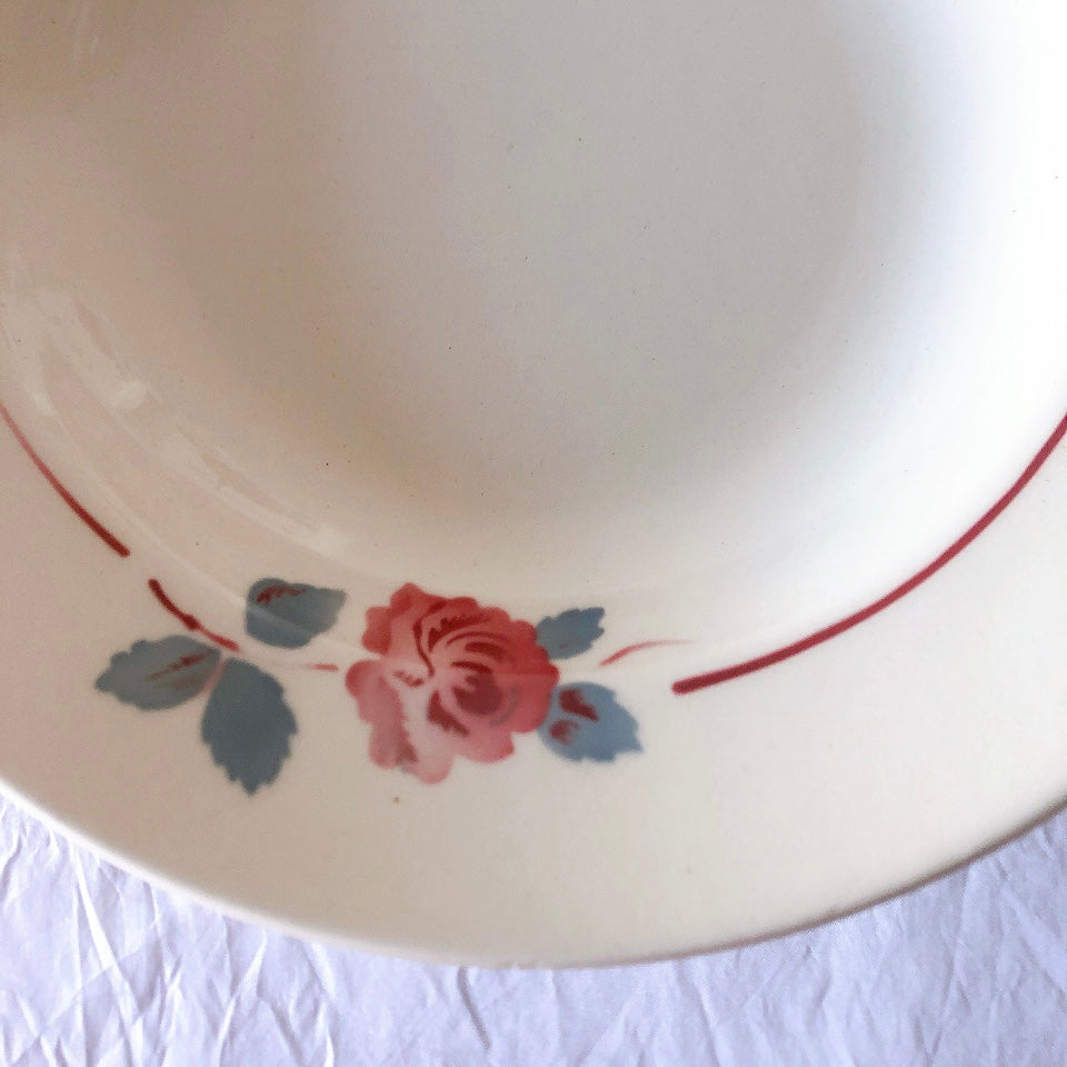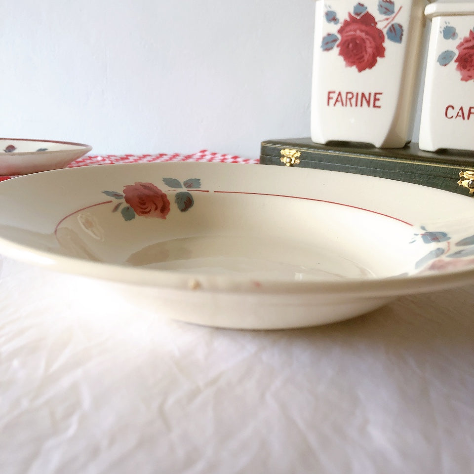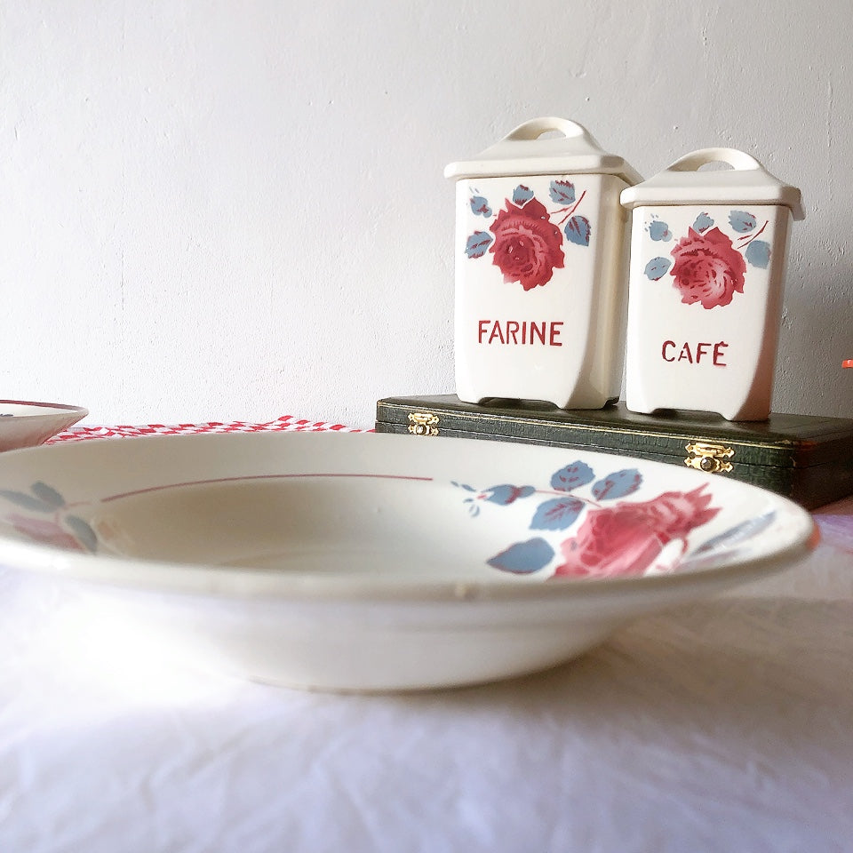 フランスアンティーク バドンヴィレーのバラ柄スーププレート、深皿。赤&白&ブルーグレー。