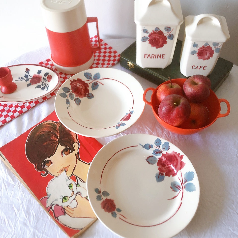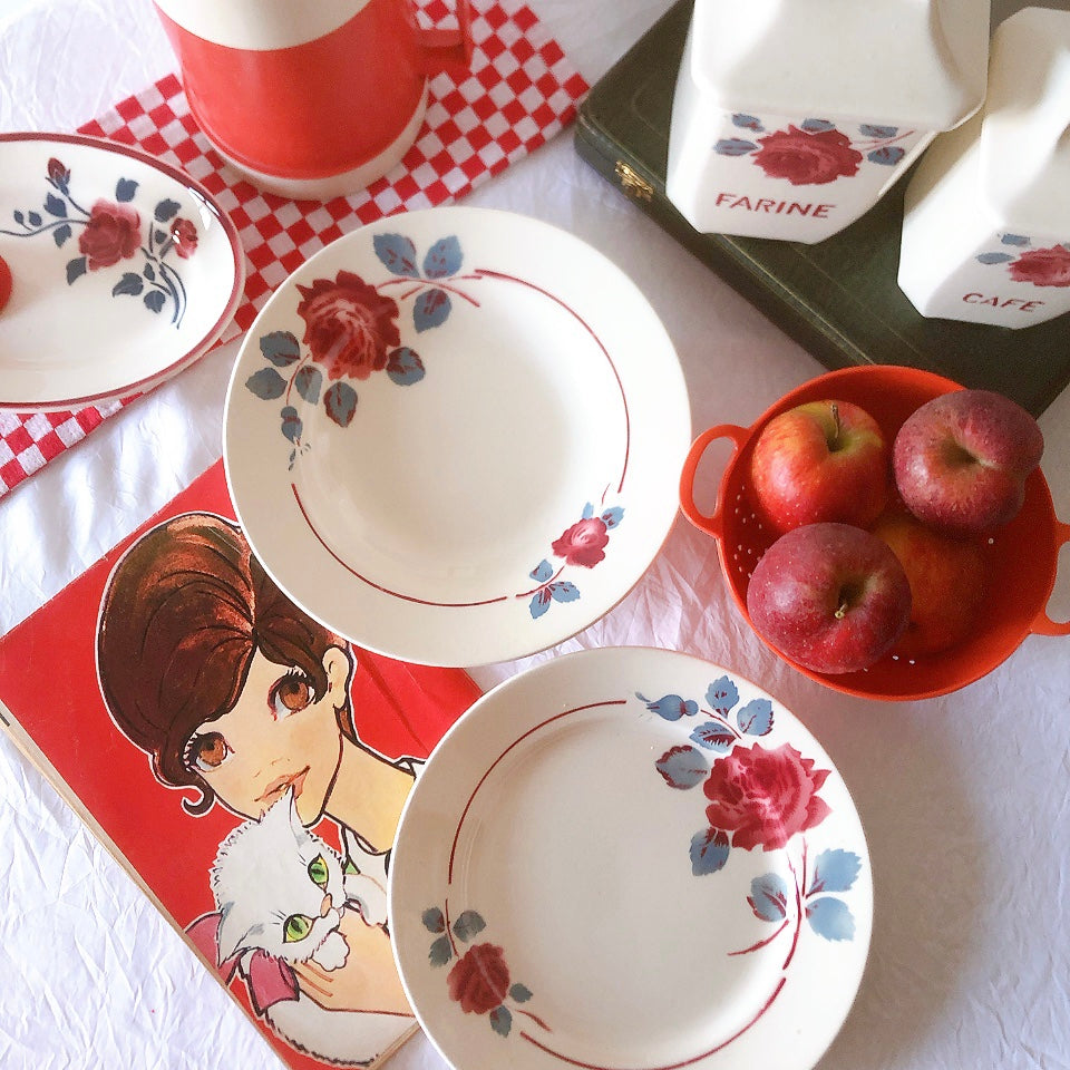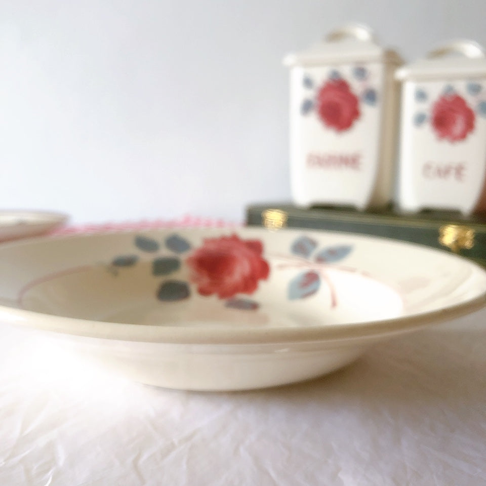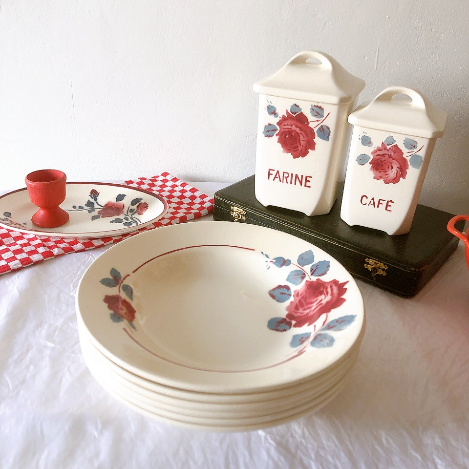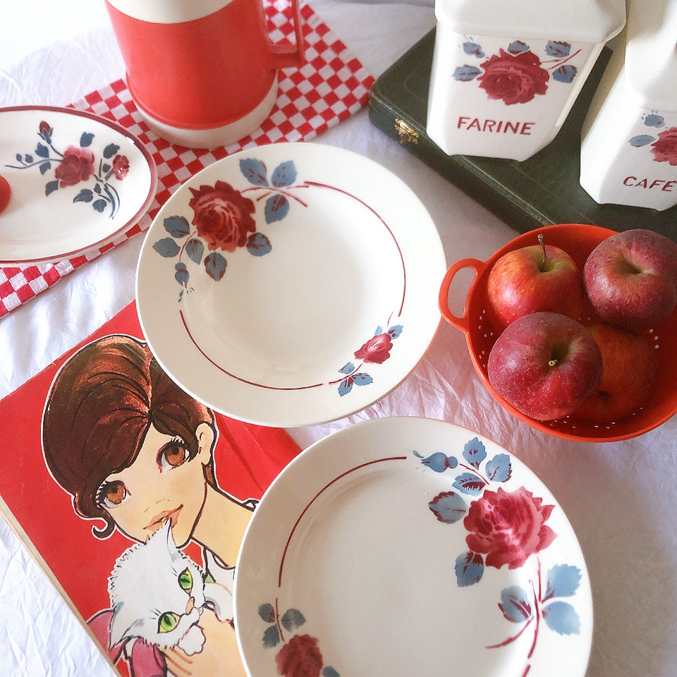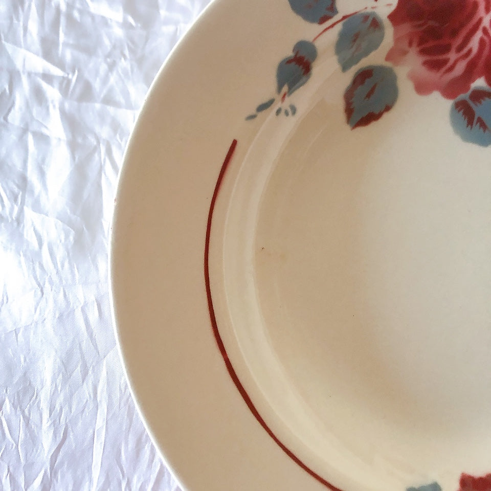 フランスアンティーク バドンヴィレーのバラ柄スーププレート、深皿。赤&白&ブルーグレー。