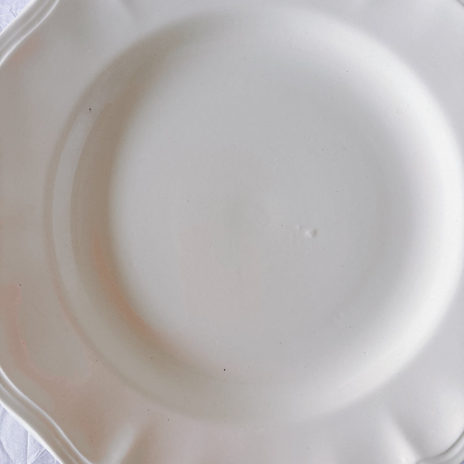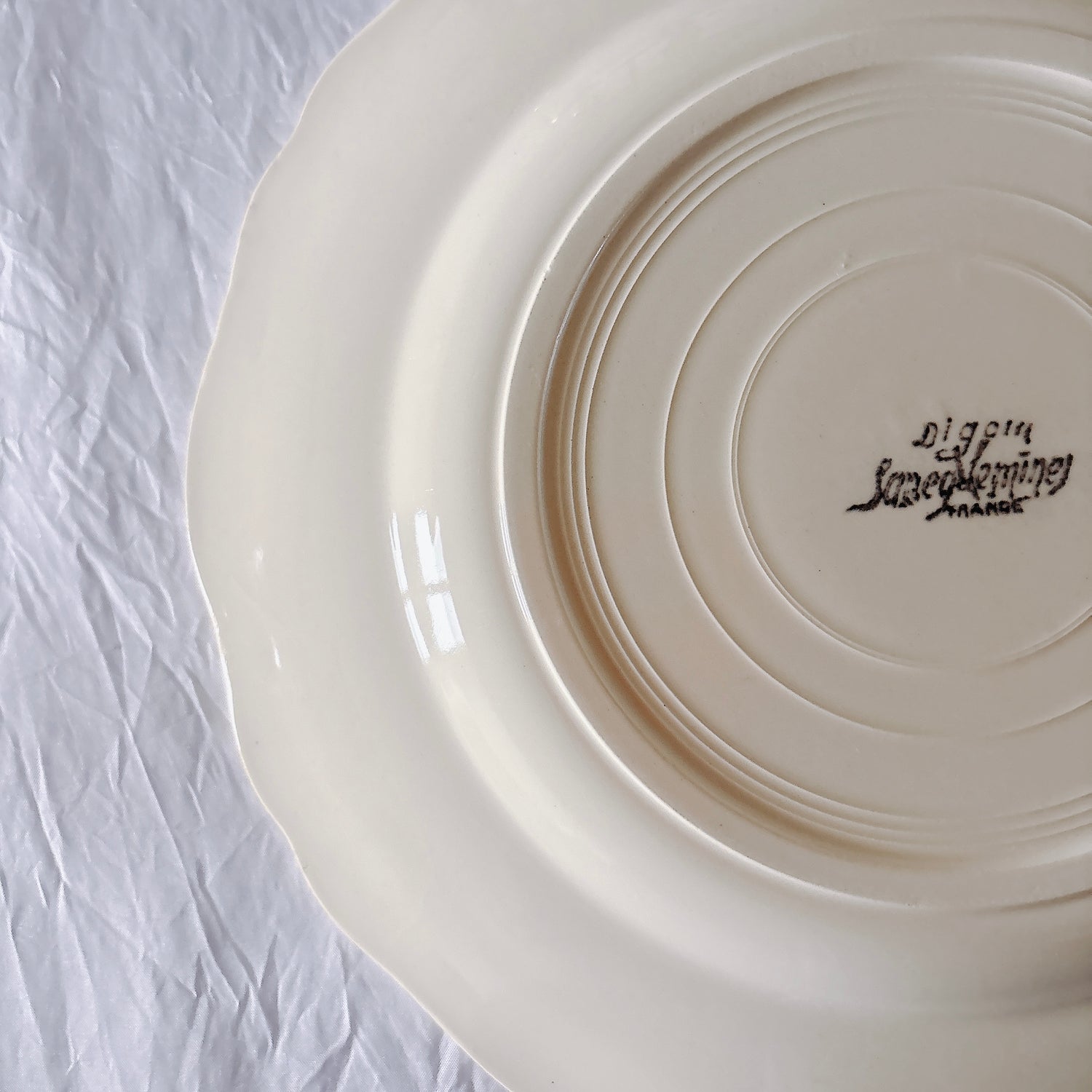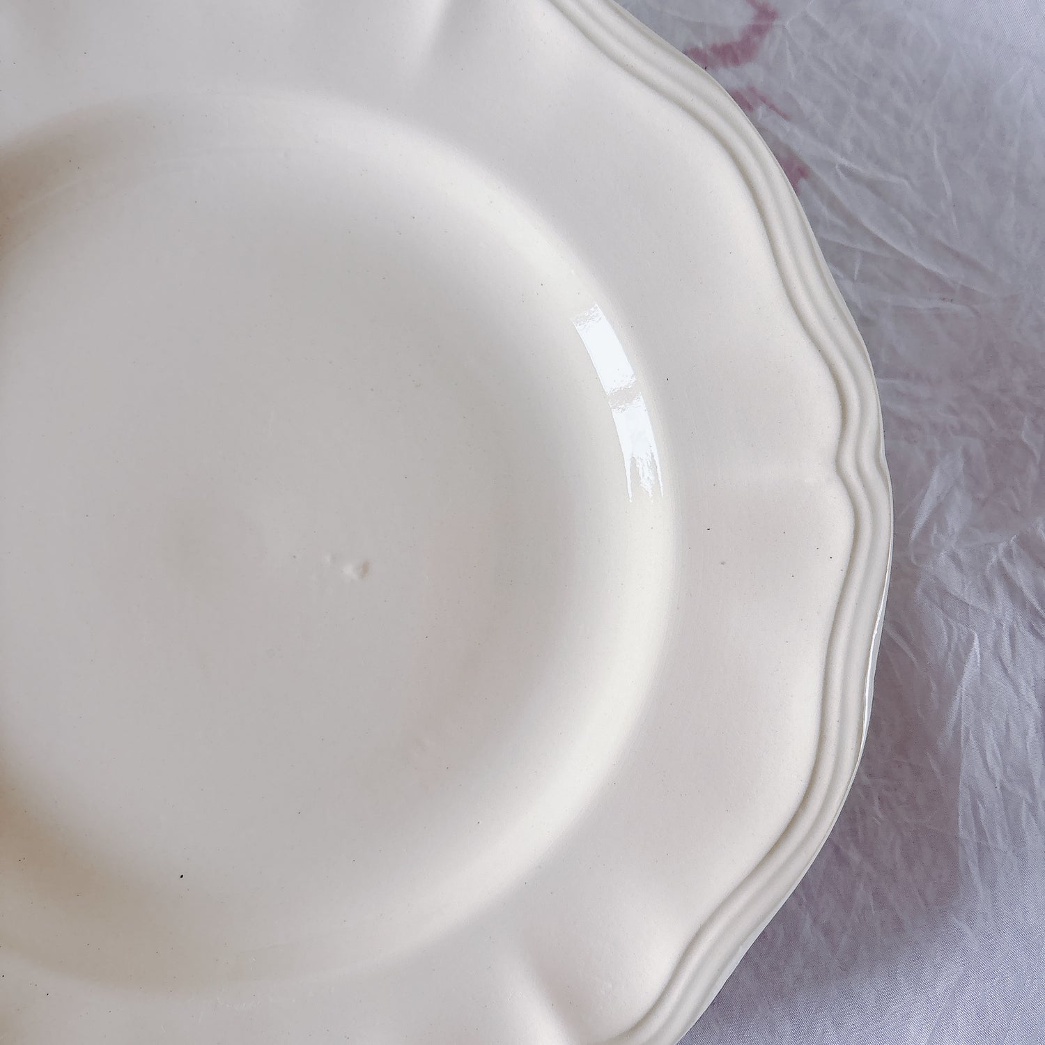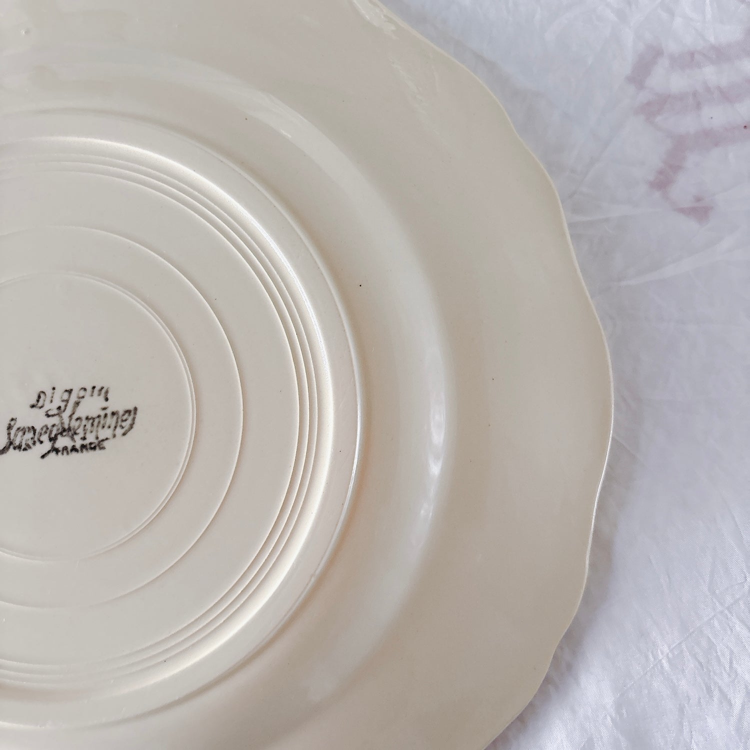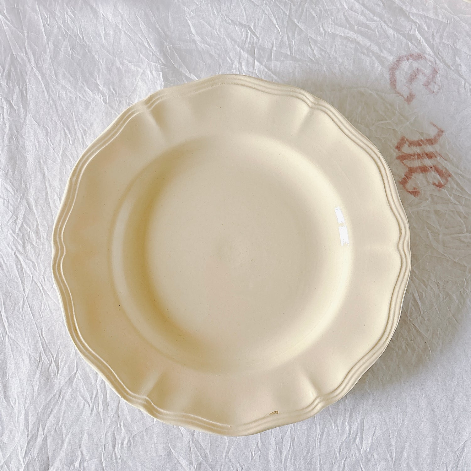 サルグミンヌ窯の大人気・定番シリーズ。美しいレリーフ、アイボリーカラー。シンプルかつ優雅で、多くの人に愛されている花リムシリーズのディナープレート、平皿です。