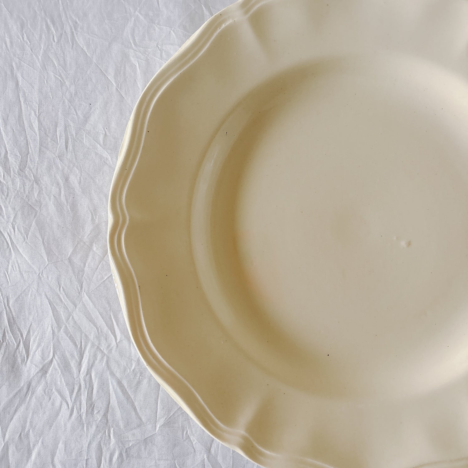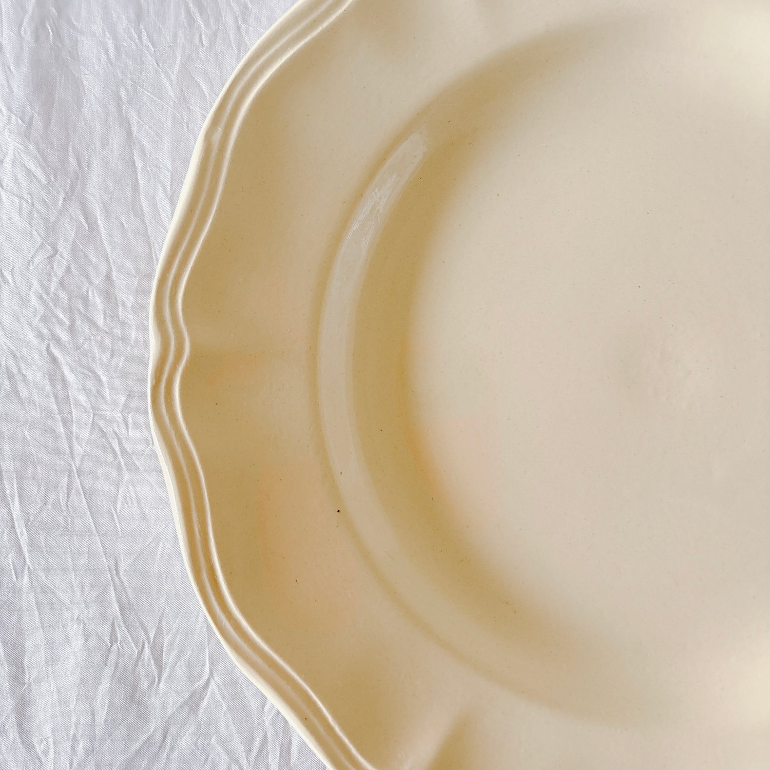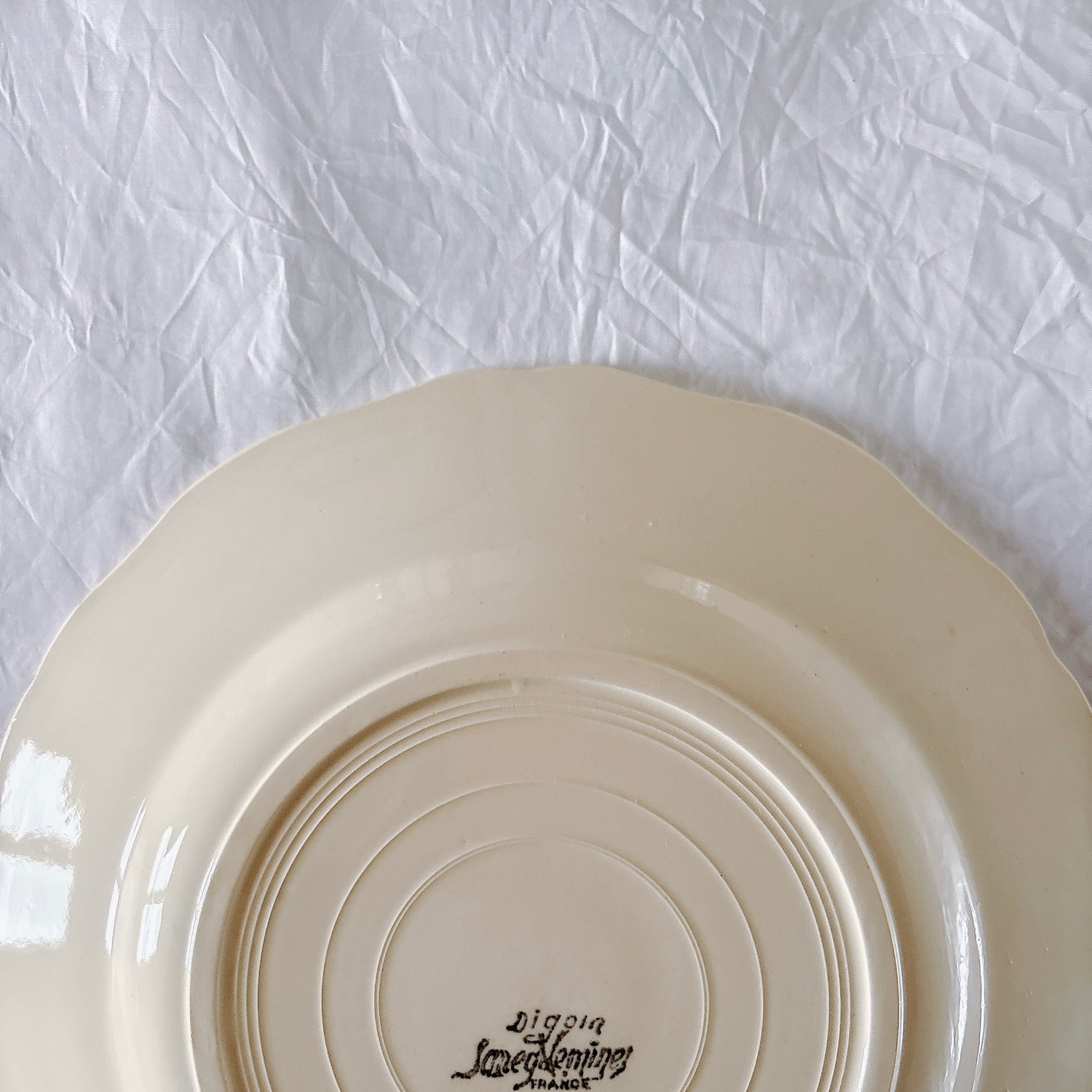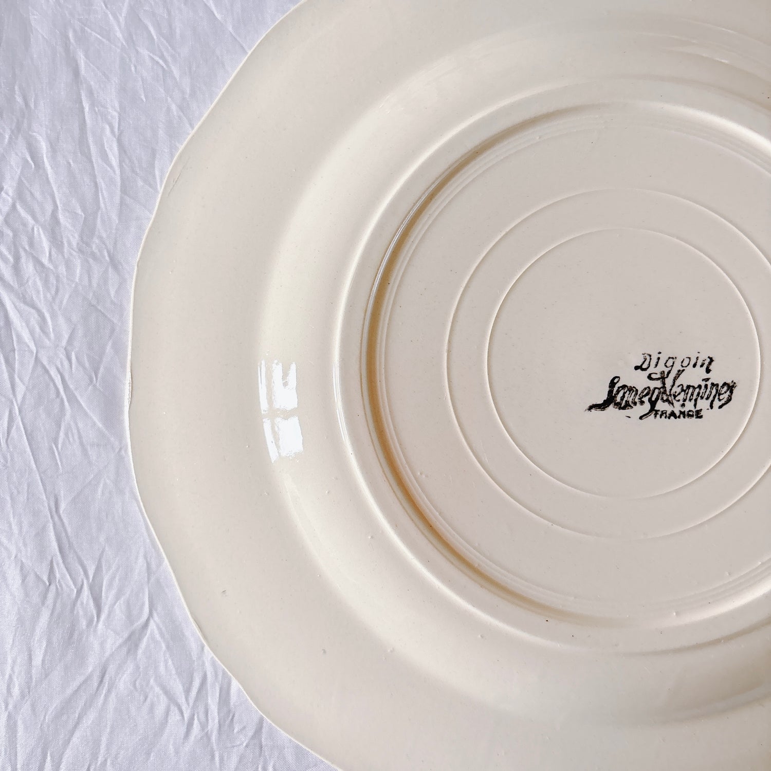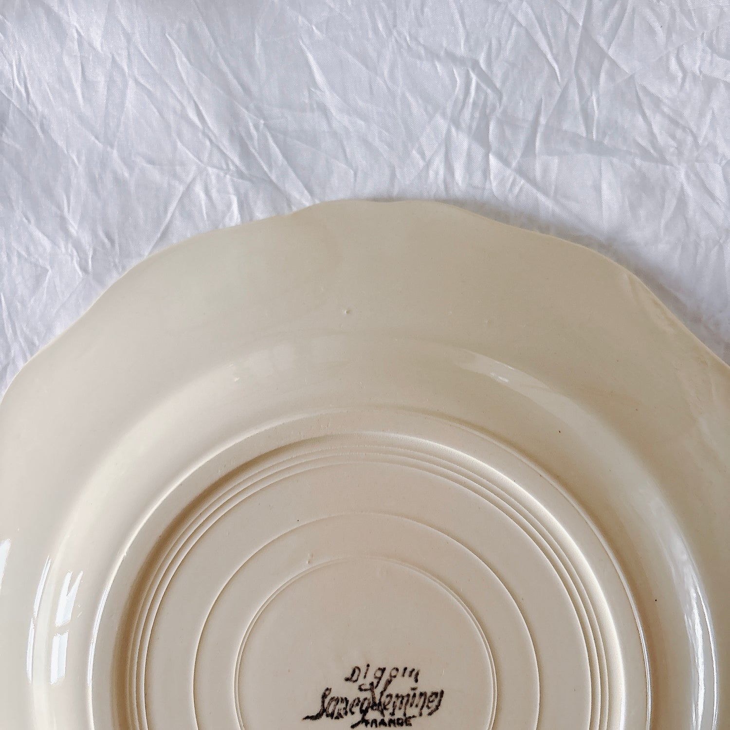 サルグミンヌ窯の大人気・定番シリーズ。美しいレリーフ、アイボリーカラー。シンプルかつ優雅で、多くの人に愛されている花リムシリーズのディナープレート、平皿です。