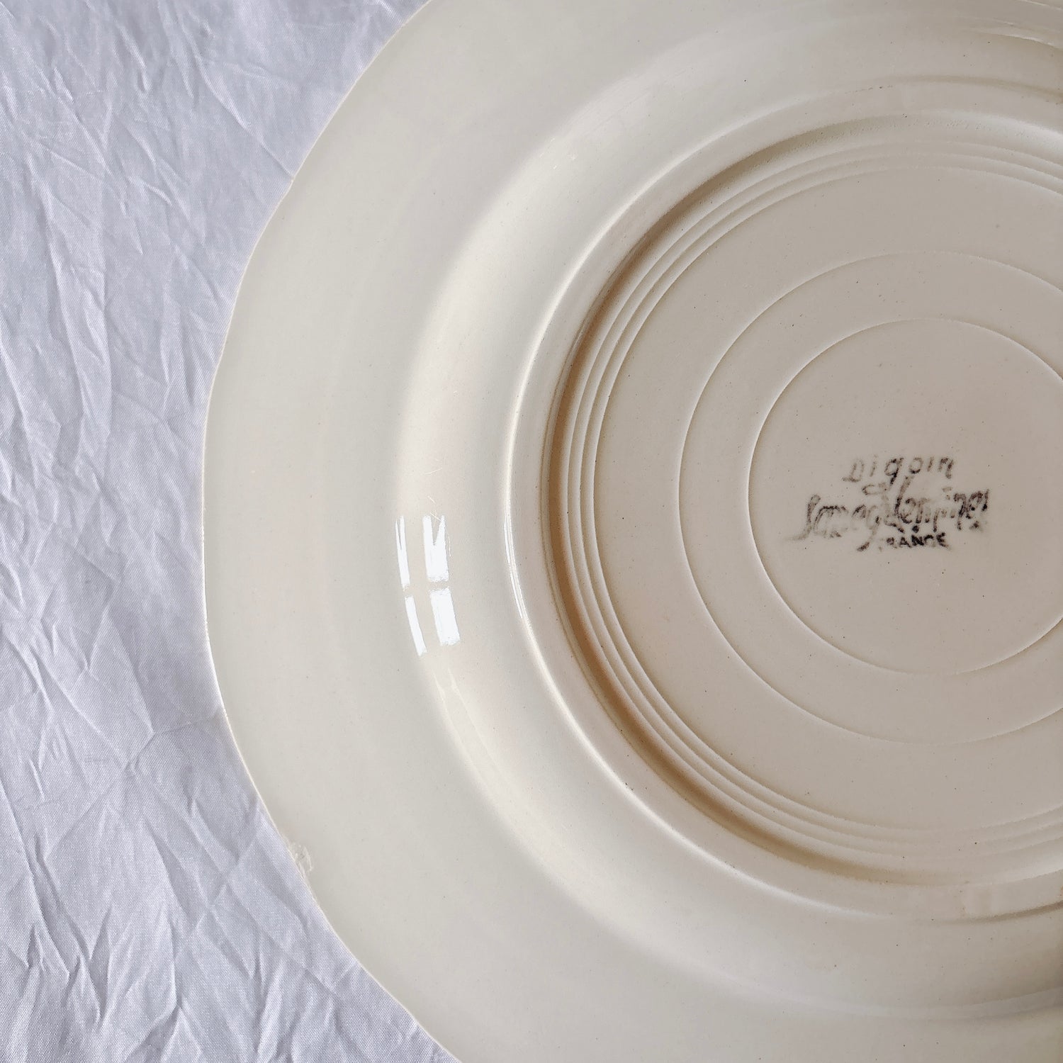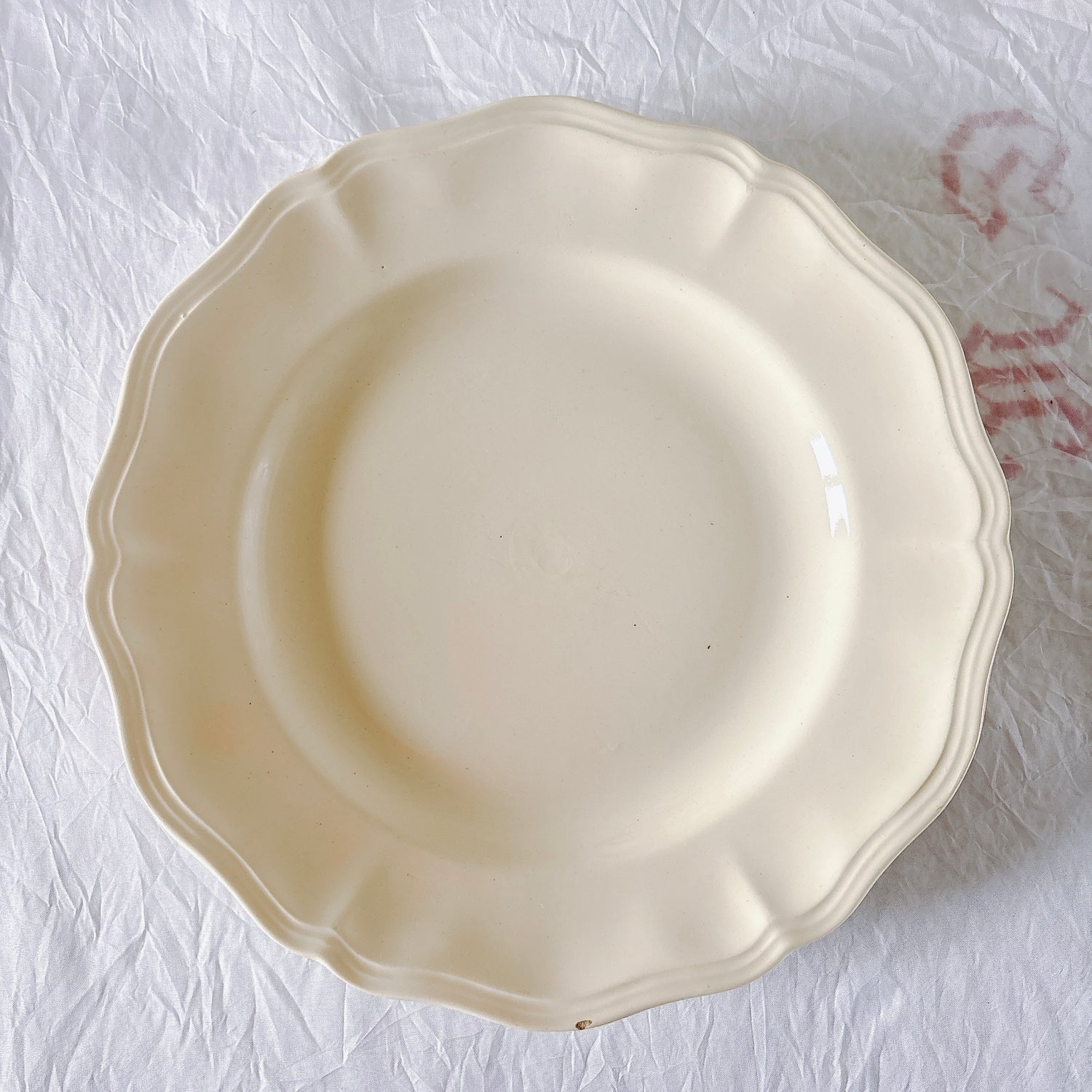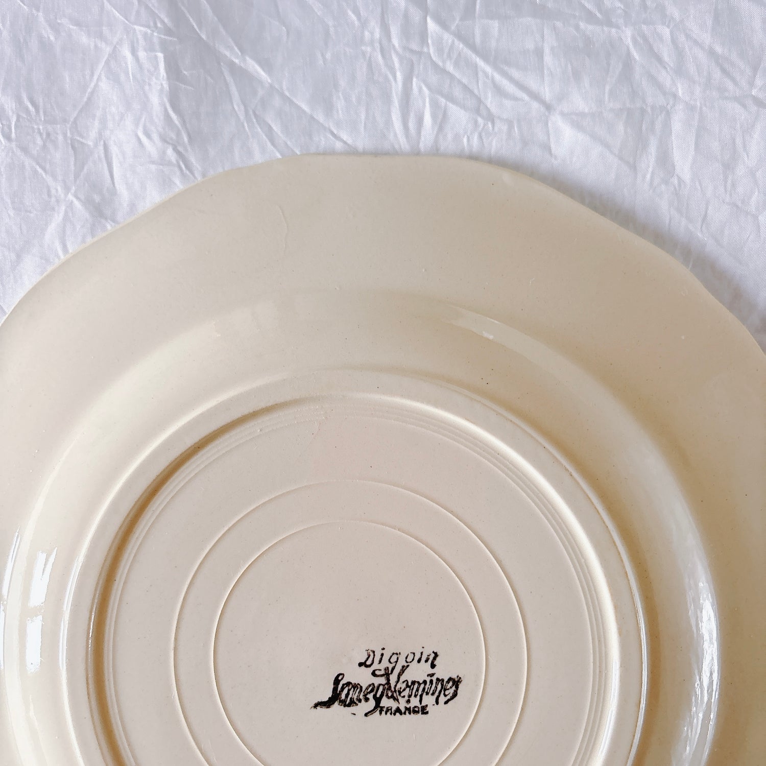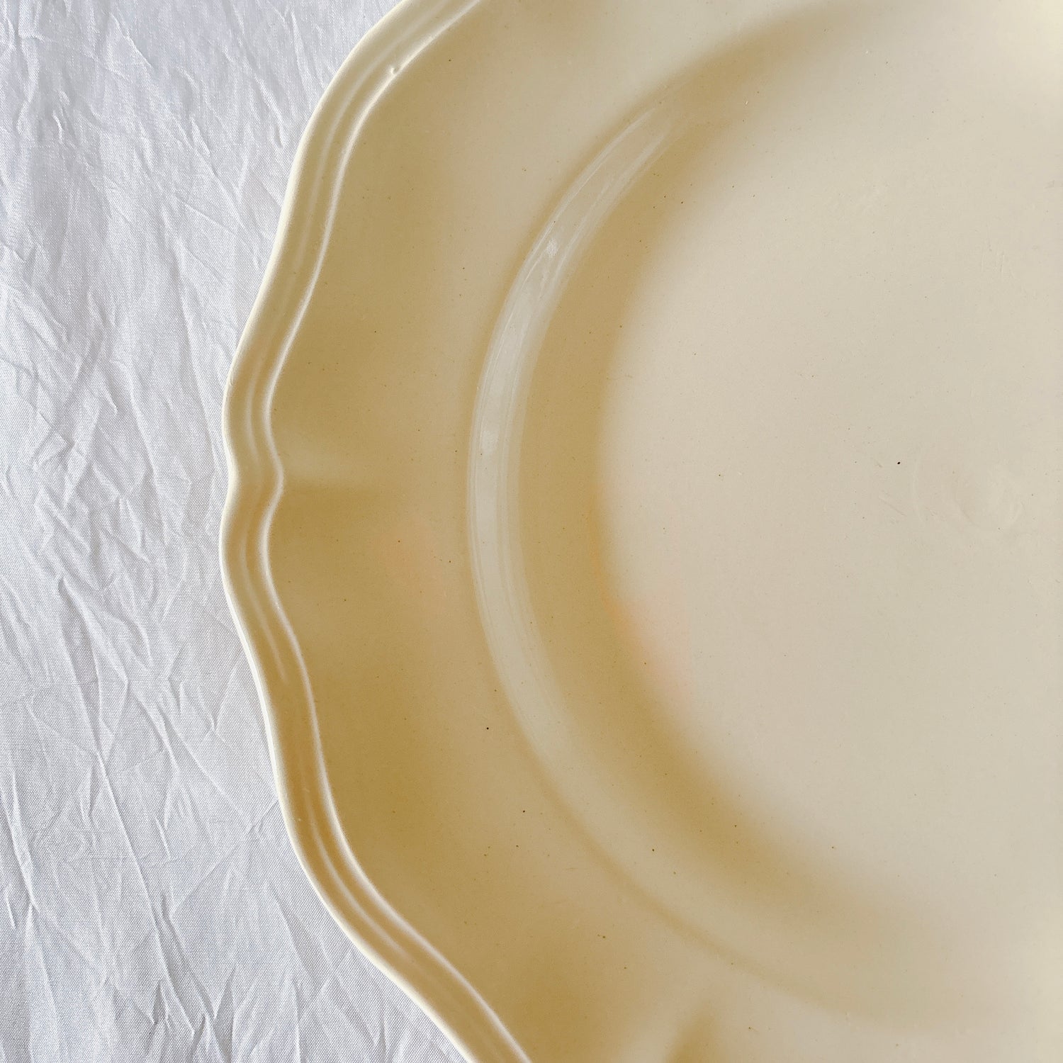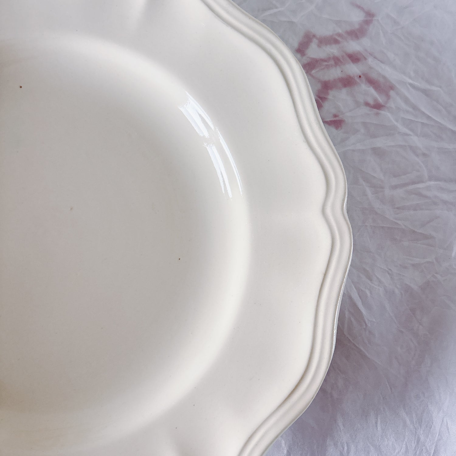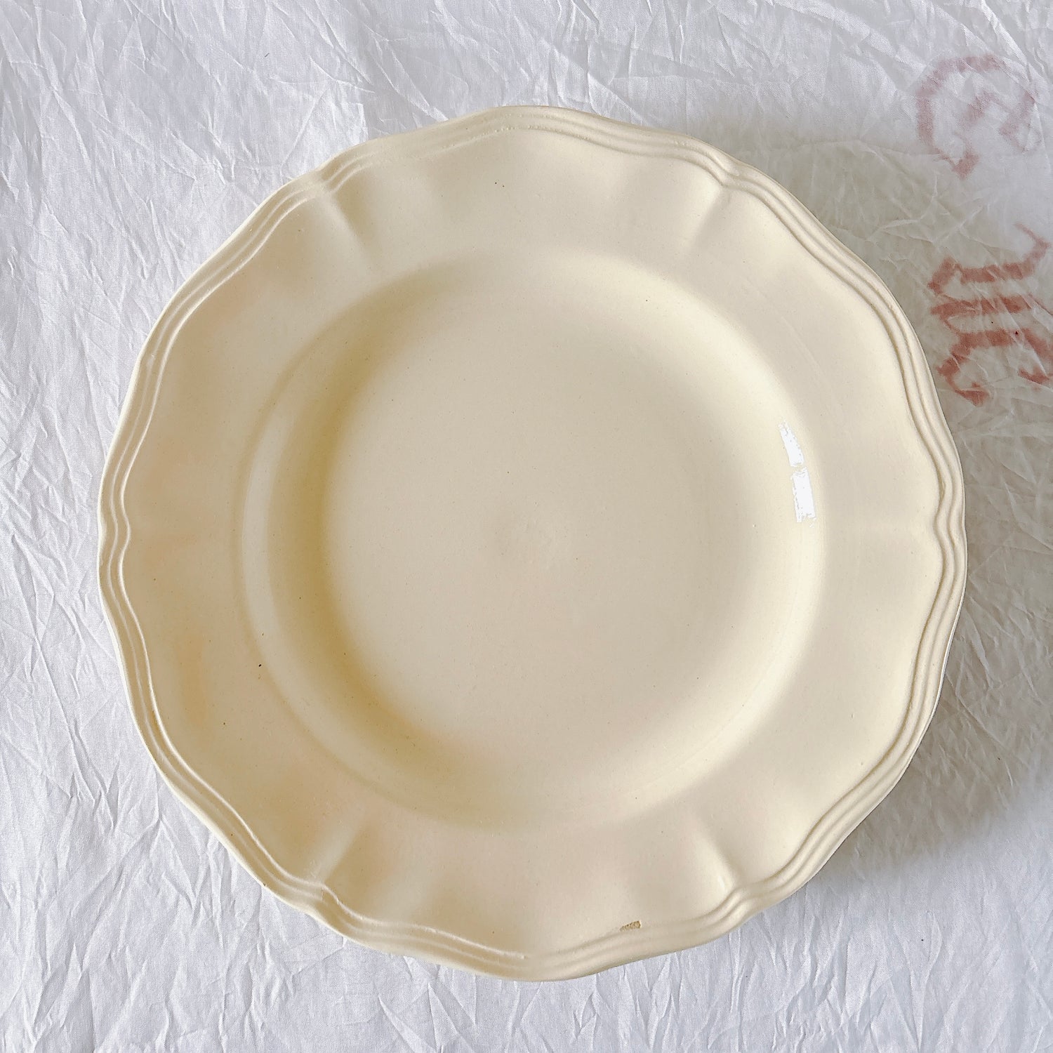 サルグミンヌ窯の大人気・定番シリーズ。美しいレリーフ、アイボリーカラー。シンプルかつ優雅で、多くの人に愛されている花リムシリーズのディナープレート、平皿です。