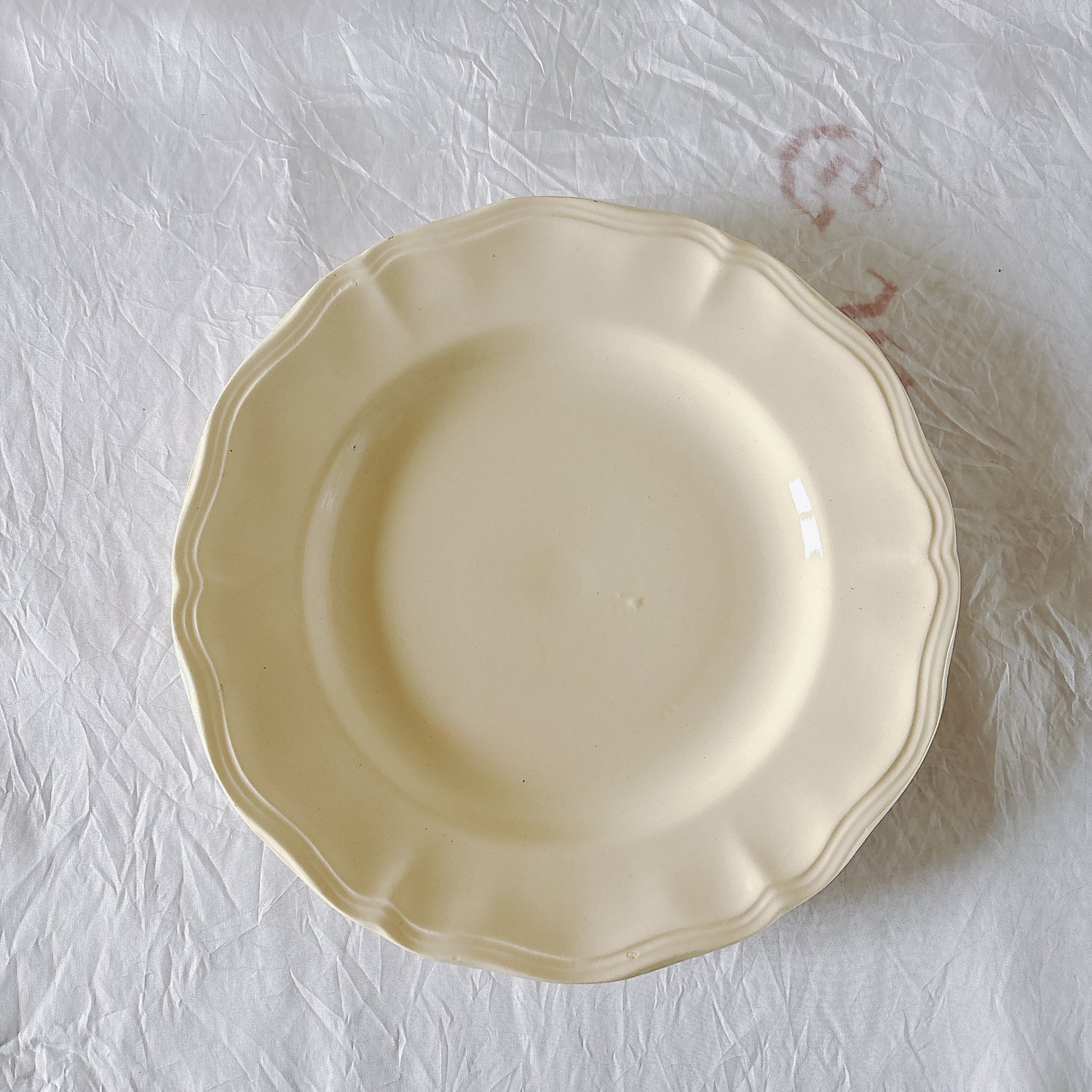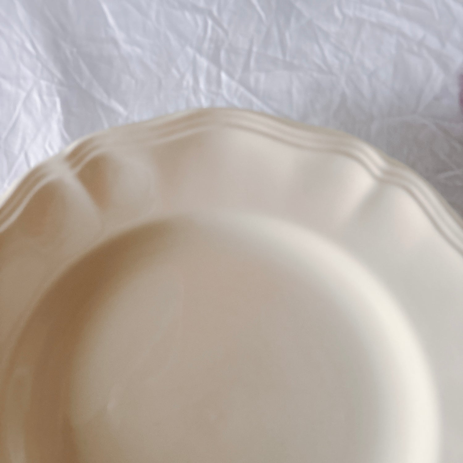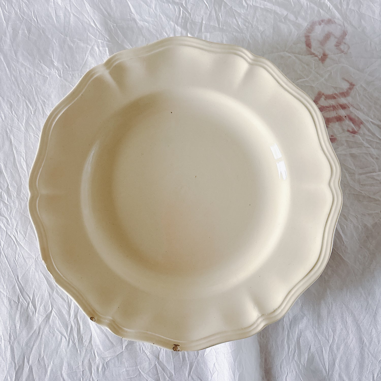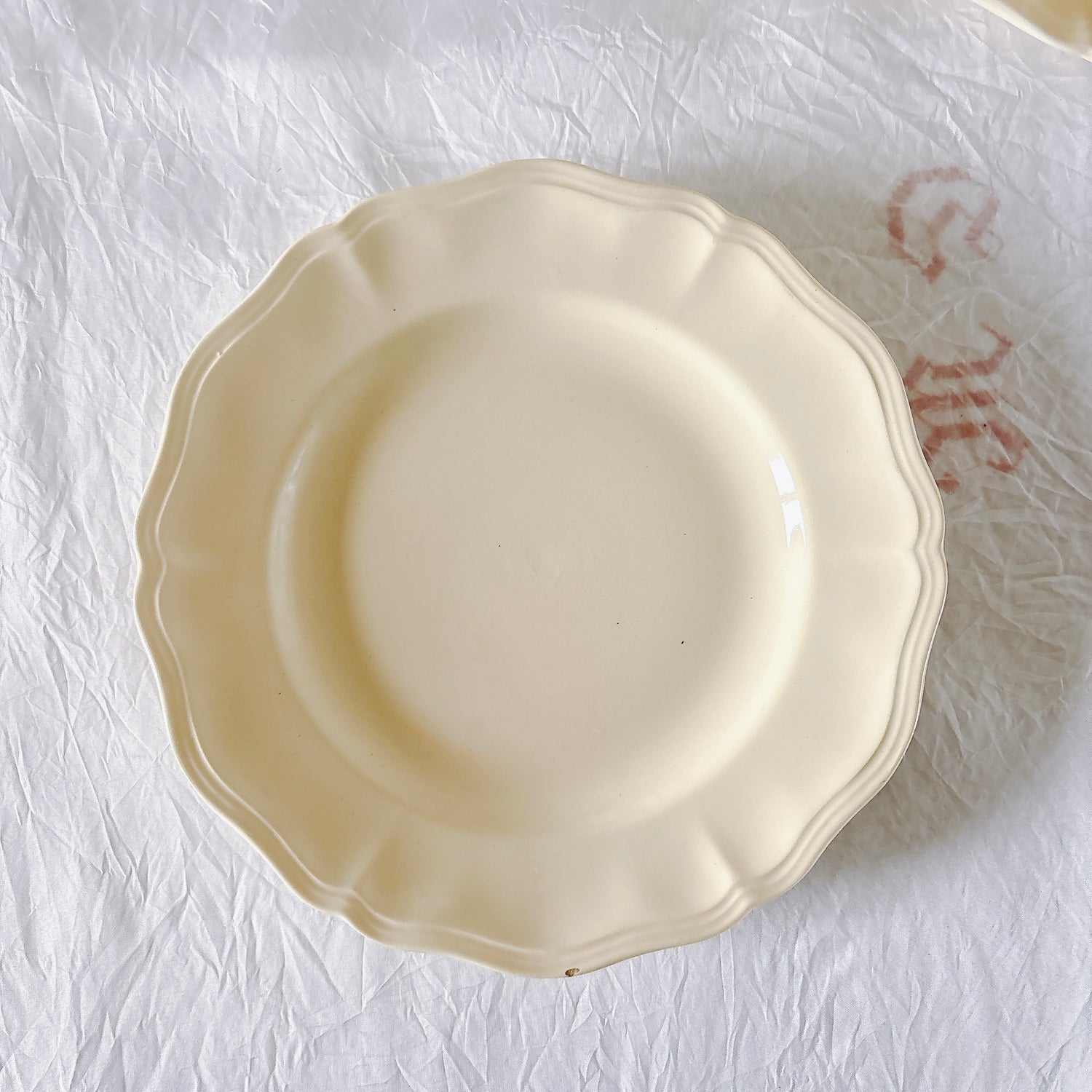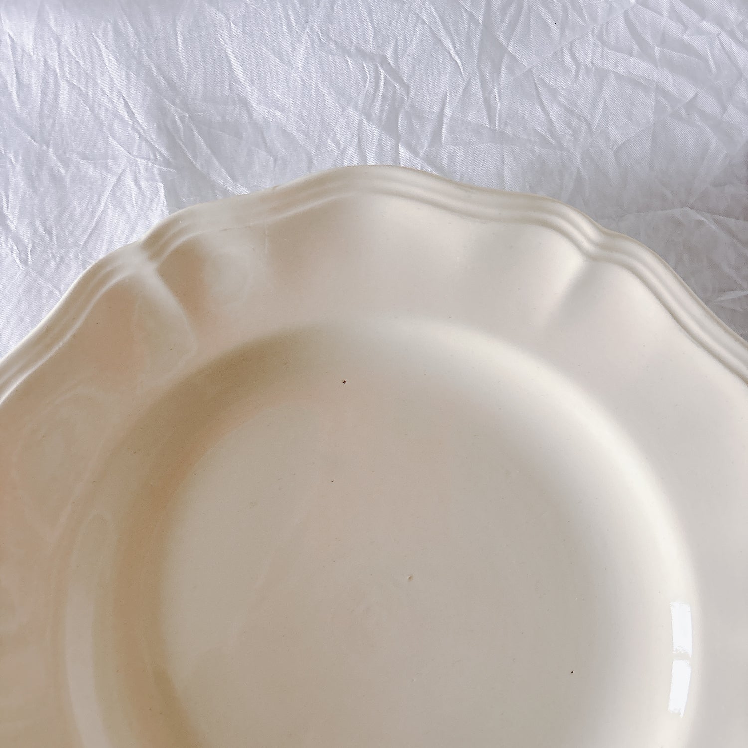 サルグミンヌ窯の大人気・定番シリーズ。美しいレリーフ、アイボリーカラー。シンプルかつ優雅で、多くの人に愛されている花リムシリーズのディナープレート、平皿です。