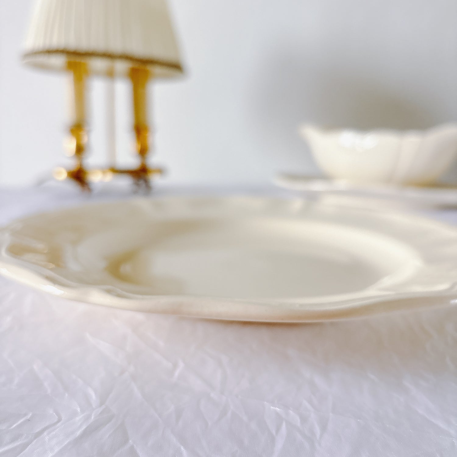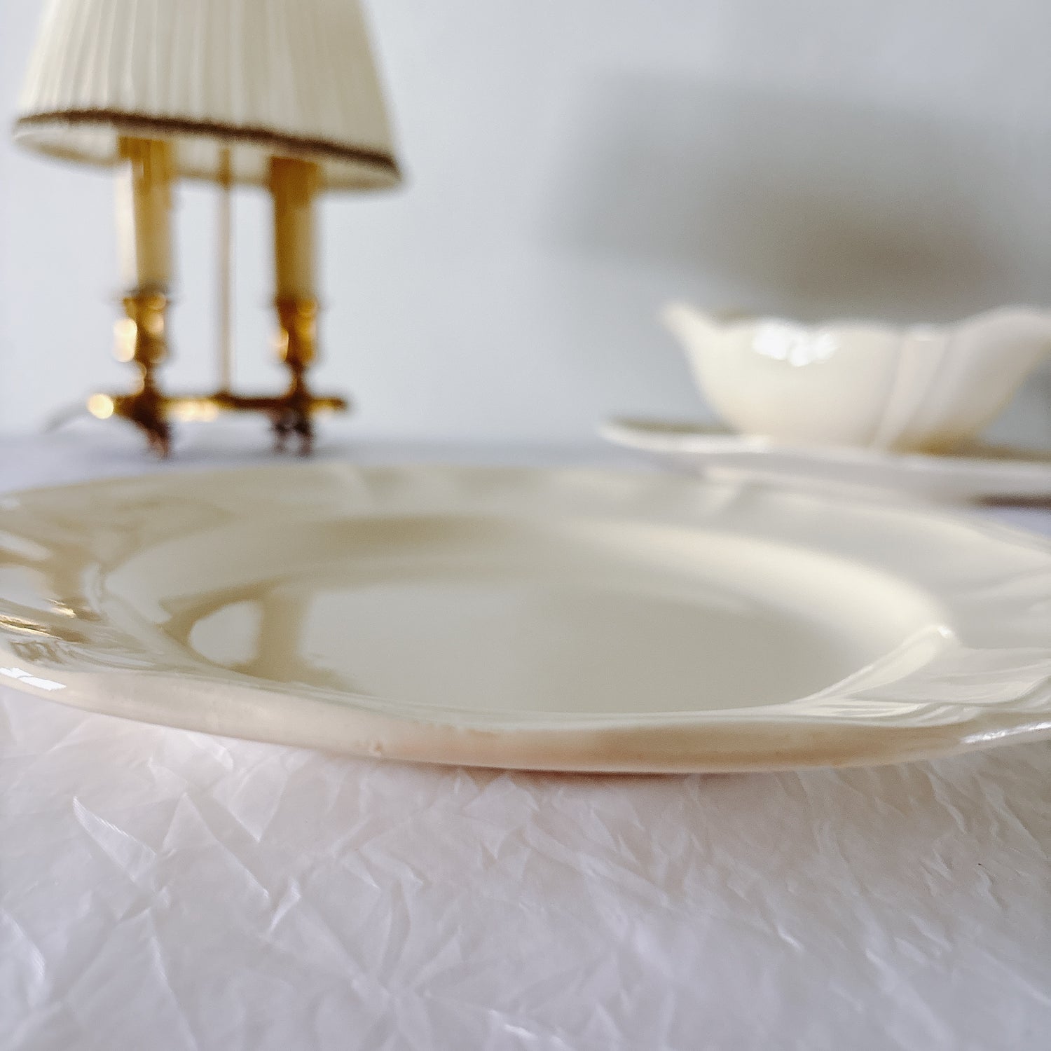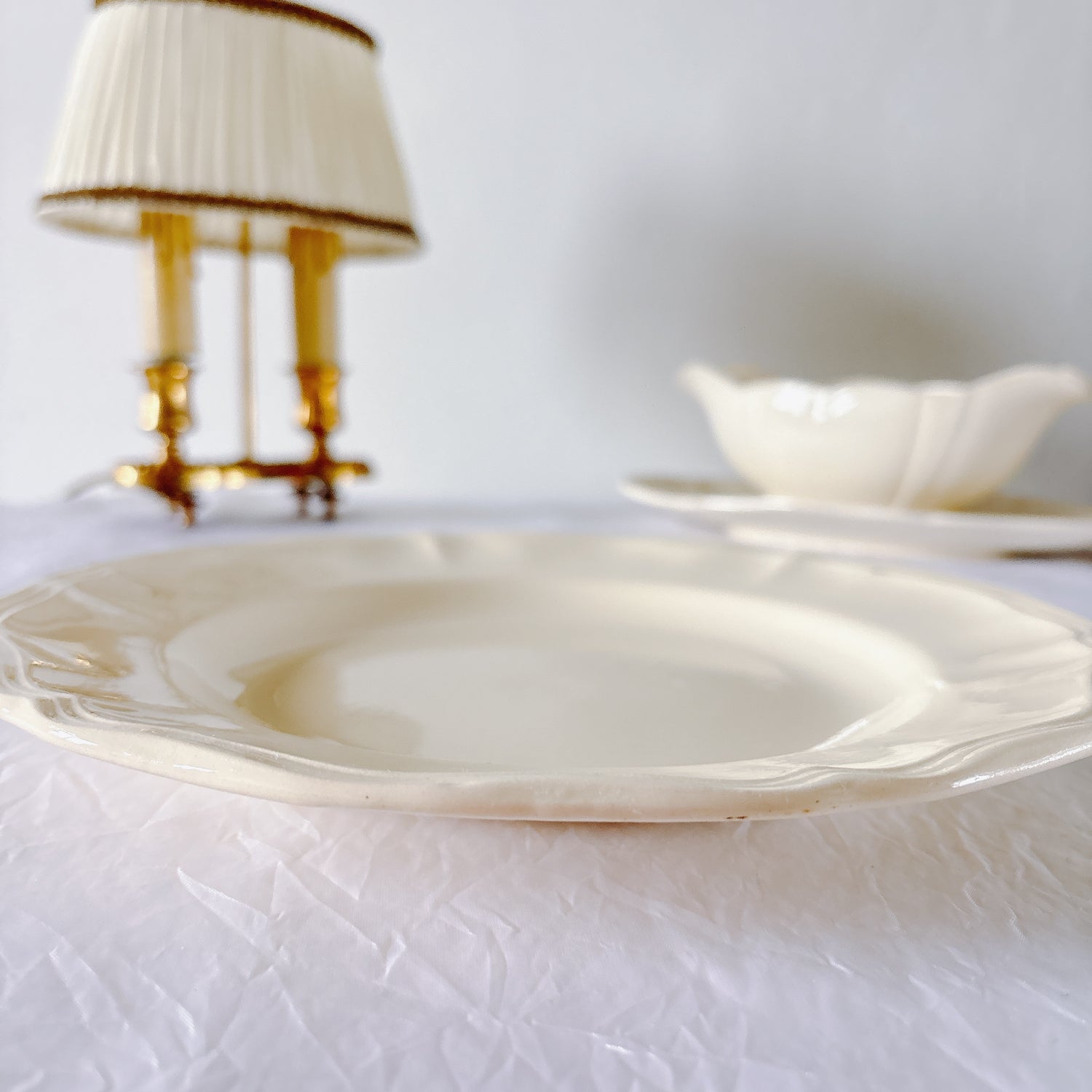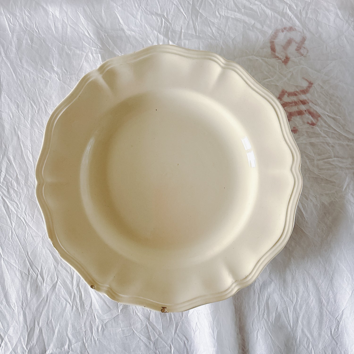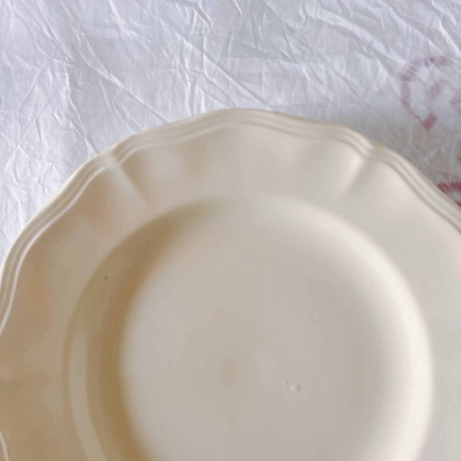 サルグミンヌ窯の大人気・定番シリーズ。美しいレリーフ、アイボリーカラー。シンプルかつ優雅で、多くの人に愛されている花リムシリーズのディナープレート、平皿です。