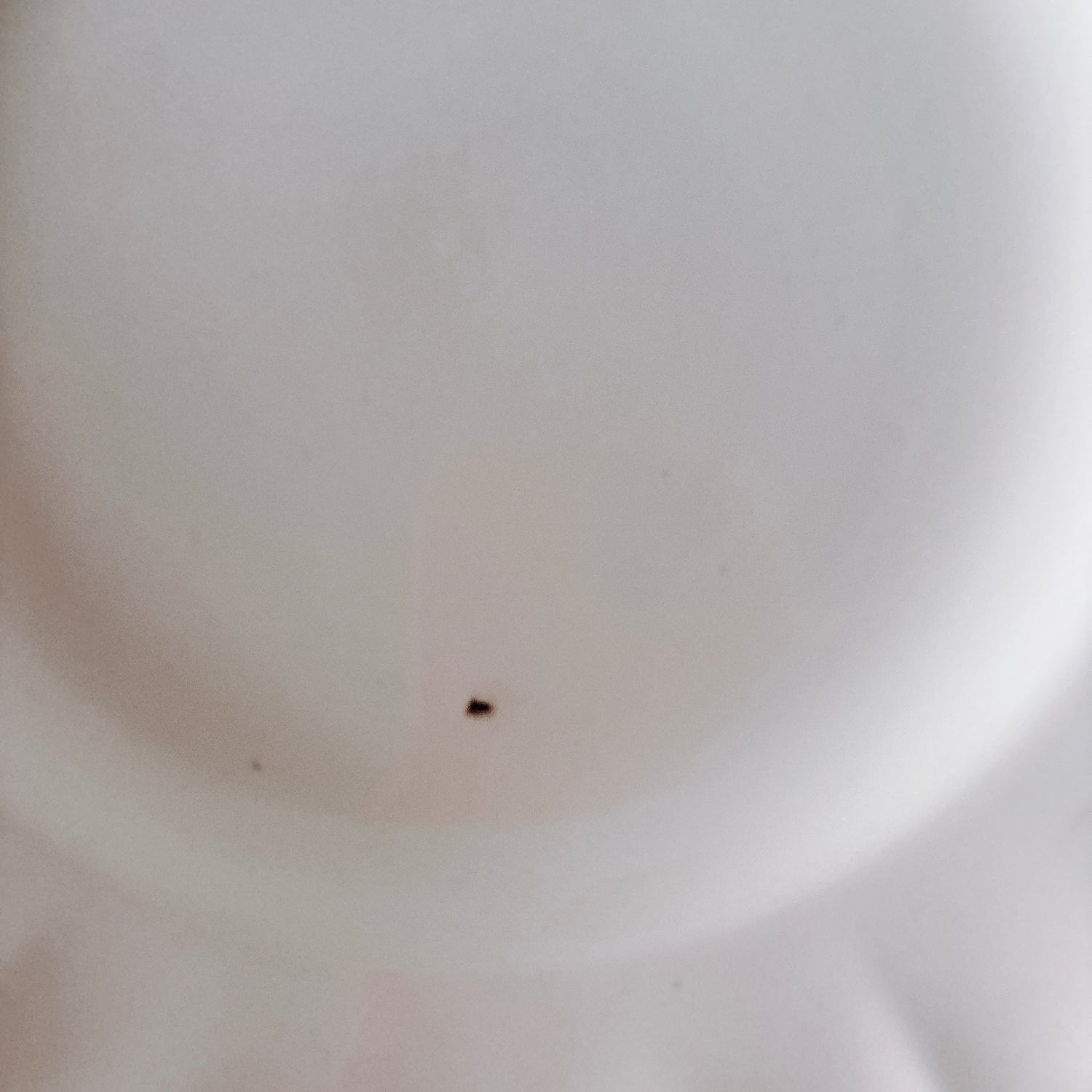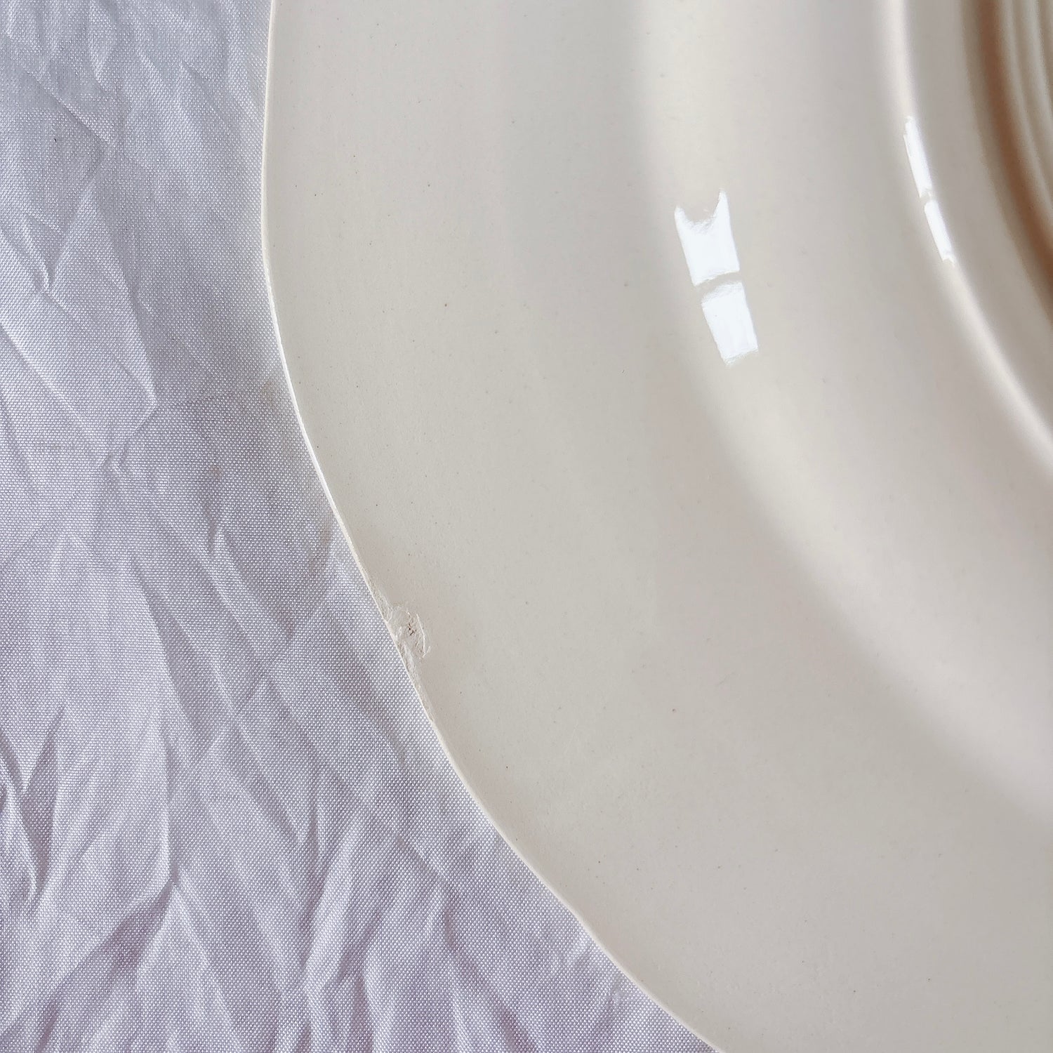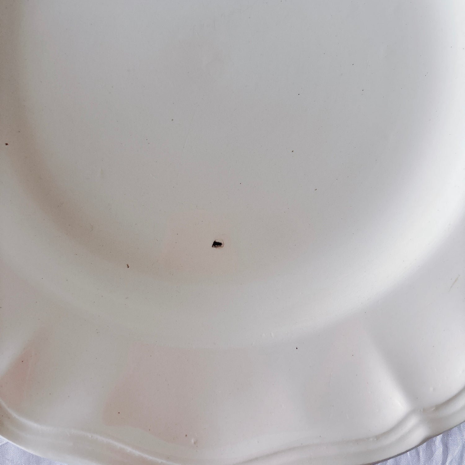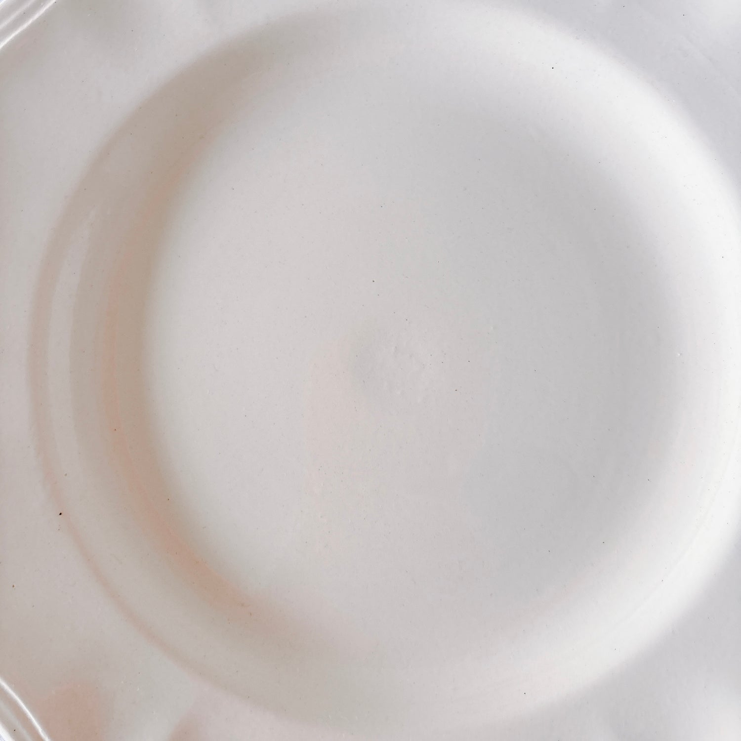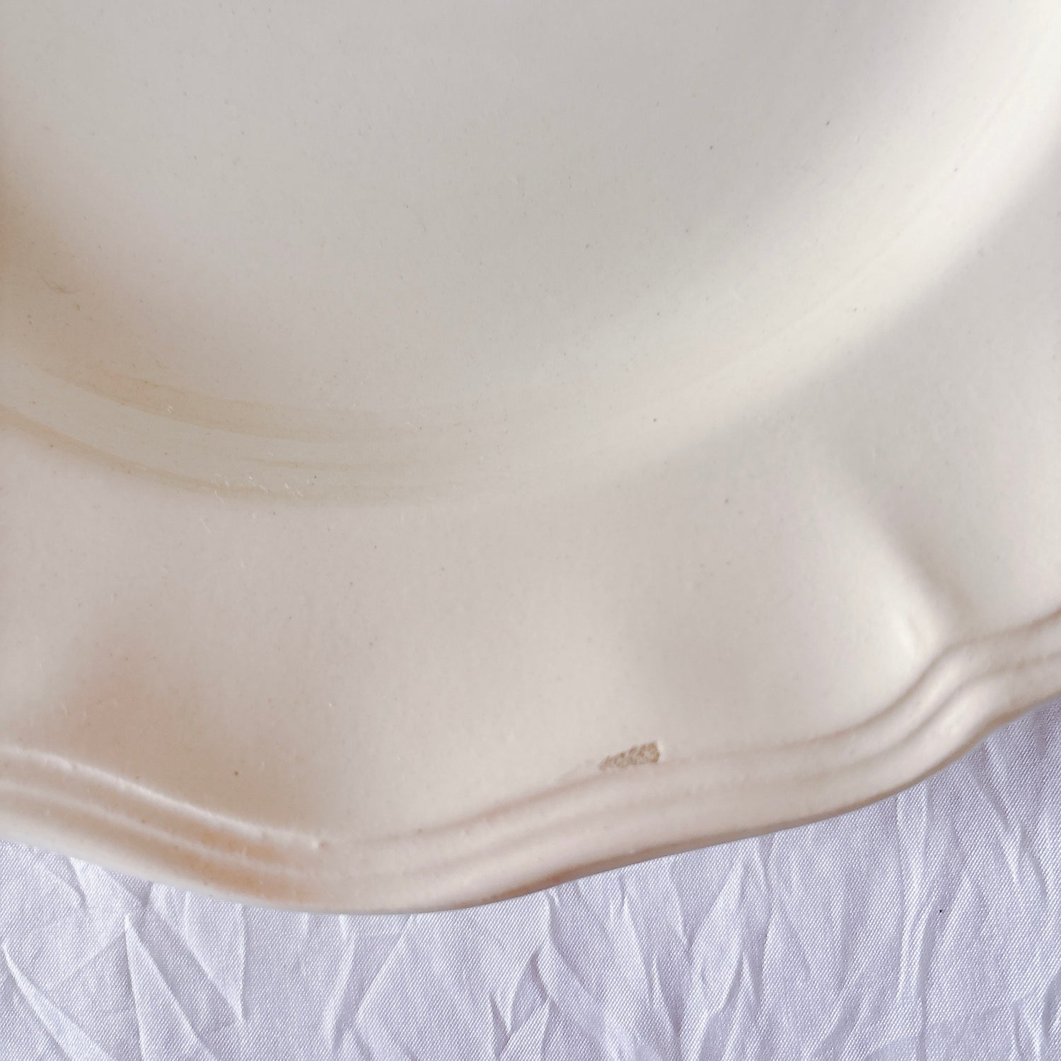 E 写真64-:一か所釉薬のムラ、わずかなカトラリー傷がみられますが、チップもラインもなく全体的に綺麗な状態です。ほぼ使用感はございません。裏側縁に製造時の凹みがみられますが、上から釉薬で仕上げられています。(上からはみえません)