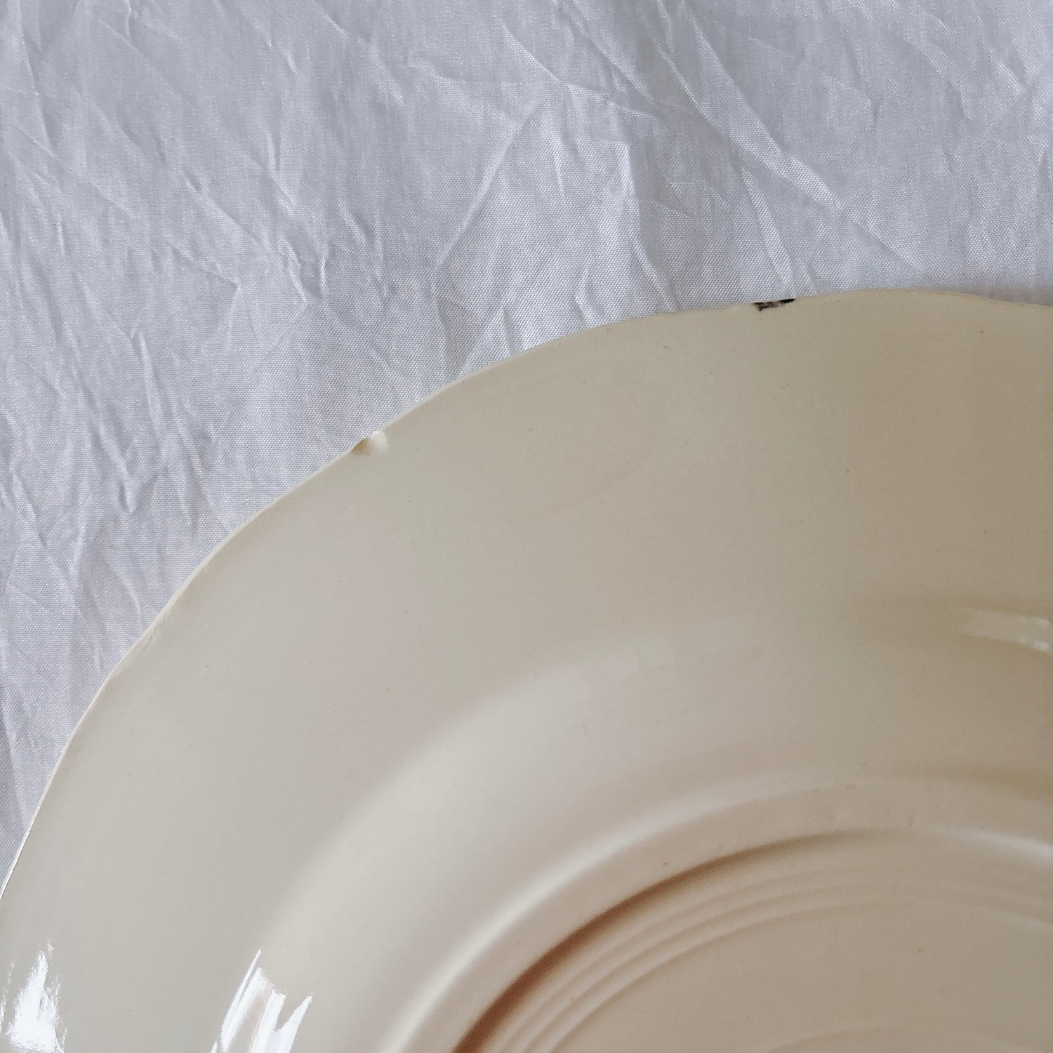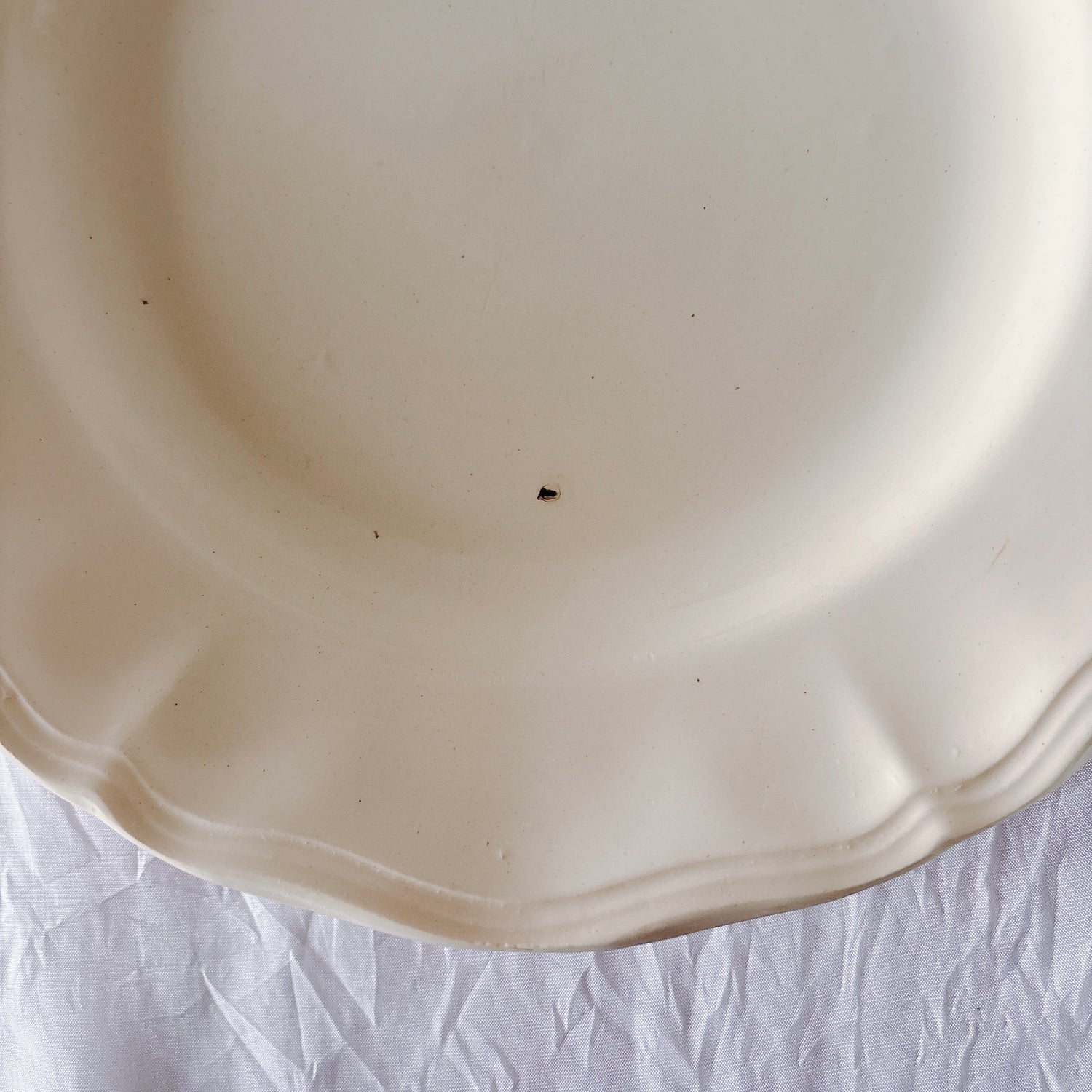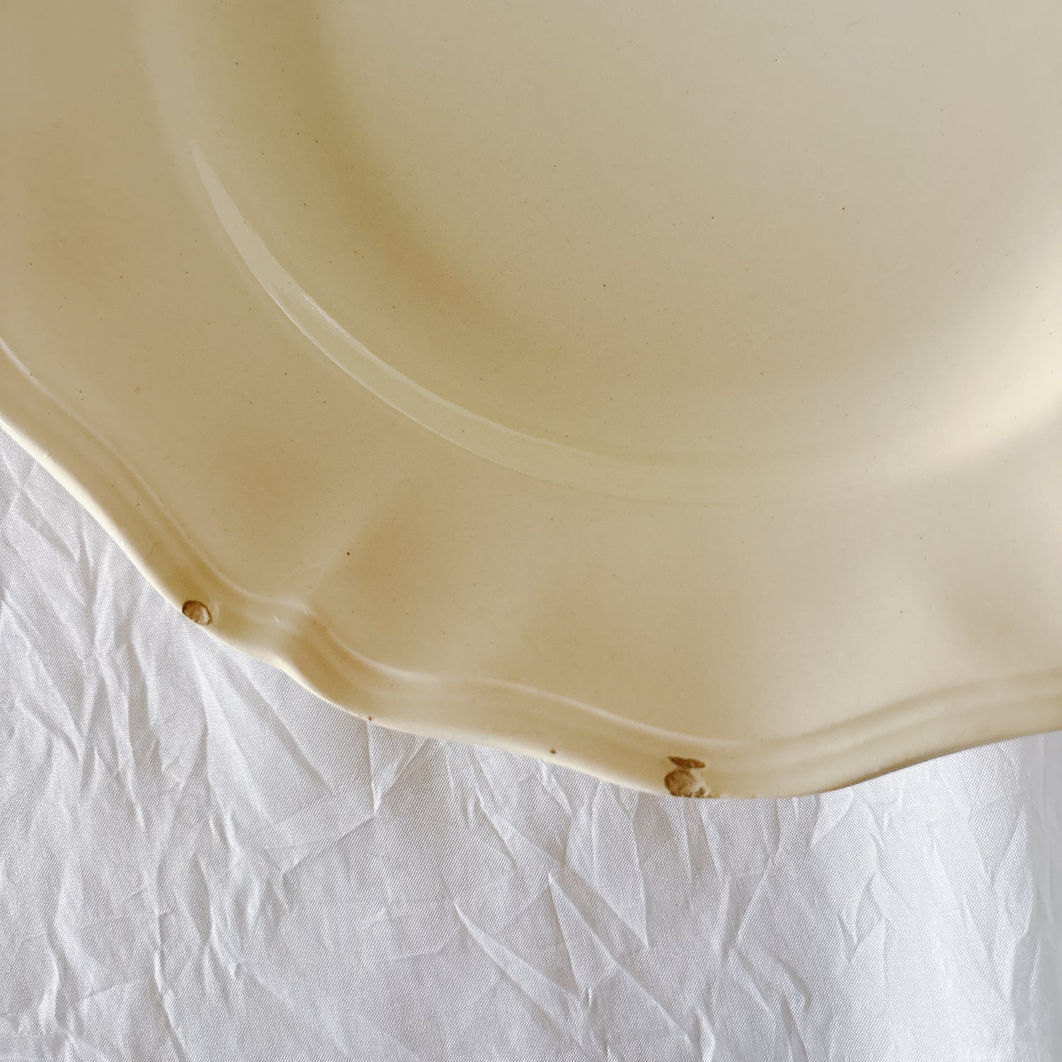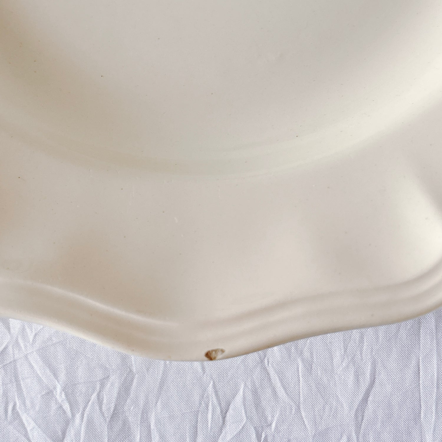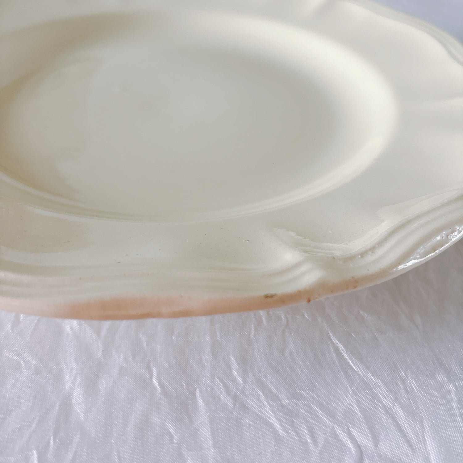 E 写真64-:一か所釉薬のムラ、わずかなカトラリー傷がみられますが、チップもラインもなく全体的に綺麗な状態です。ほぼ使用感はございません。裏側縁に製造時の凹みがみられますが、上から釉薬で仕上げられています。(上からはみえません)