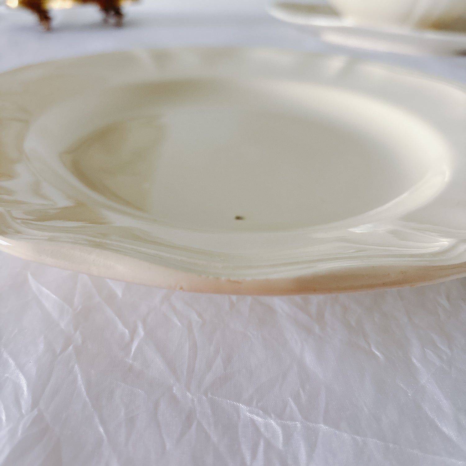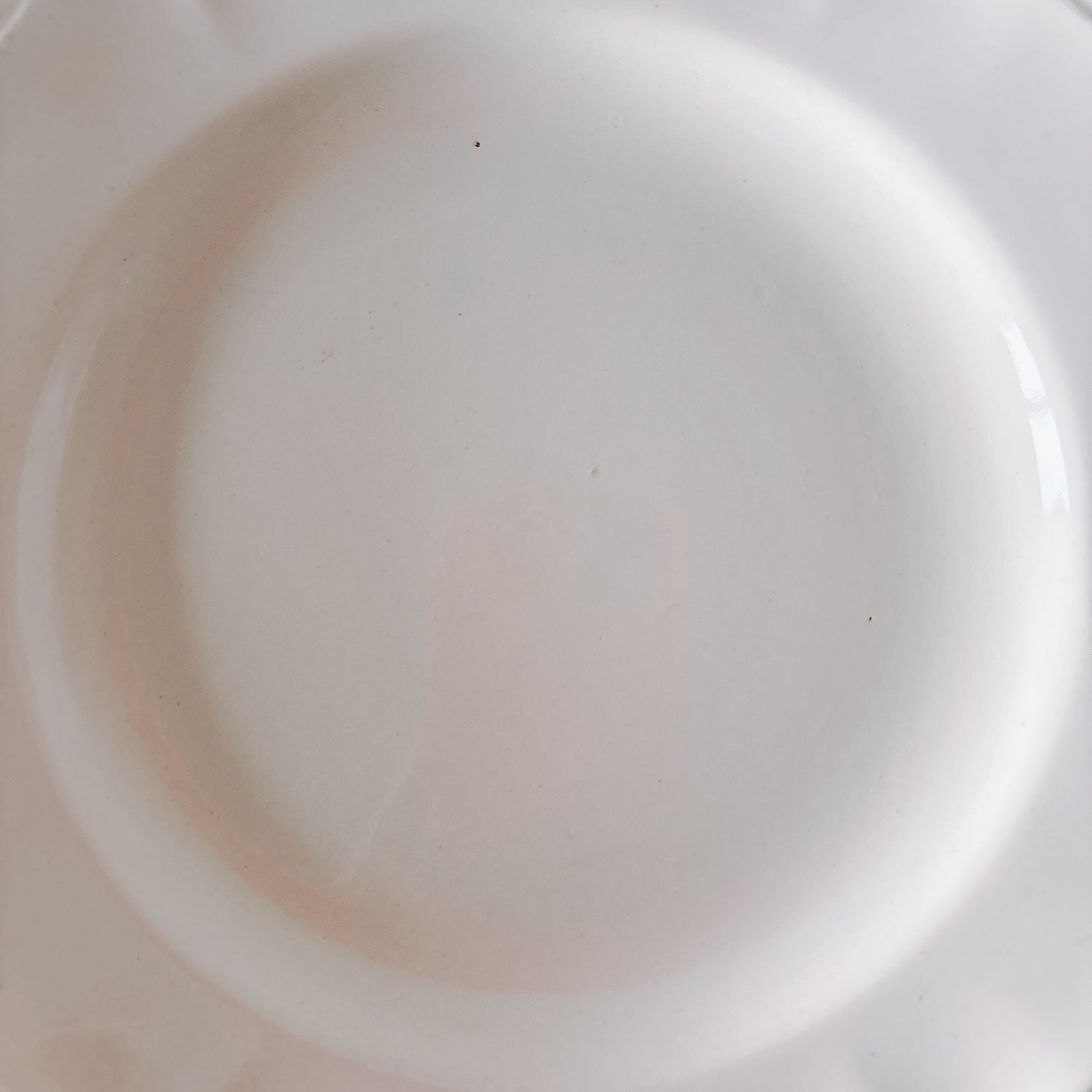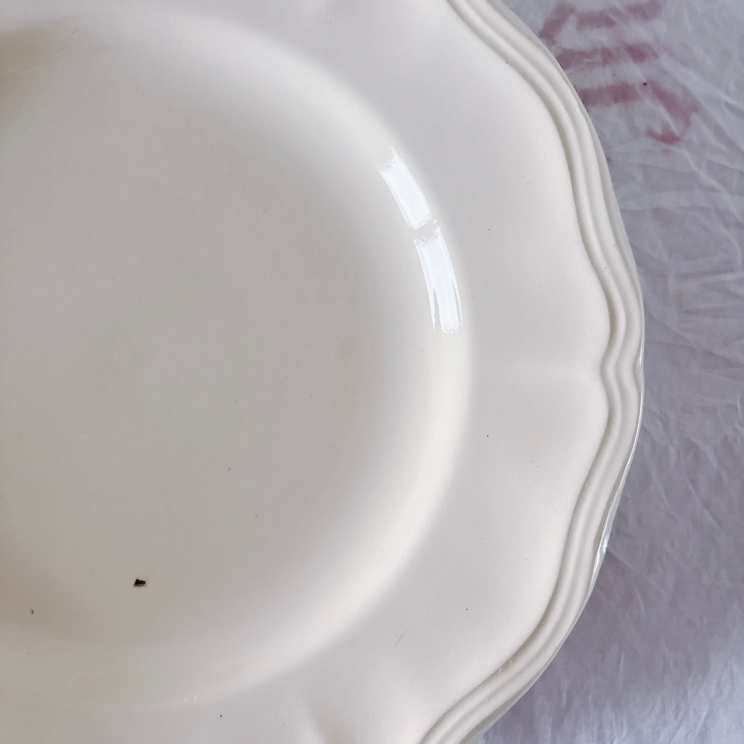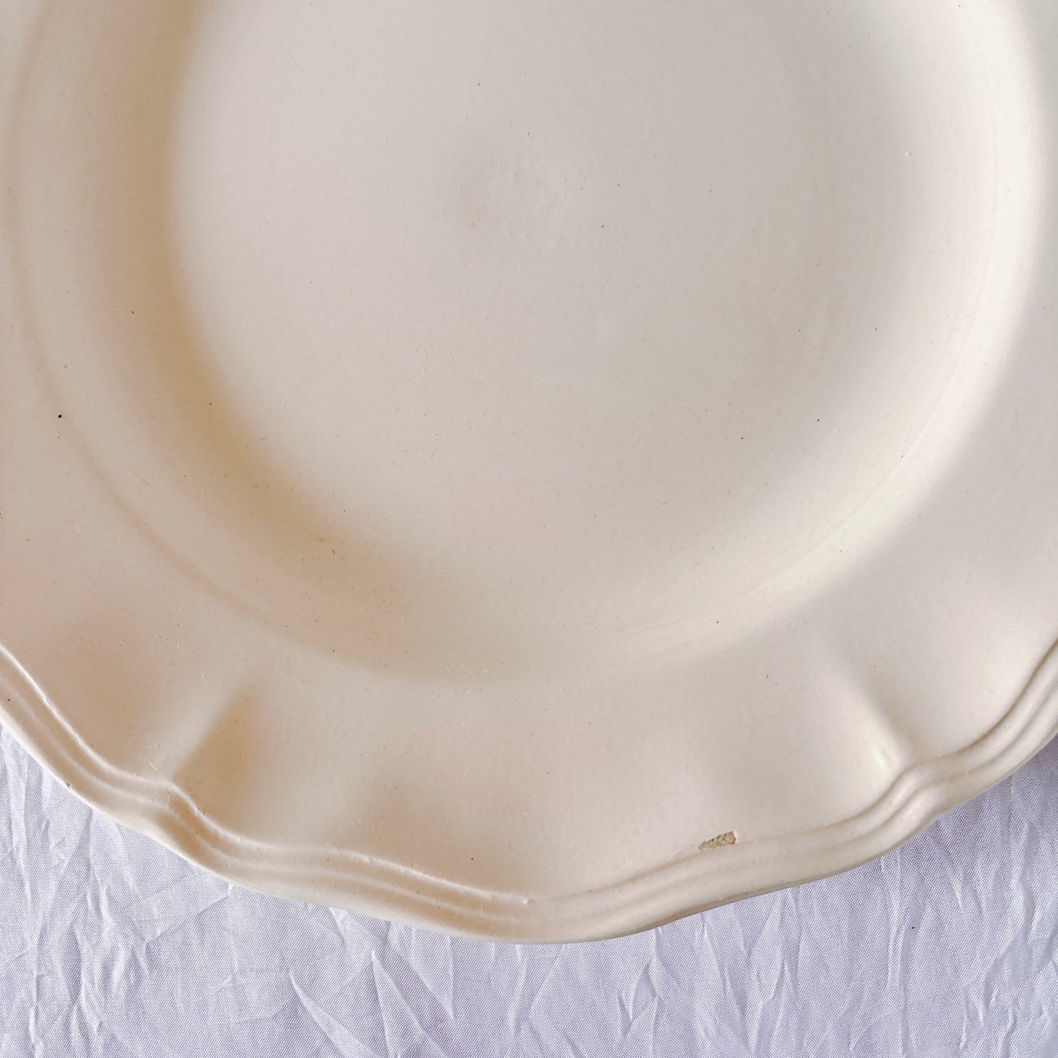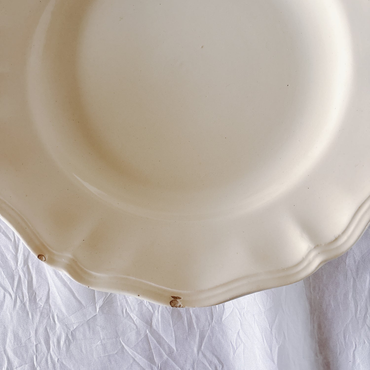 E 写真64-:一か所釉薬のムラ、わずかなカトラリー傷がみられますが、チップもラインもなく全体的に綺麗な状態です。ほぼ使用感はございません。裏側縁に製造時の凹みがみられますが、上から釉薬で仕上げられています。(上からはみえません)