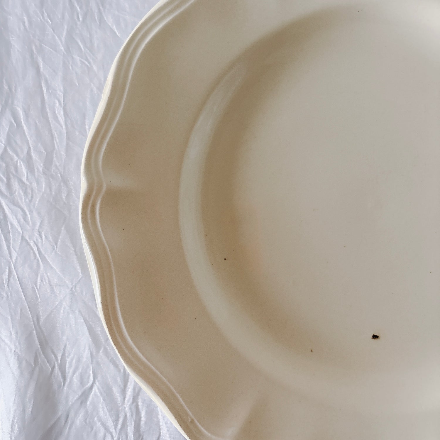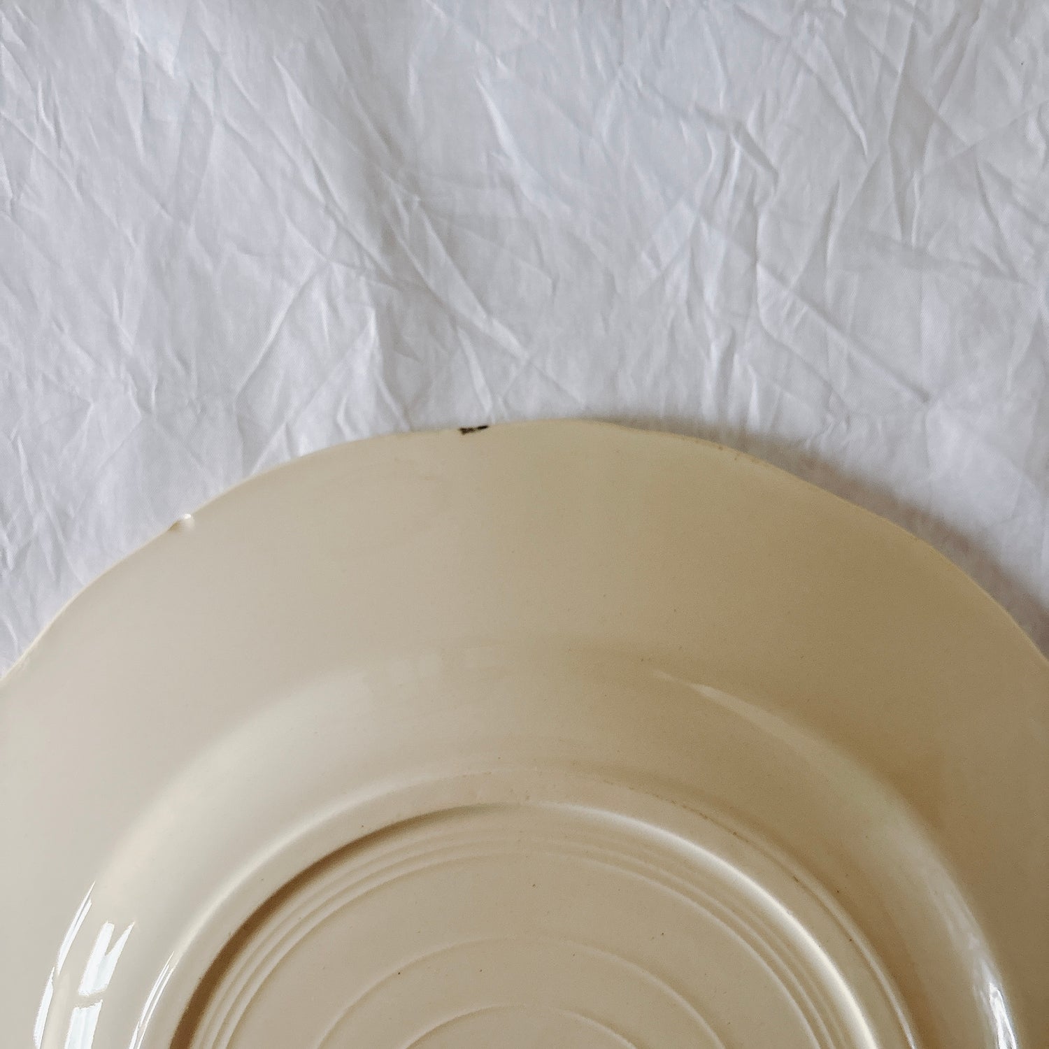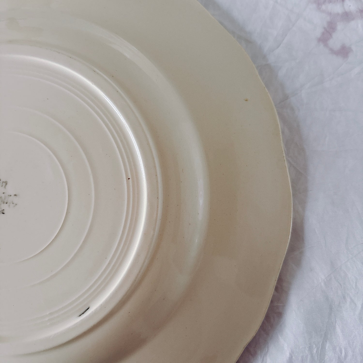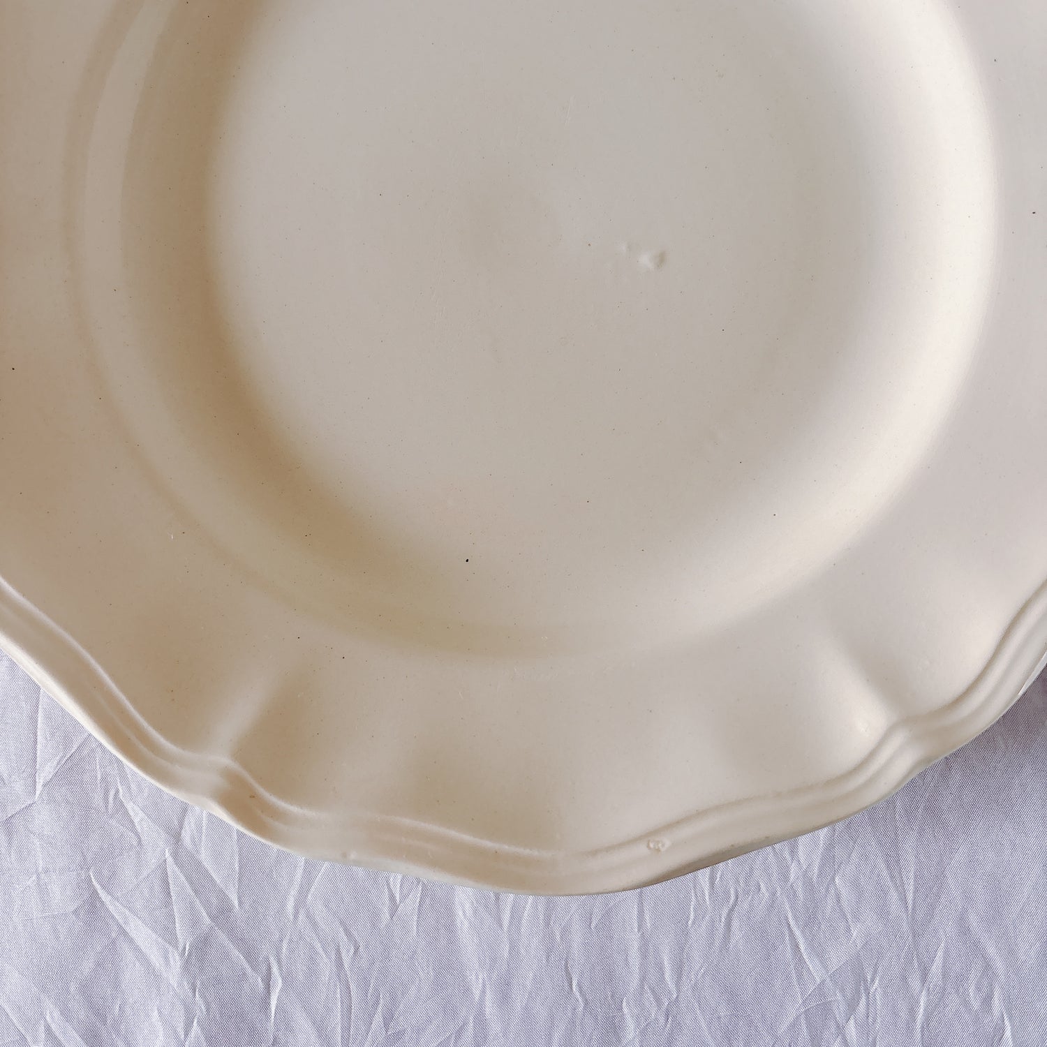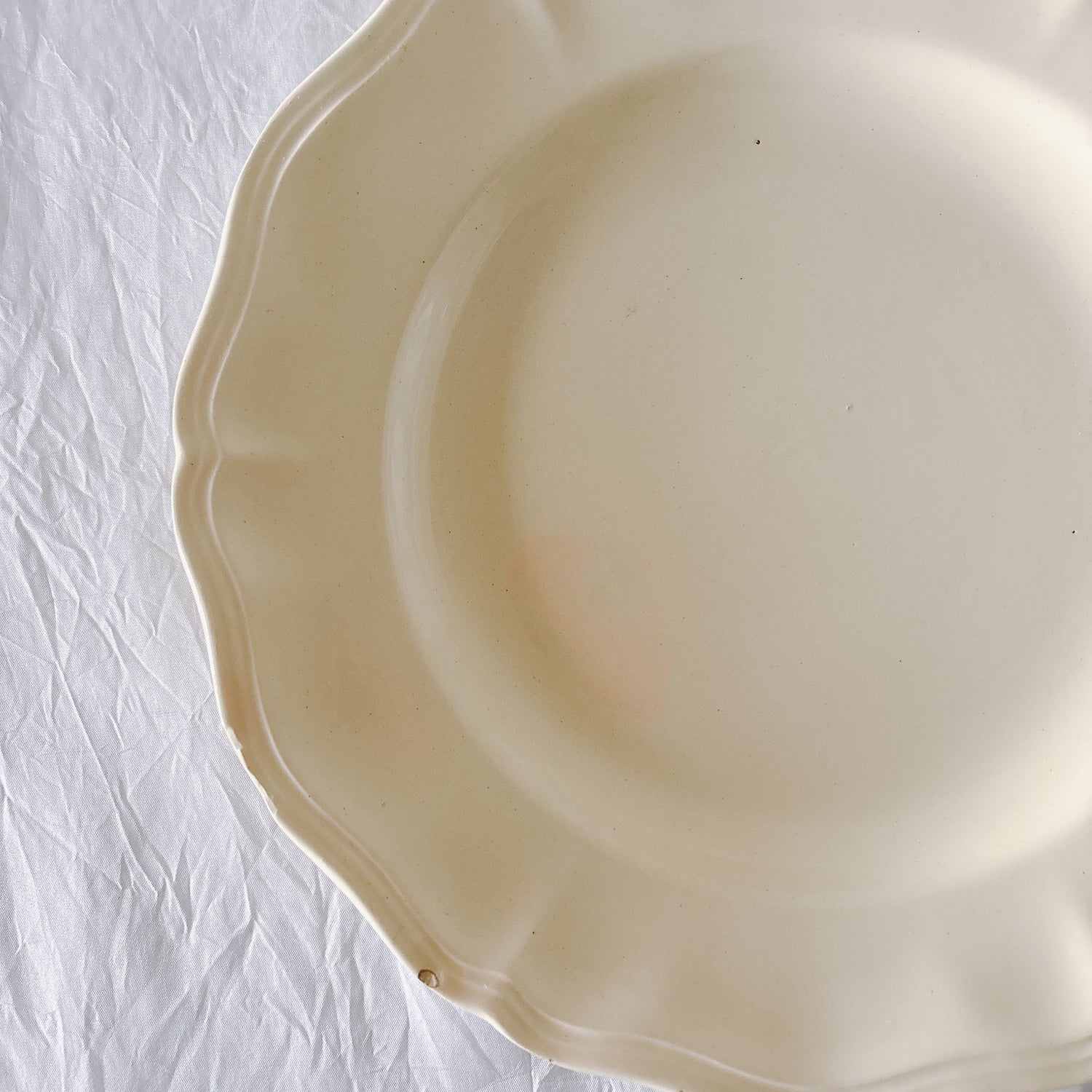E 写真64-:一か所釉薬のムラ、わずかなカトラリー傷がみられますが、チップもラインもなく全体的に綺麗な状態です。ほぼ使用感はございません。裏側縁に製造時の凹みがみられますが、上から釉薬で仕上げられています。(上からはみえません)