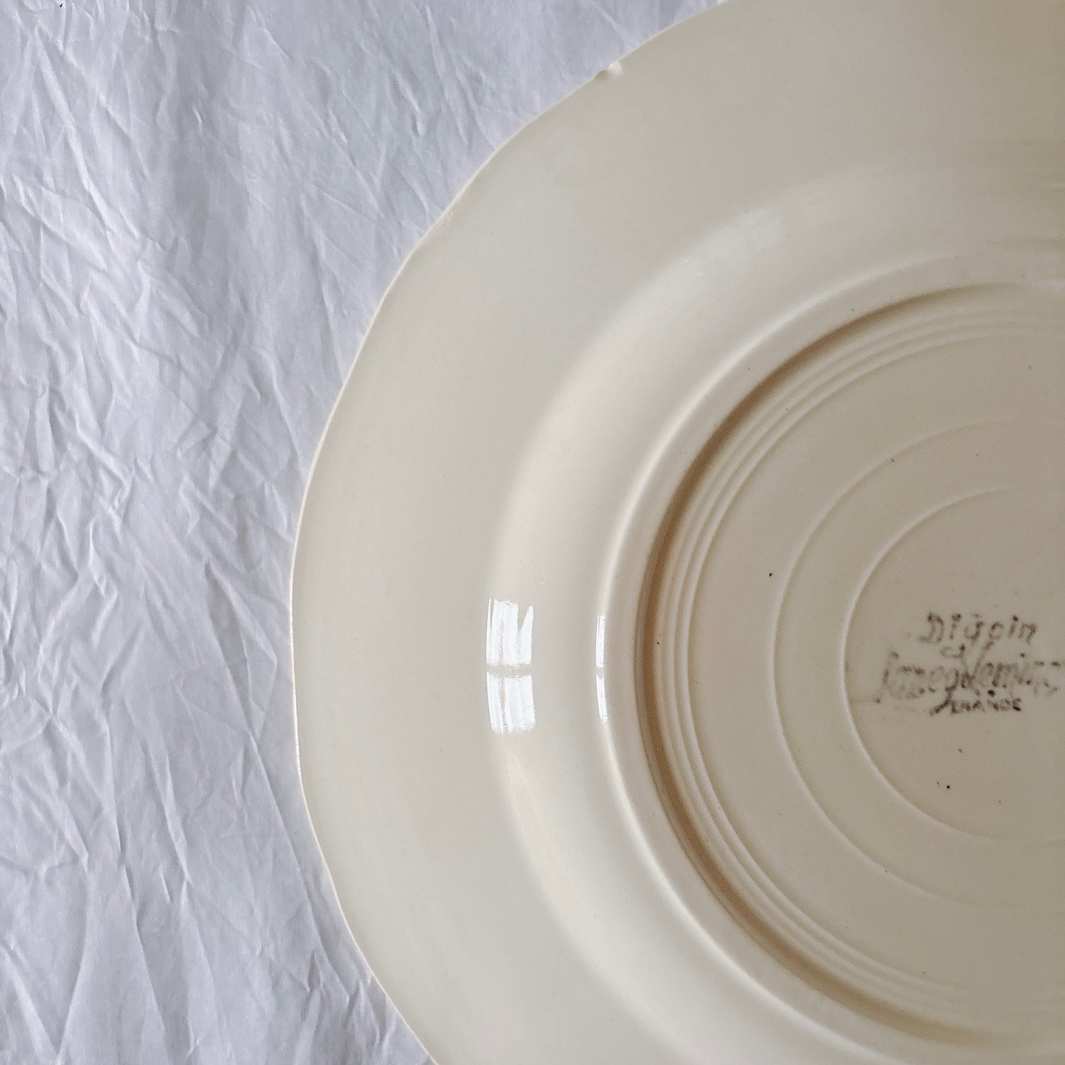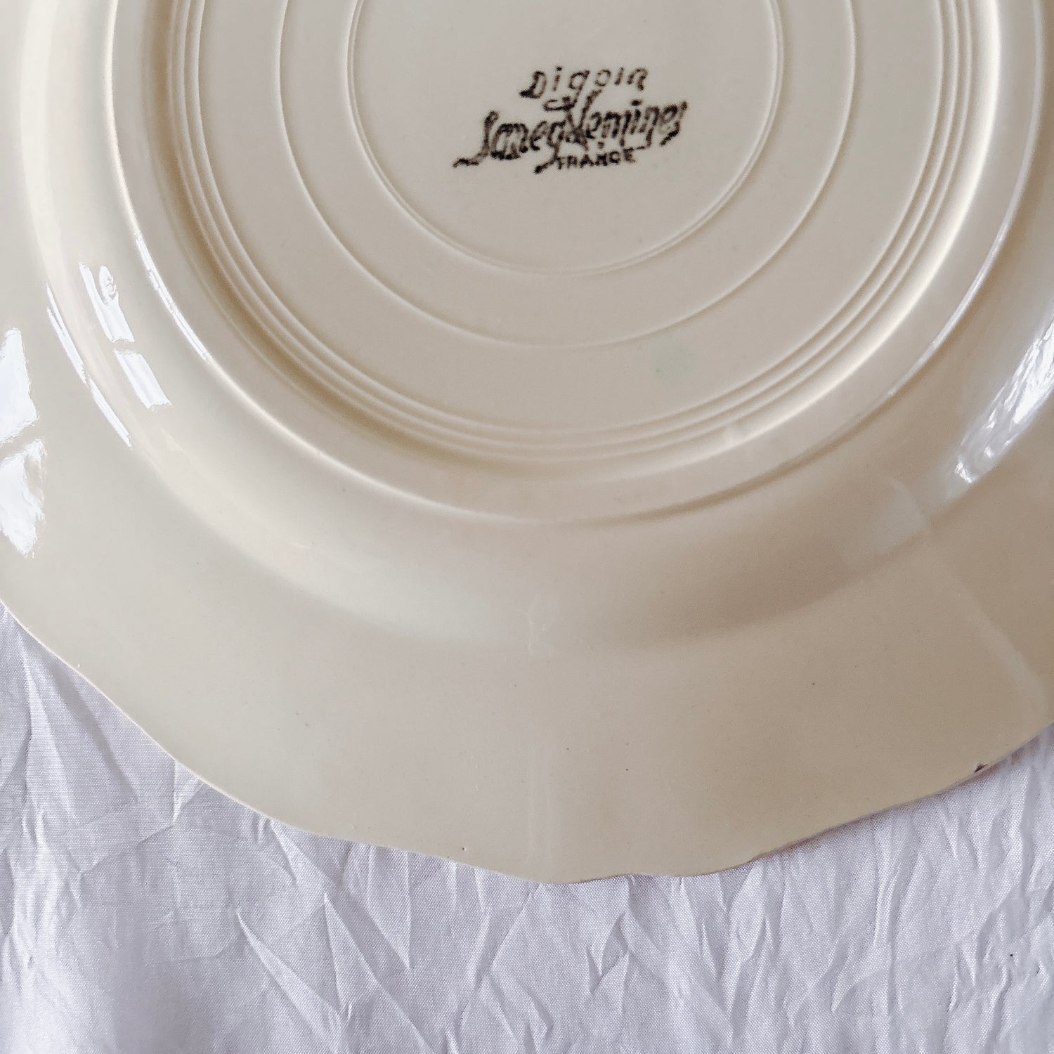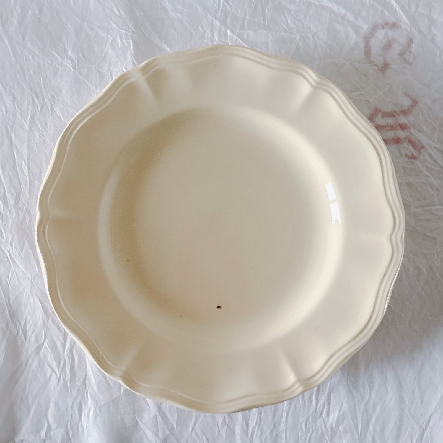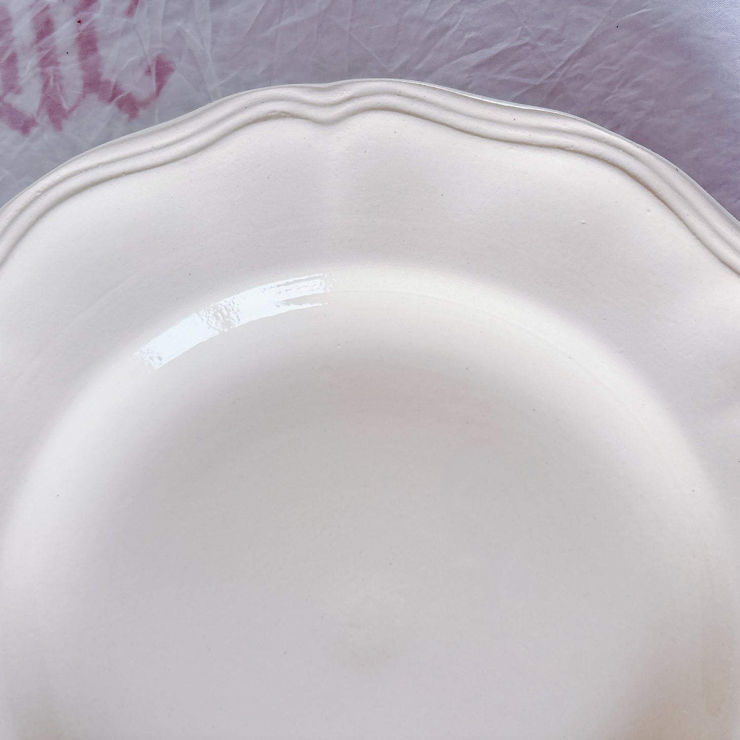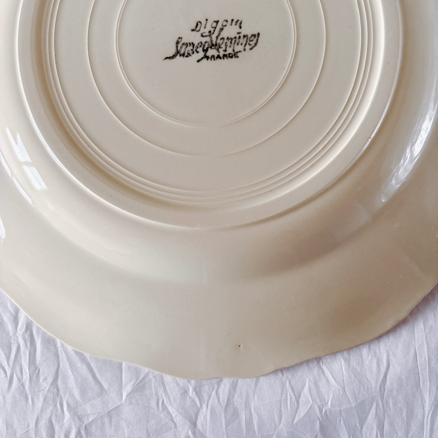 E 写真64-:一か所釉薬のムラ、わずかなカトラリー傷がみられますが、チップもラインもなく全体的に綺麗な状態です。ほぼ使用感はございません。裏側縁に製造時の凹みがみられますが、上から釉薬で仕上げられています。(上からはみえません)