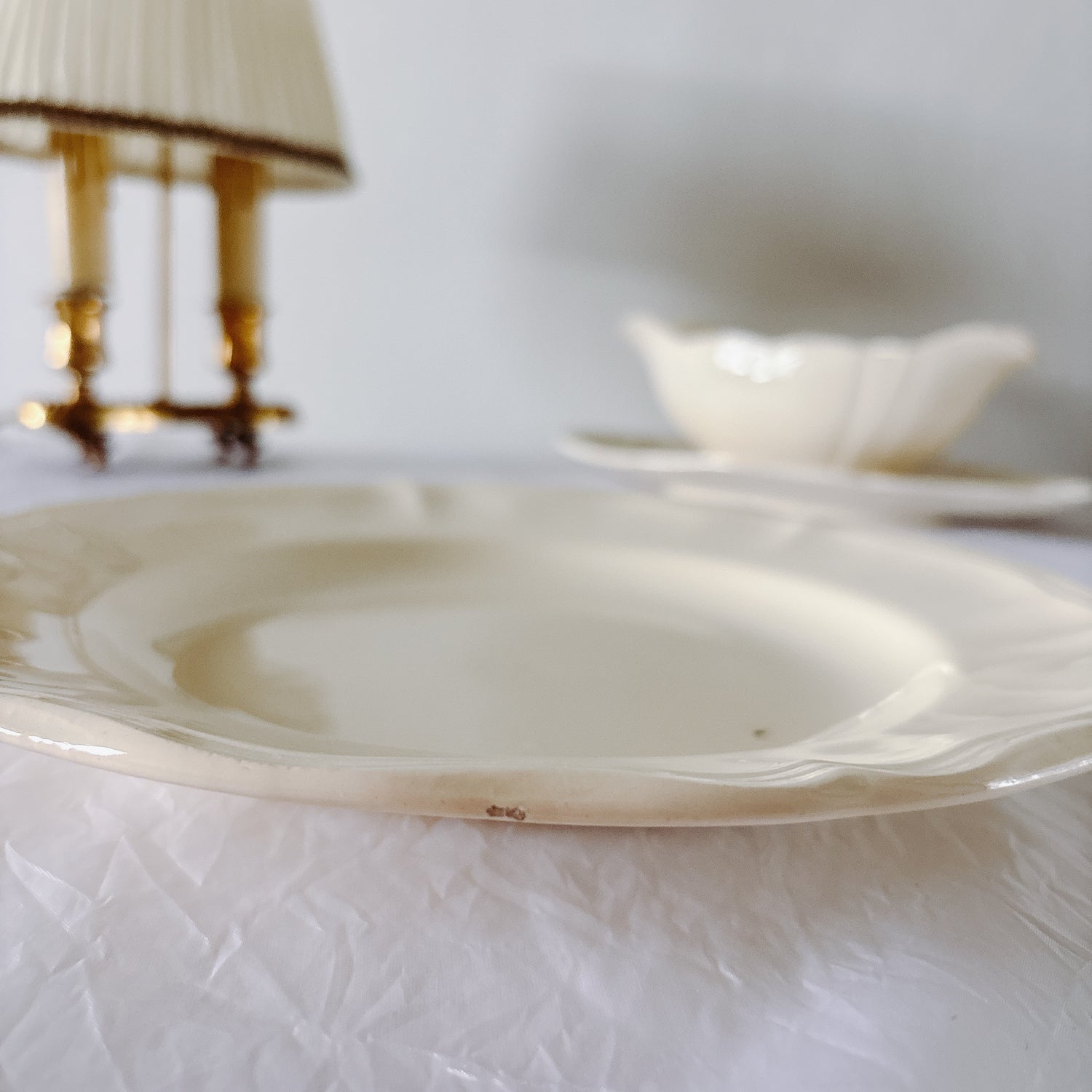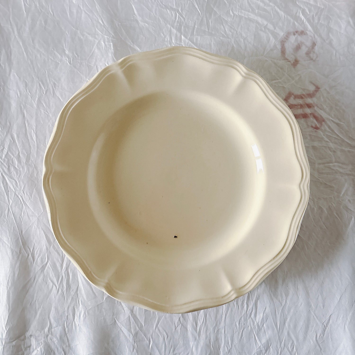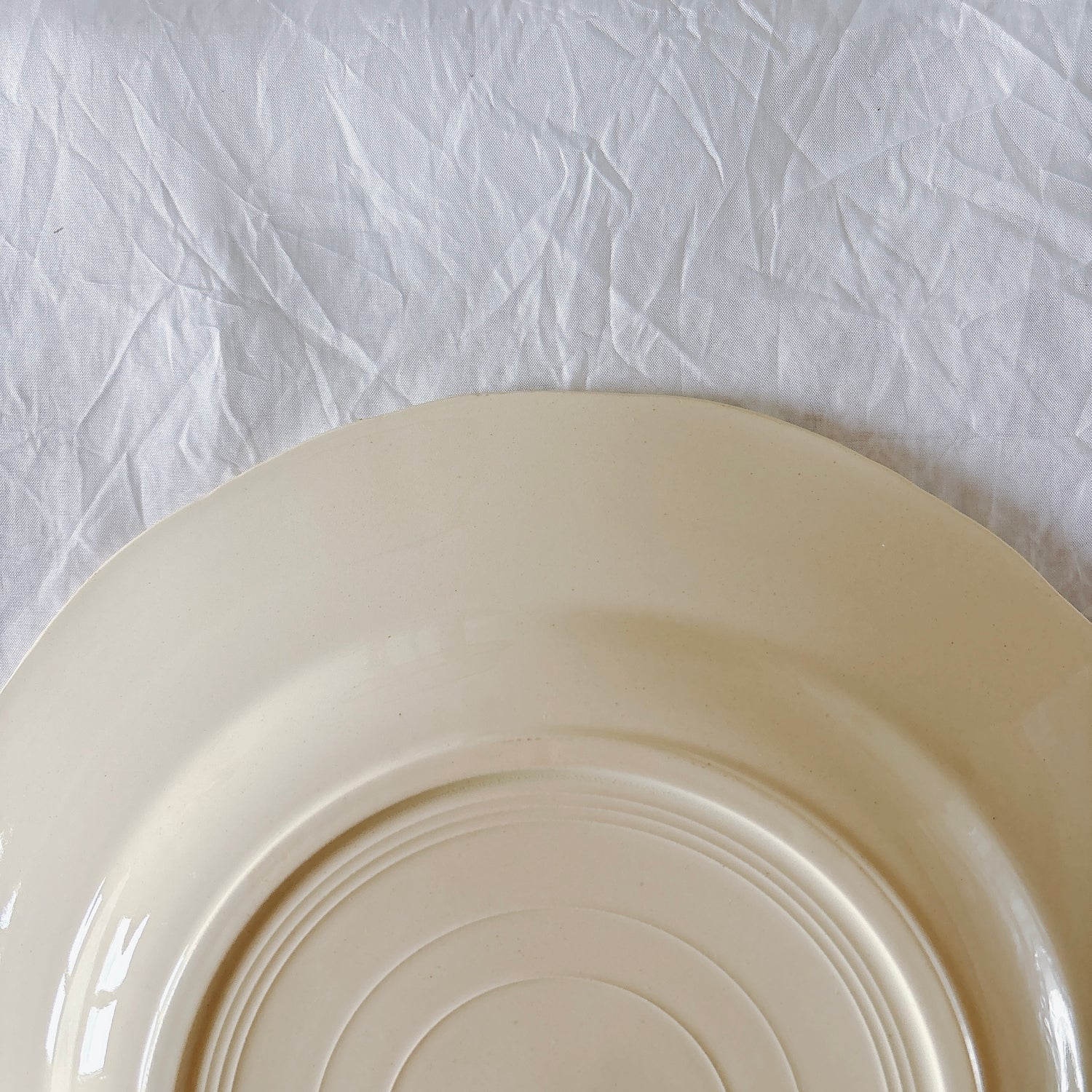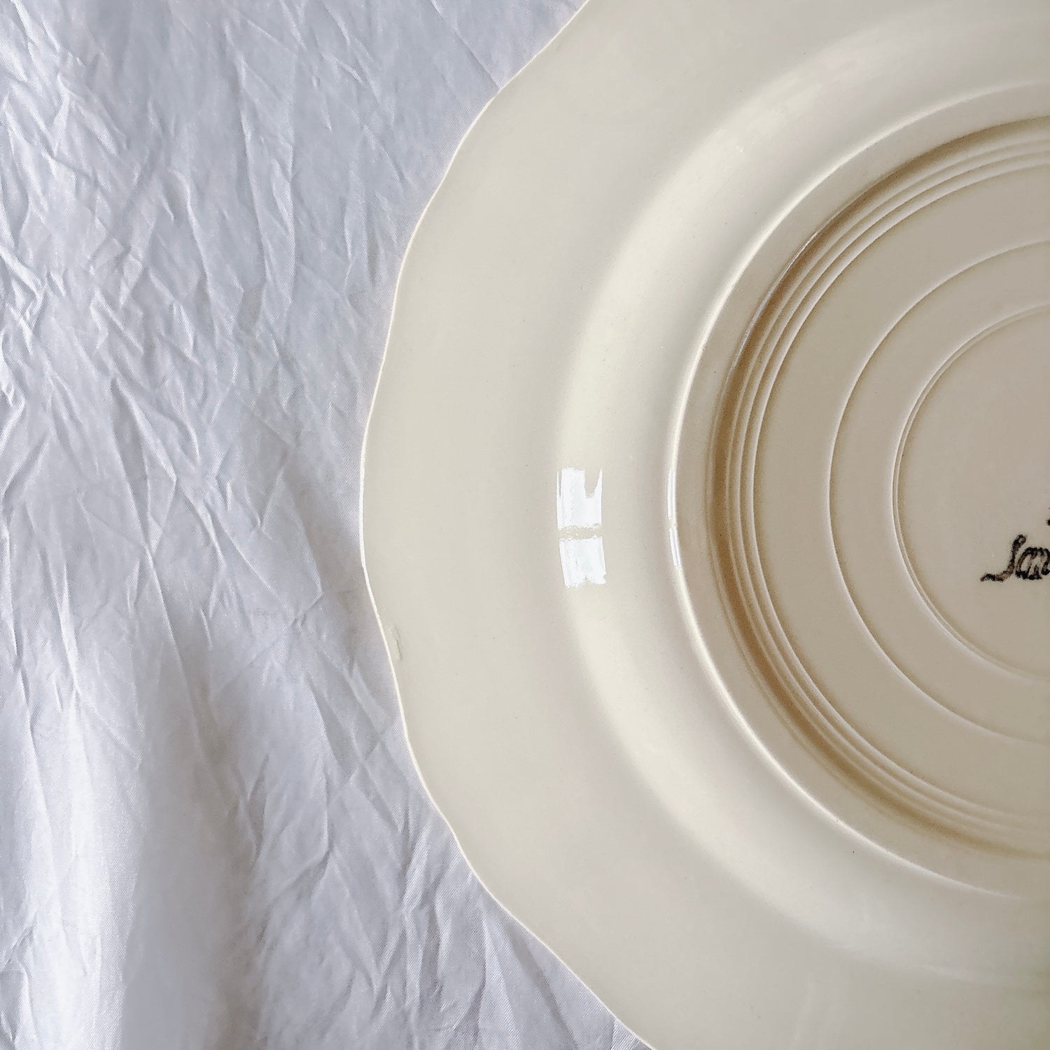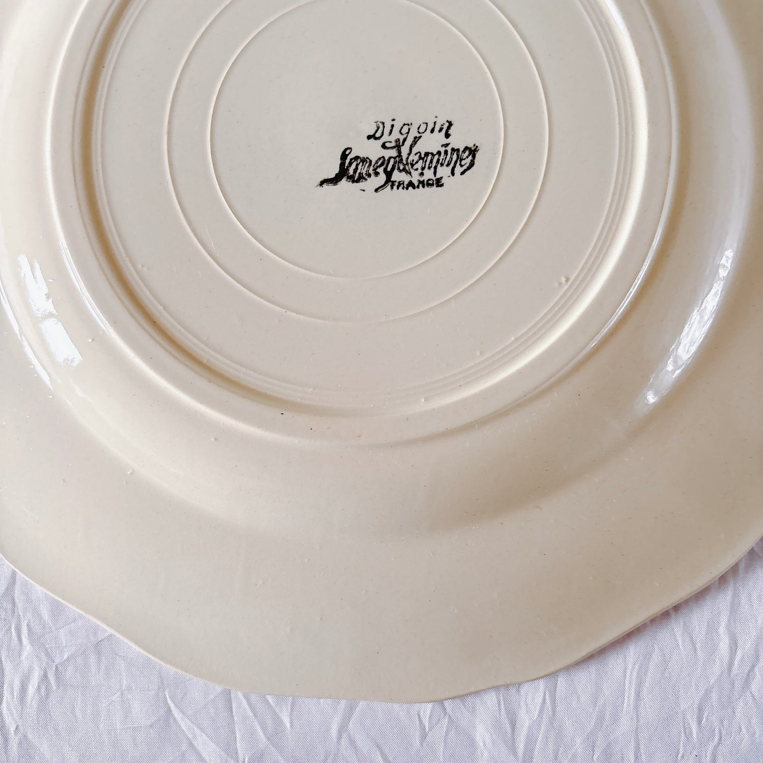E 写真64-:一か所釉薬のムラ、わずかなカトラリー傷がみられますが、チップもラインもなく全体的に綺麗な状態です。ほぼ使用感はございません。裏側縁に製造時の凹みがみられますが、上から釉薬で仕上げられています。(上からはみえません)