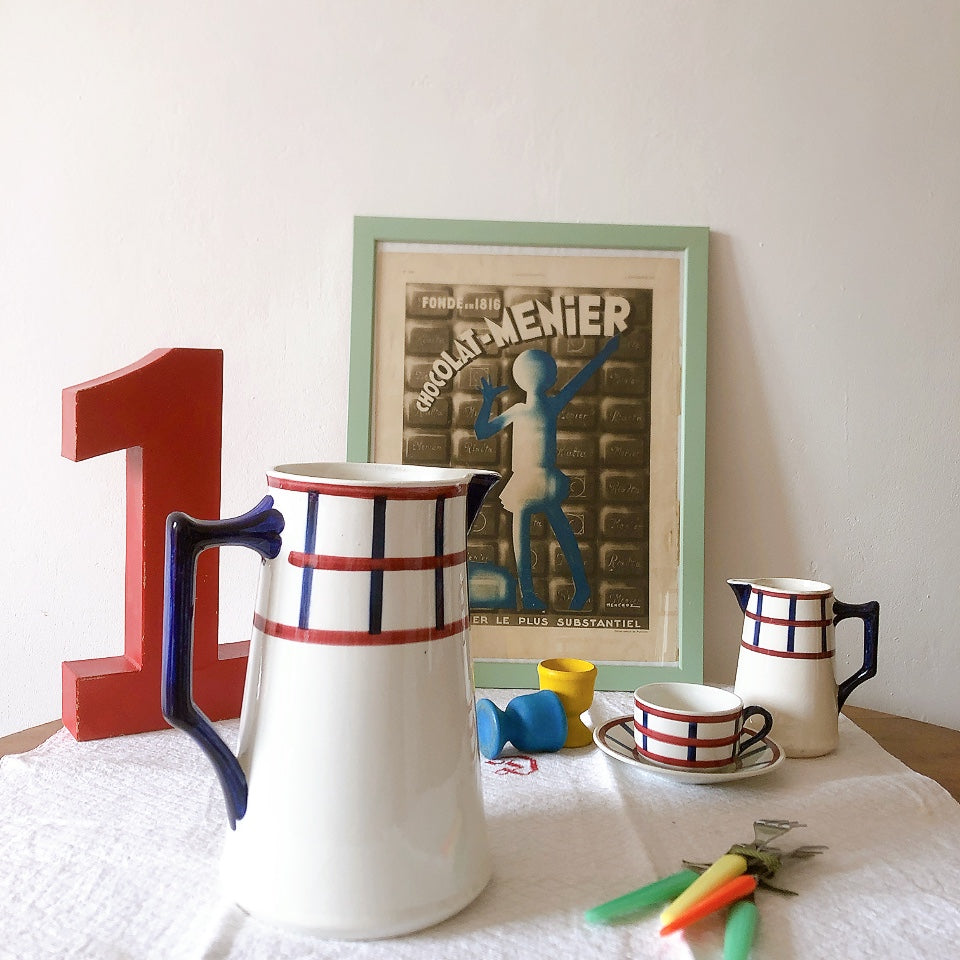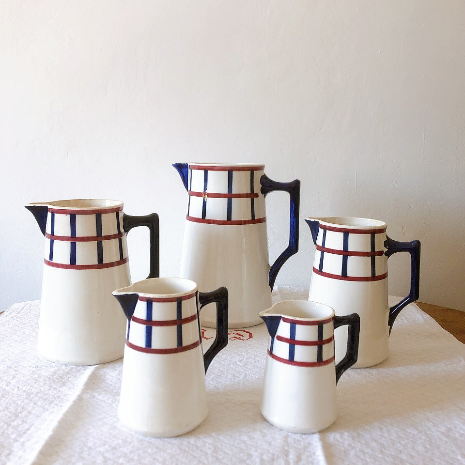 HBCM(Hippolyte Boulenger-Creil-Montereauクレイユ&モントロー)窯製 Béarn モデルのバスク柄 ピシェ(ピッチャー)です。赤x青。
