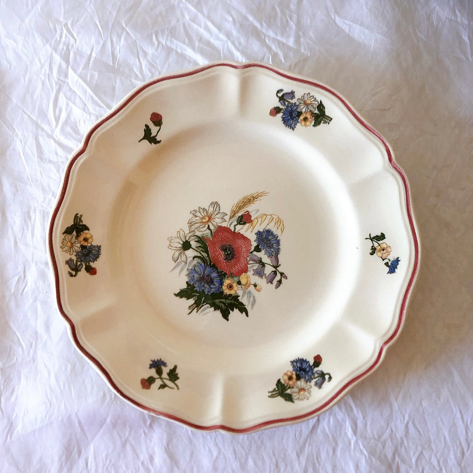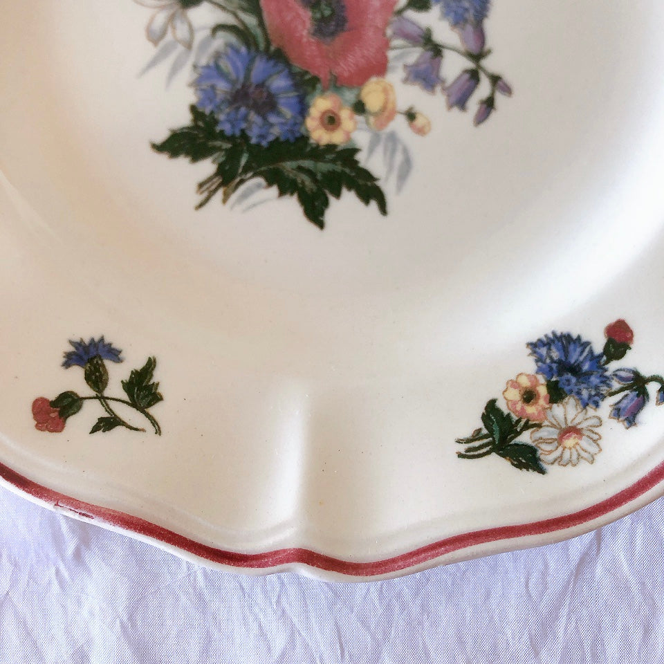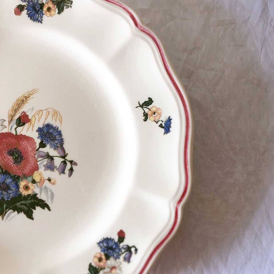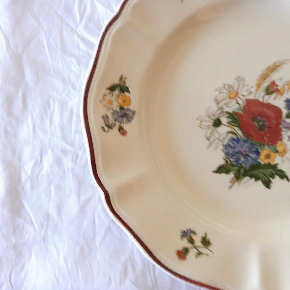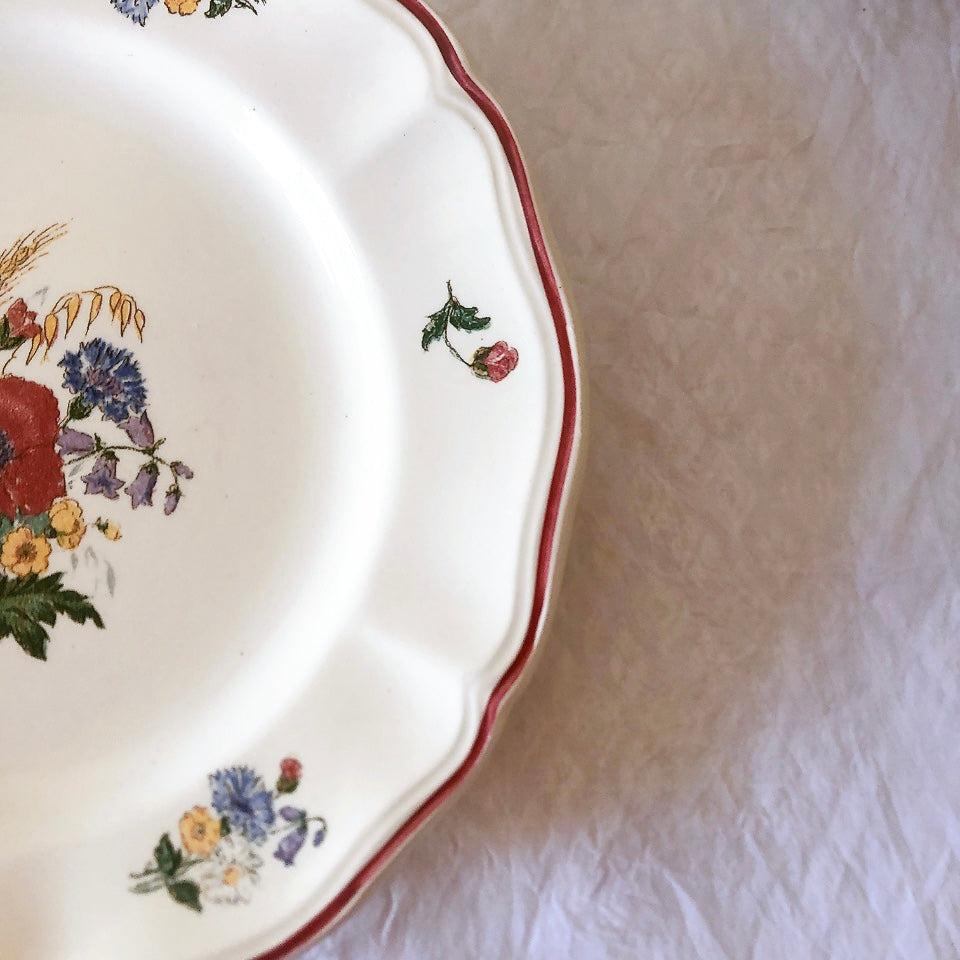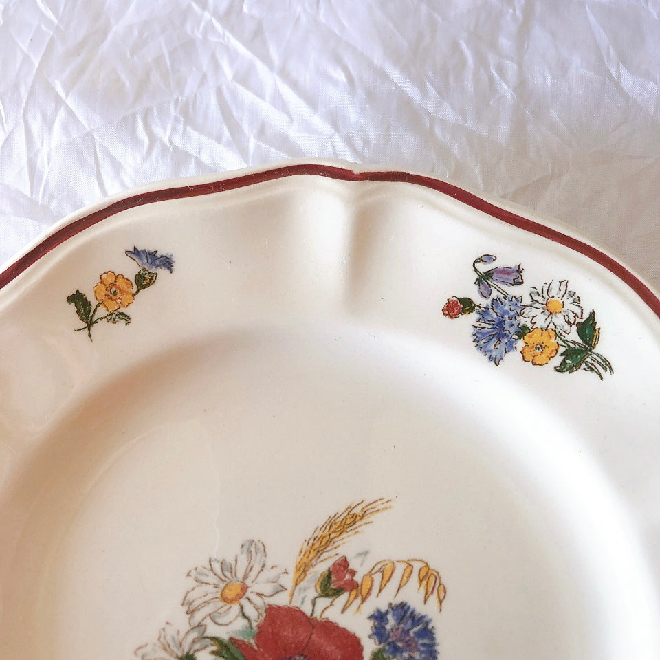 サルグミンヌ窯の人気シリーズ花リムを原型に、縁取りに赤いライン、真ん中と周りにポピーやひな菊などの野花をちりばめた、定番・人気の、アグレストシリーズです。