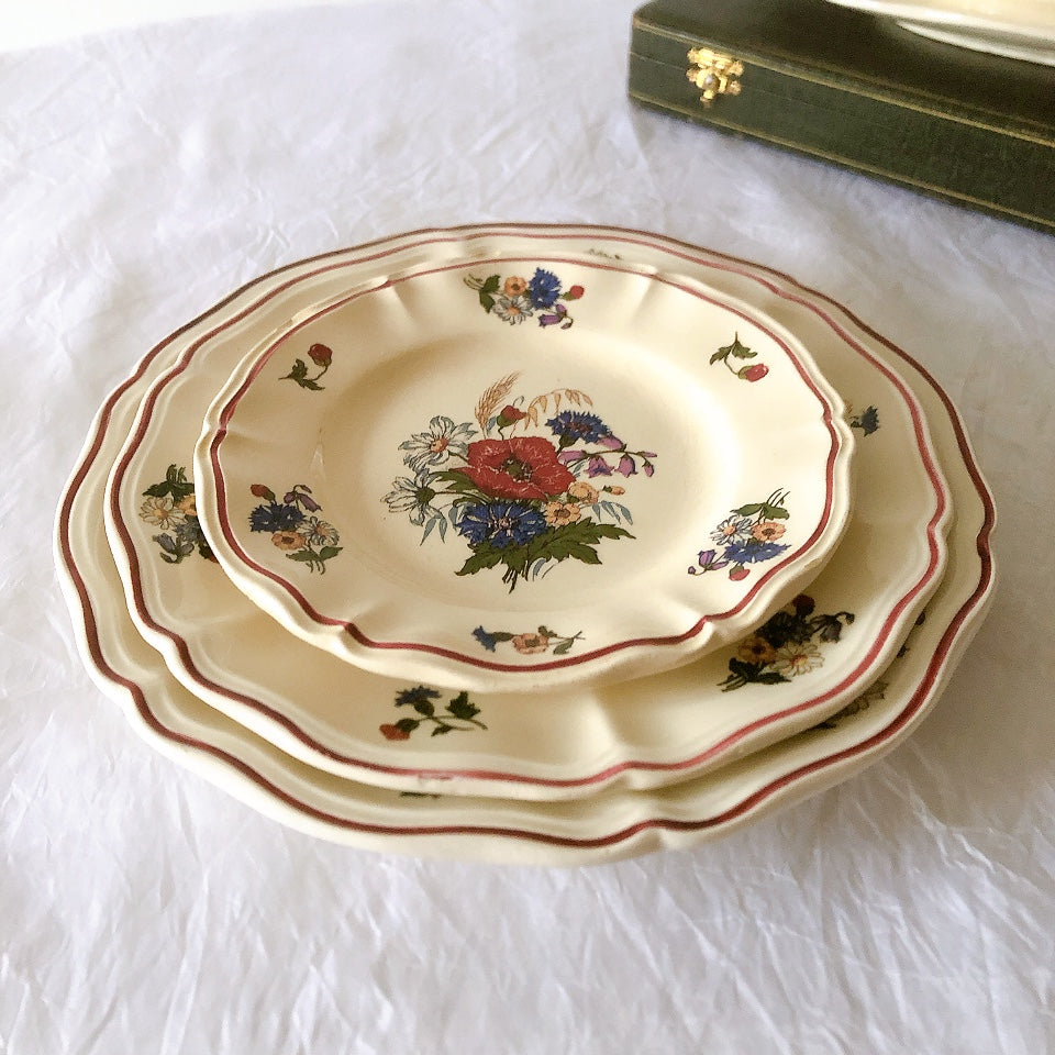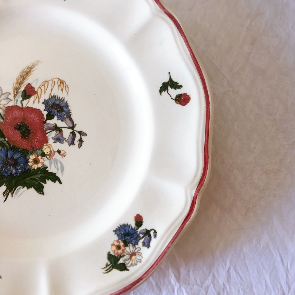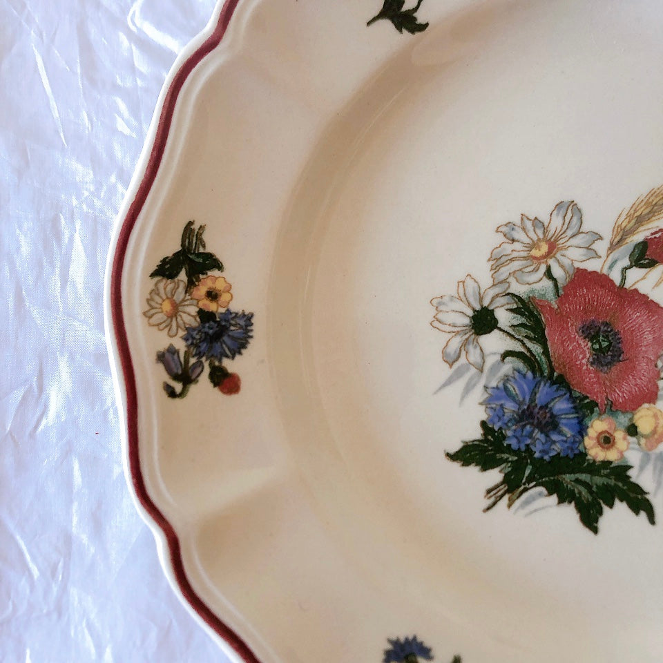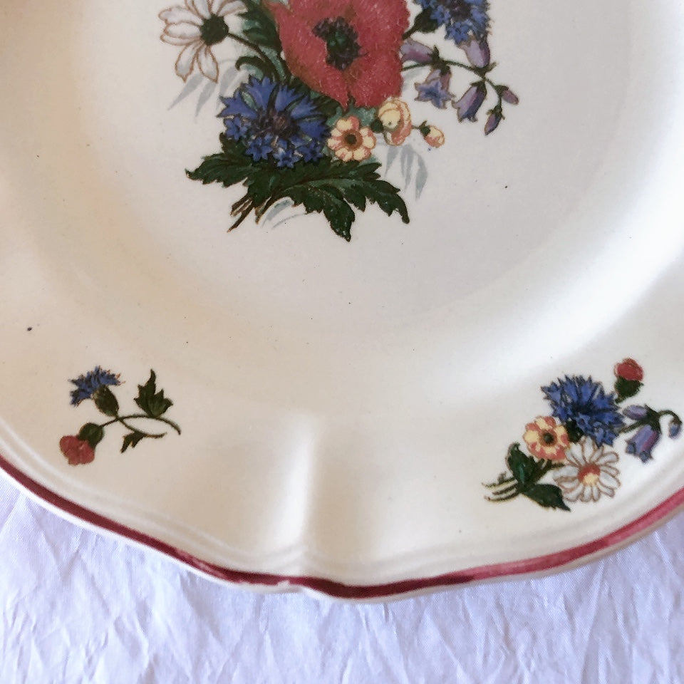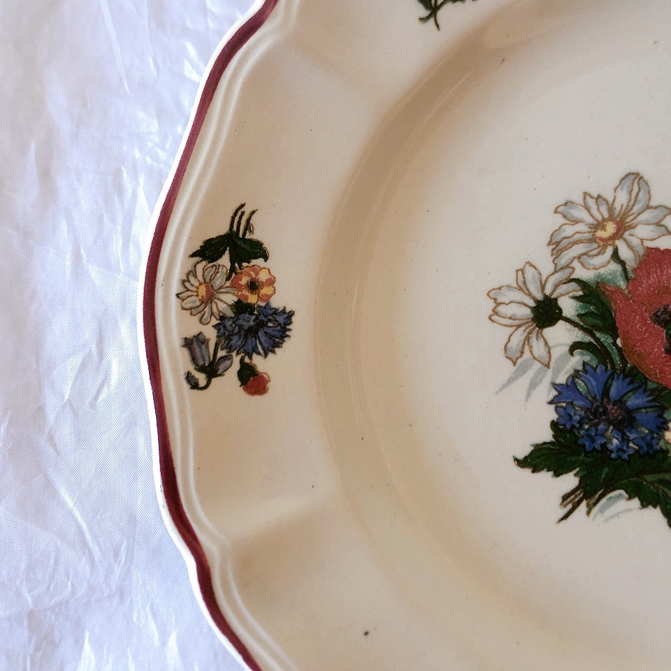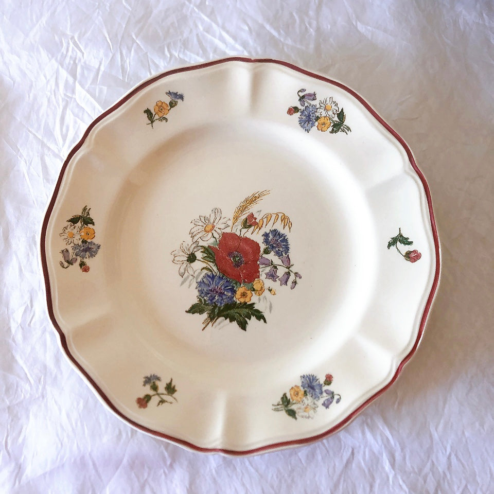 サルグミンヌ窯の人気シリーズ花リムを原型に、縁取りに赤いライン、真ん中と周りにポピーやひな菊などの野花をちりばめた、定番・人気の、アグレストシリーズです。