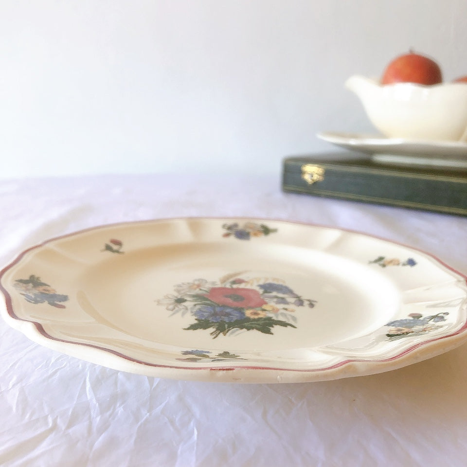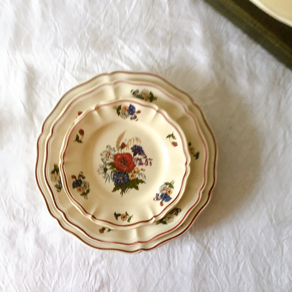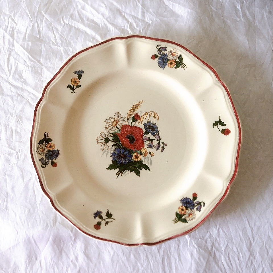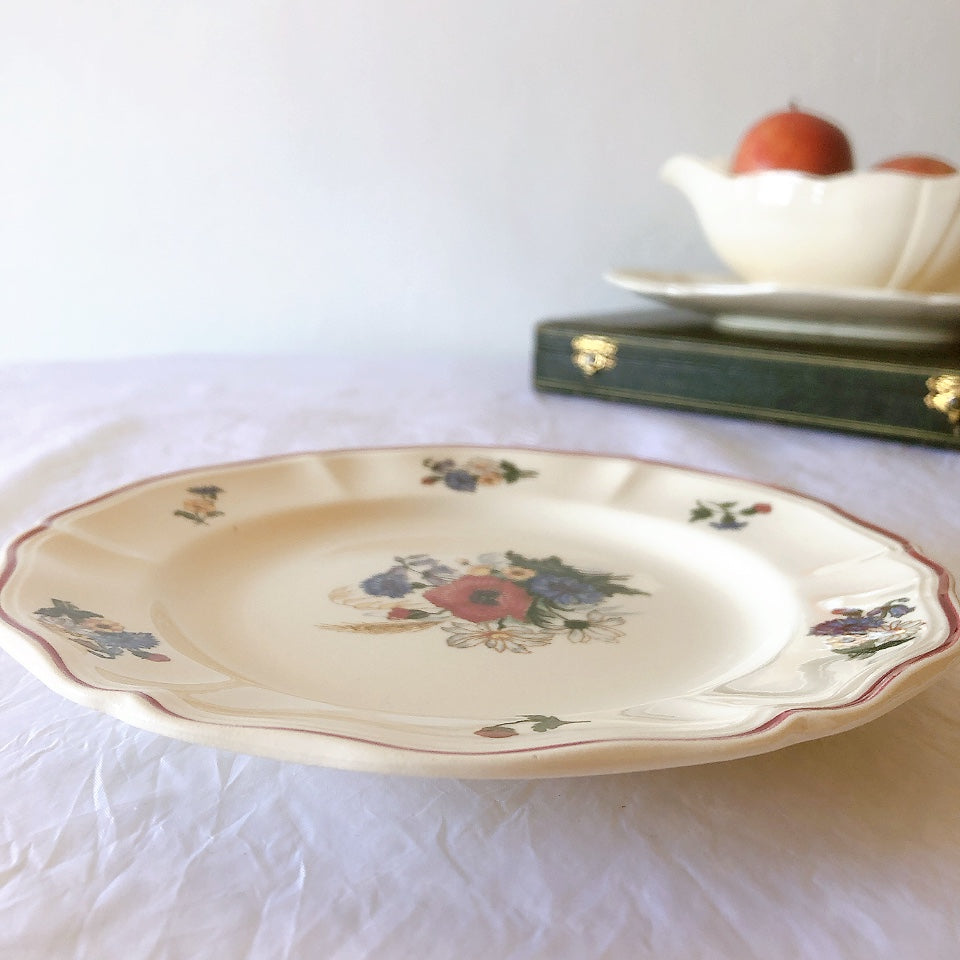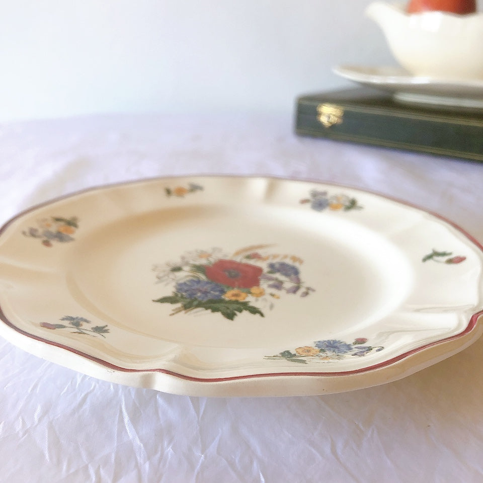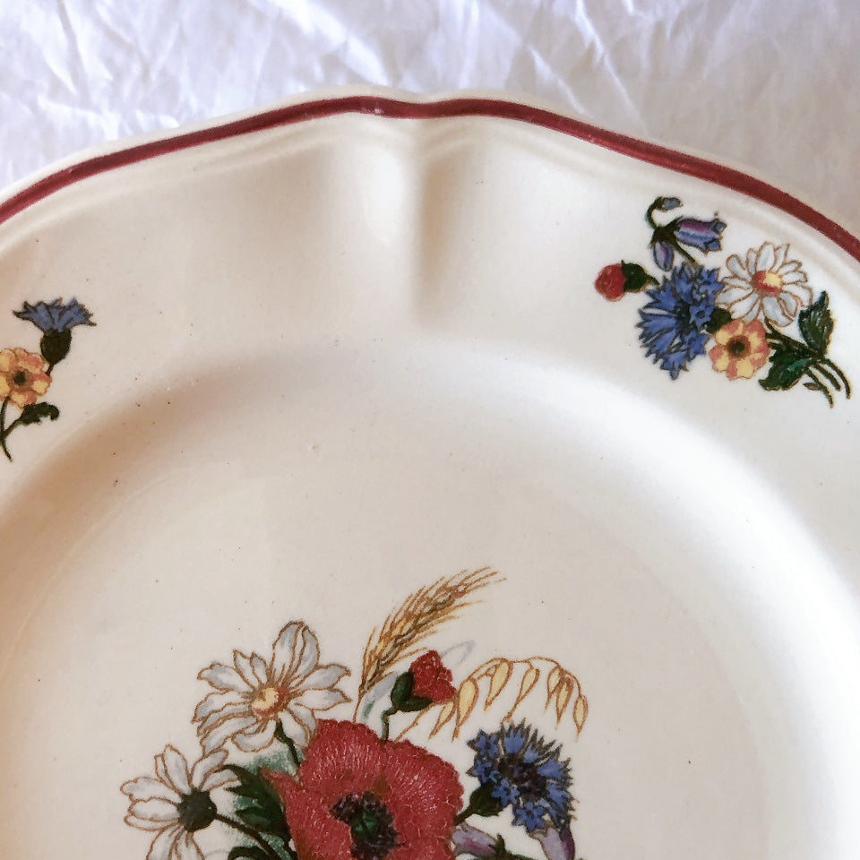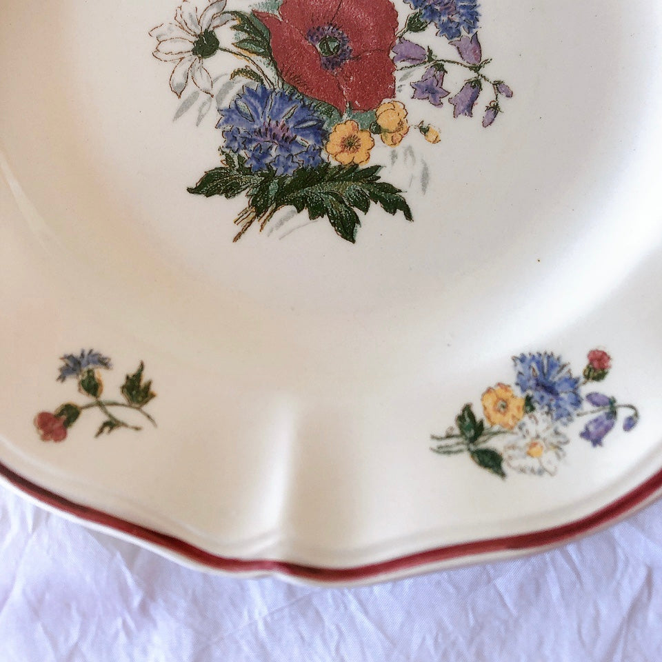 サルグミンヌ窯の人気シリーズ花リムを原型に、縁取りに赤いライン、真ん中と周りにポピーやひな菊などの野花をちりばめた、定番・人気の、アグレストシリーズです。