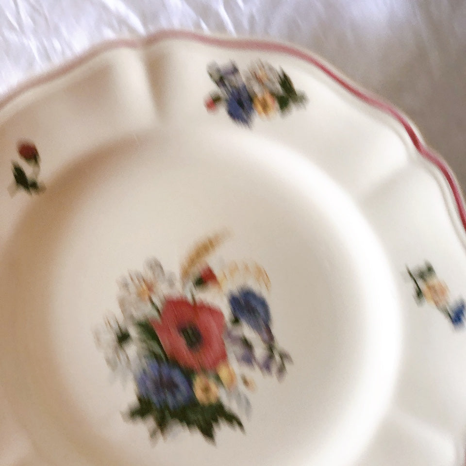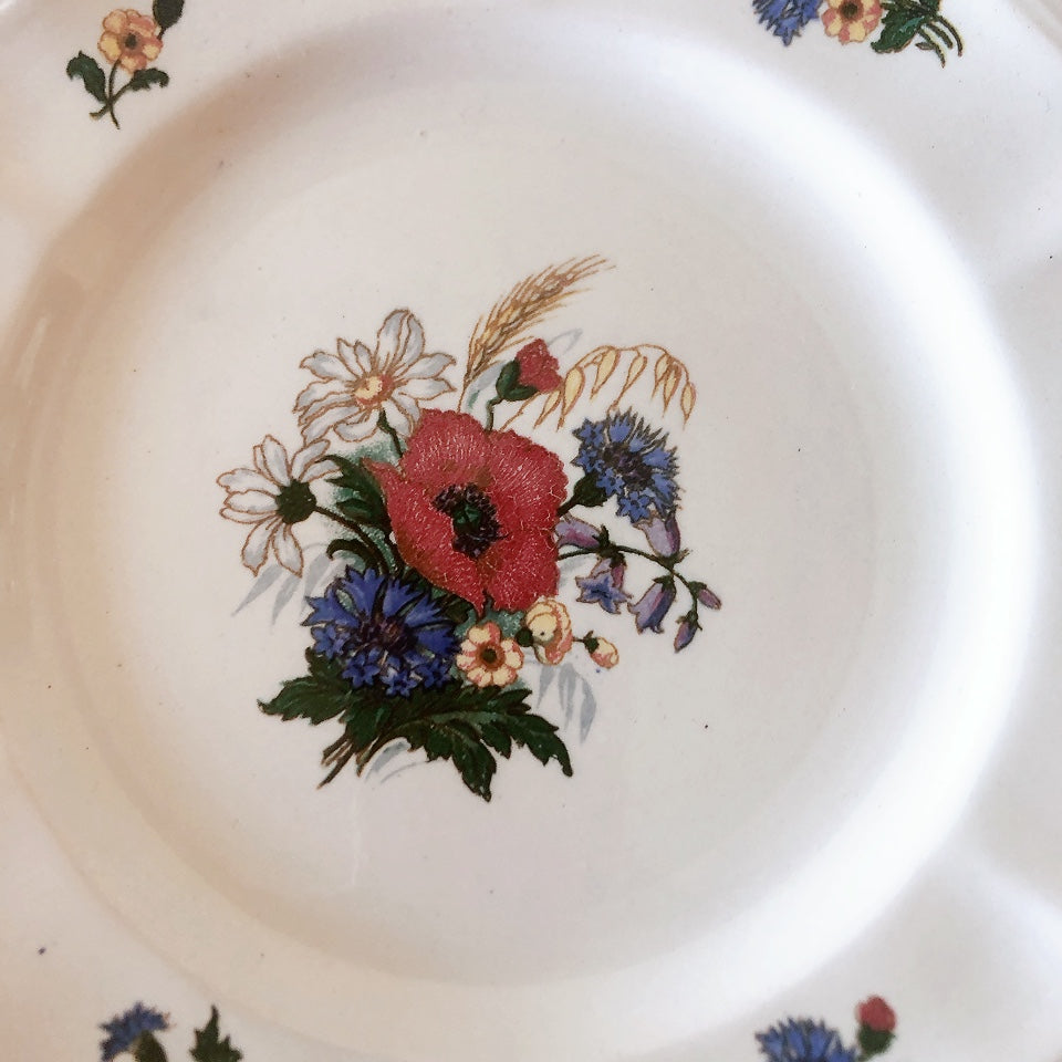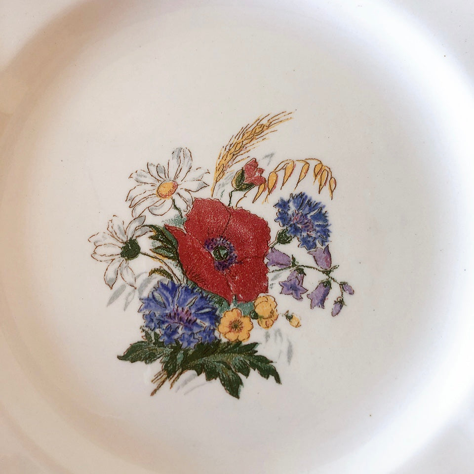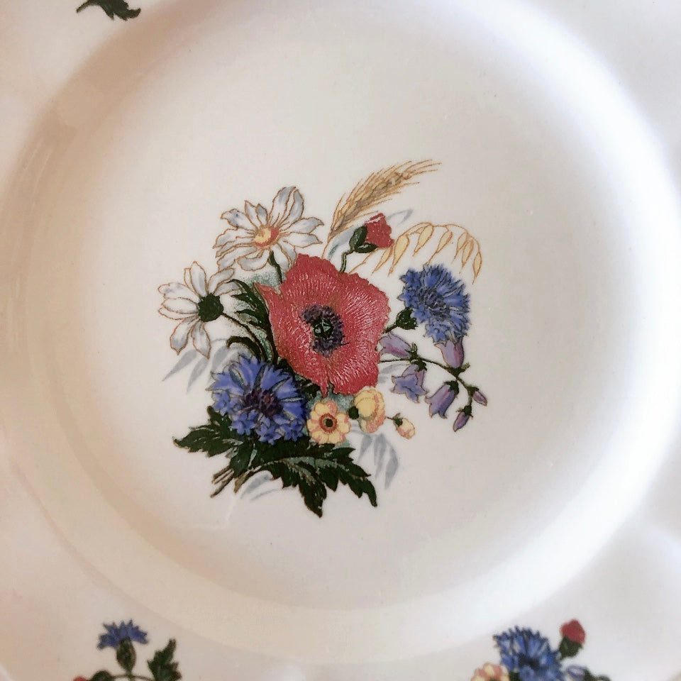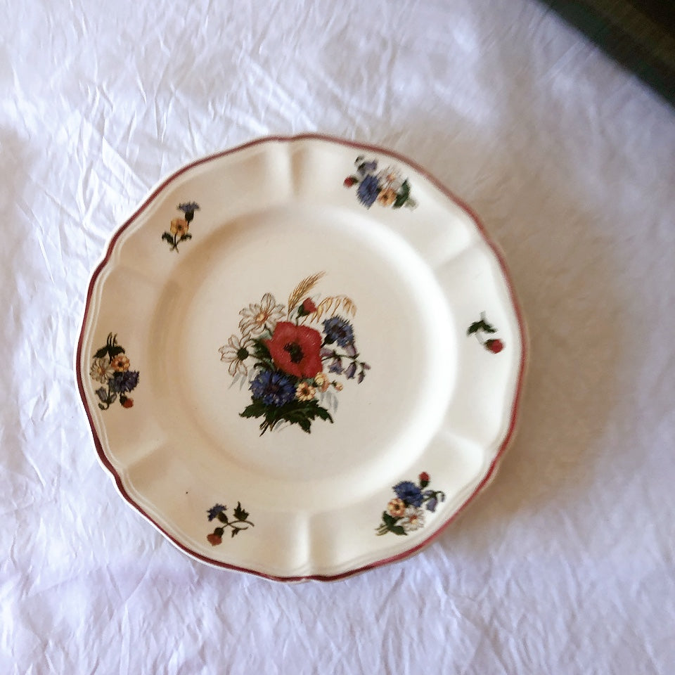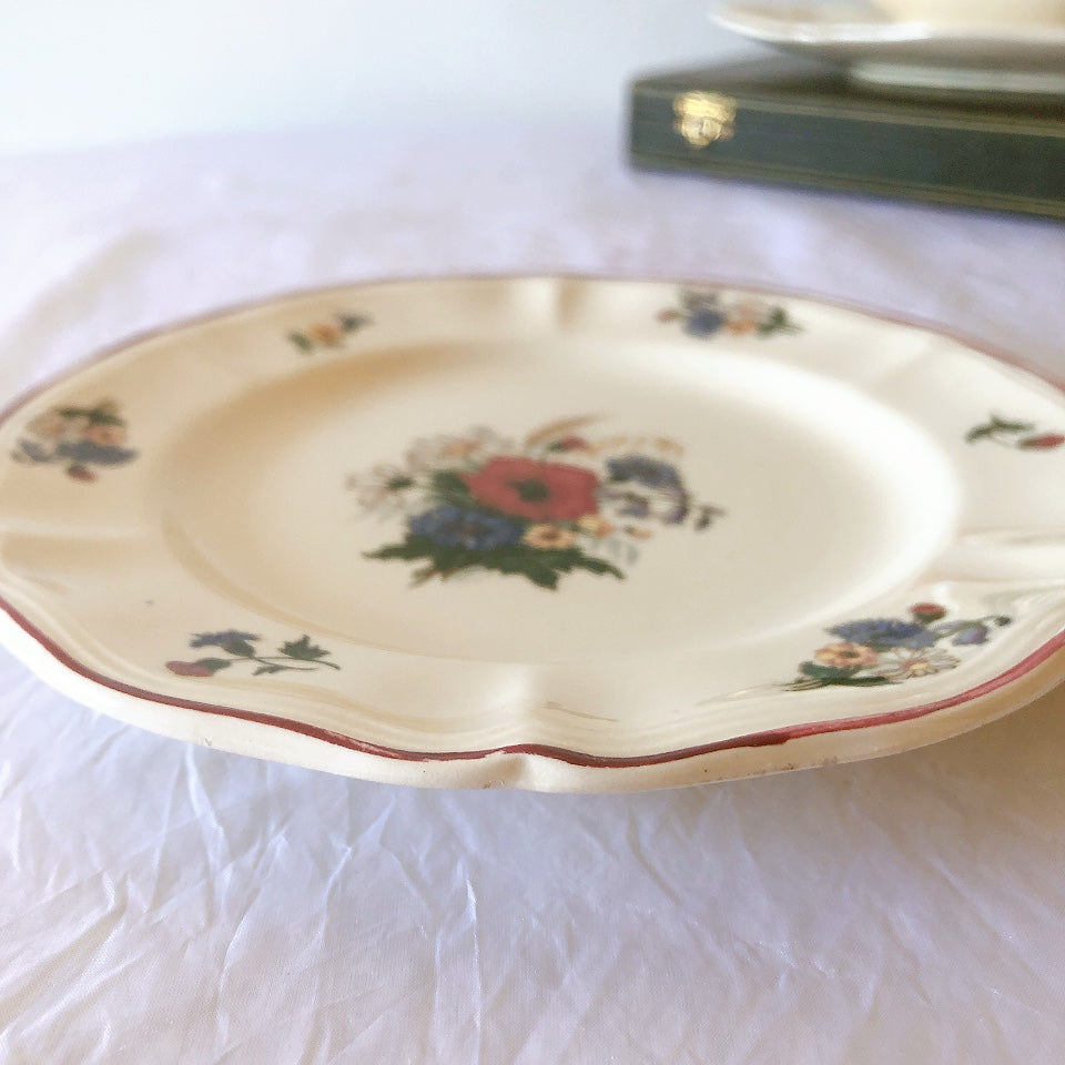 サルグミンヌ窯の人気シリーズ花リムを原型に、縁取りに赤いライン、真ん中と周りにポピーやひな菊などの野花をちりばめた、定番・人気の、アグレストシリーズです。