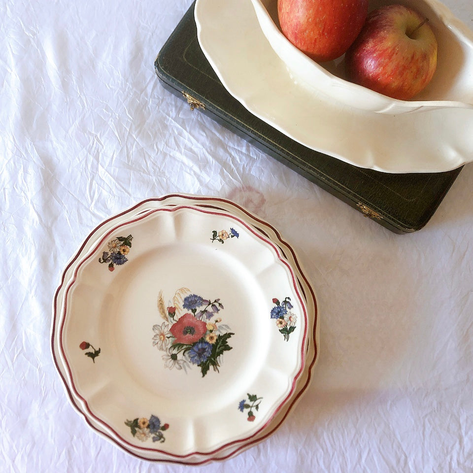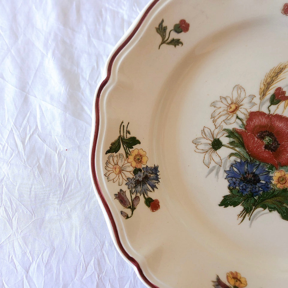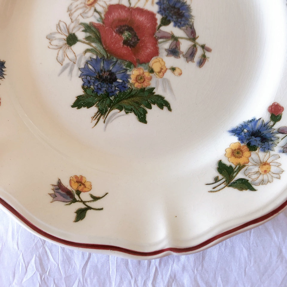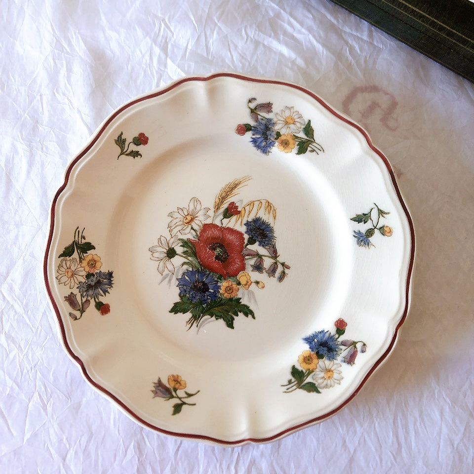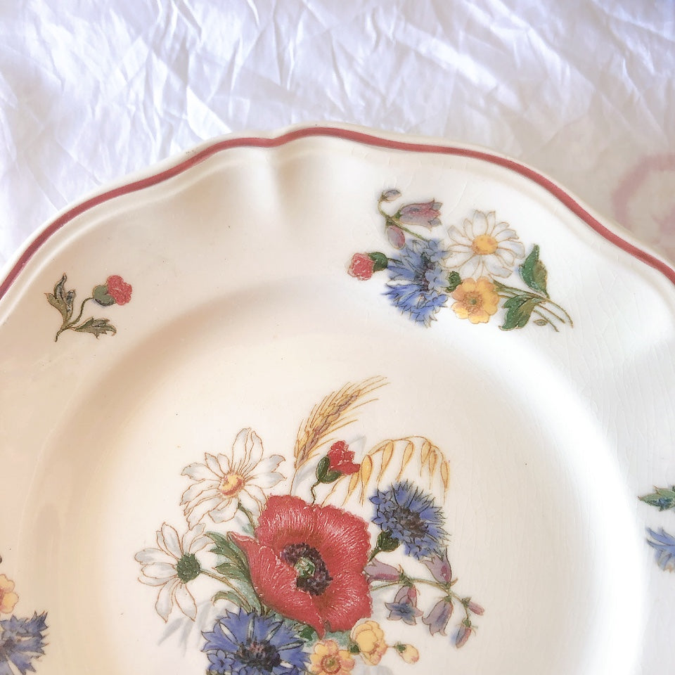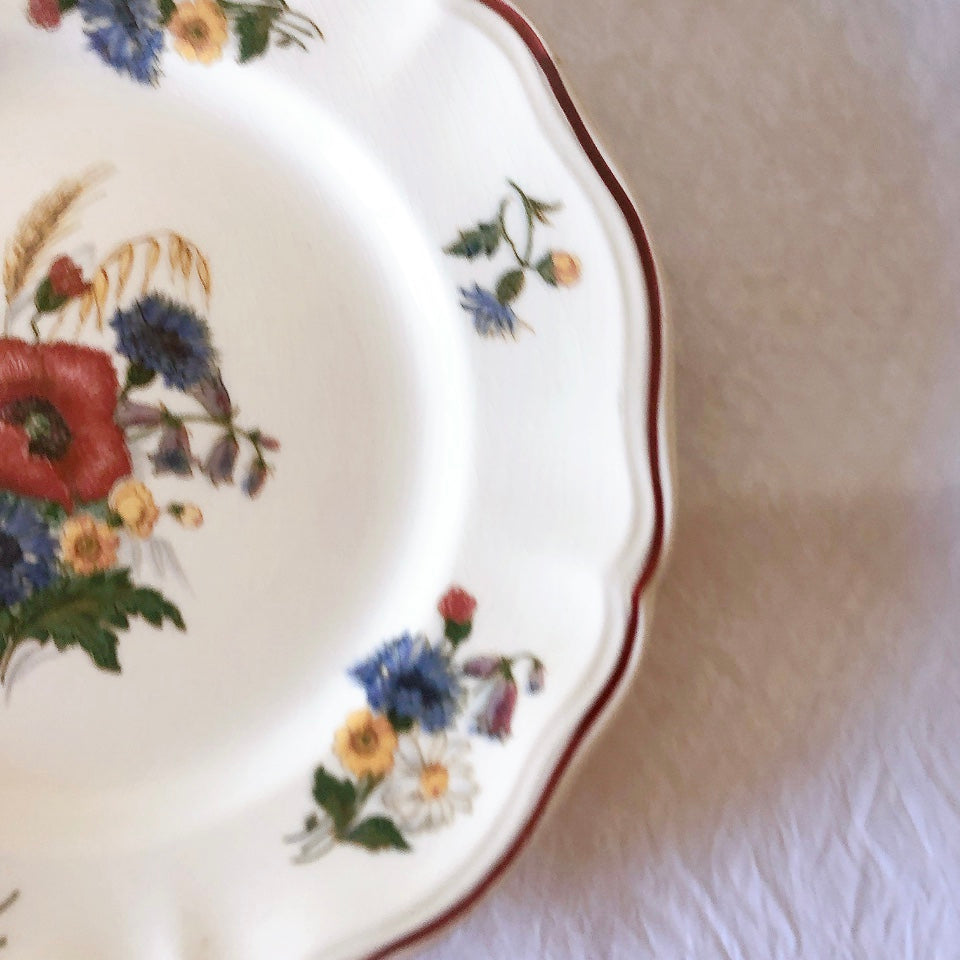 サルグミンヌ窯の人気シリーズ花リムを原型に、縁取りに赤いライン、真ん中と周りにポピーやひな菊などの野花をちりばめた、定番・人気の、アグレストシリーズです。