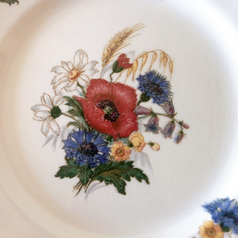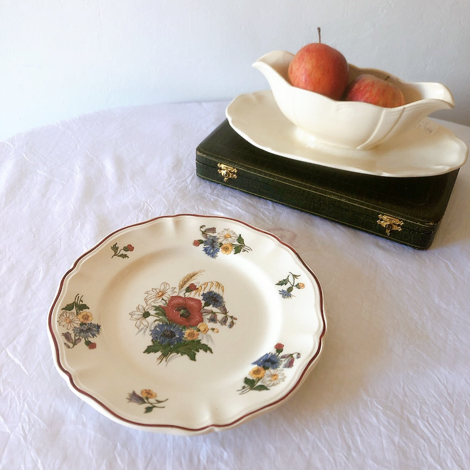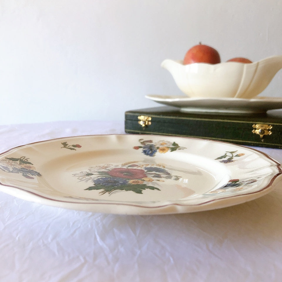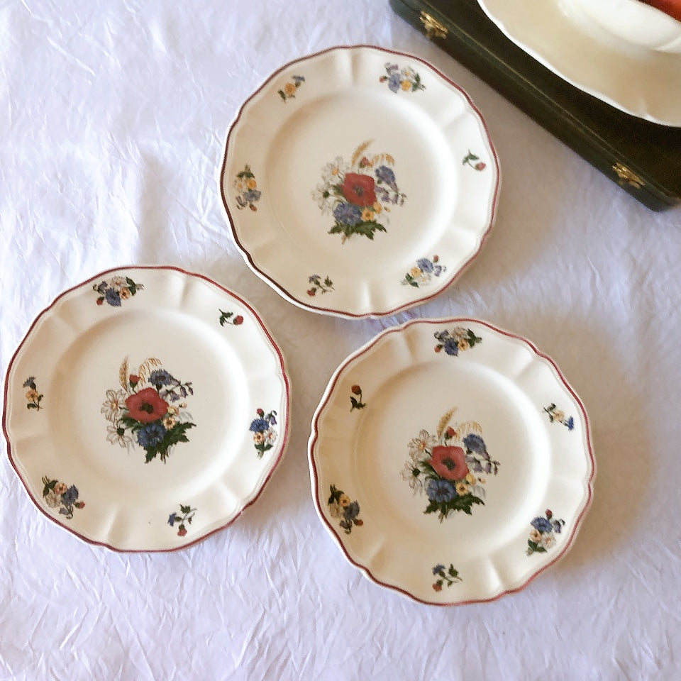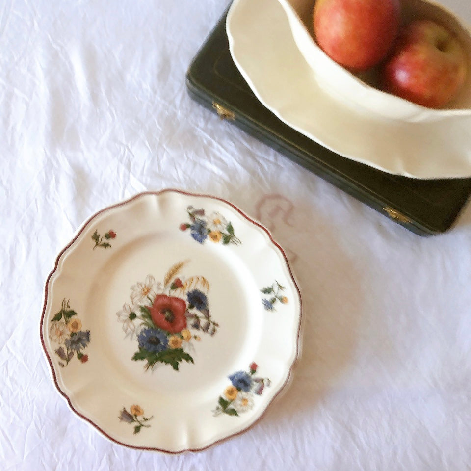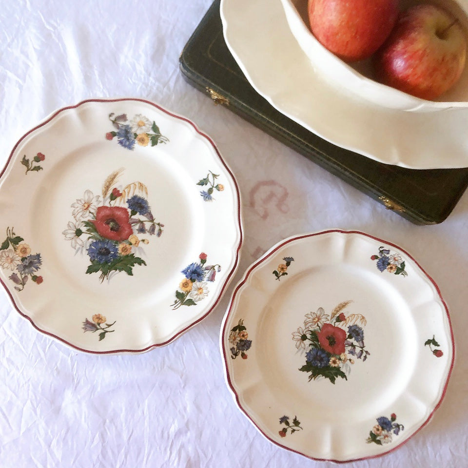 サルグミンヌ窯の人気シリーズ花リムを原型に、縁取りに赤いライン、真ん中と周りにポピーやひな菊などの野花をちりばめた、定番・人気の、アグレストシリーズです。