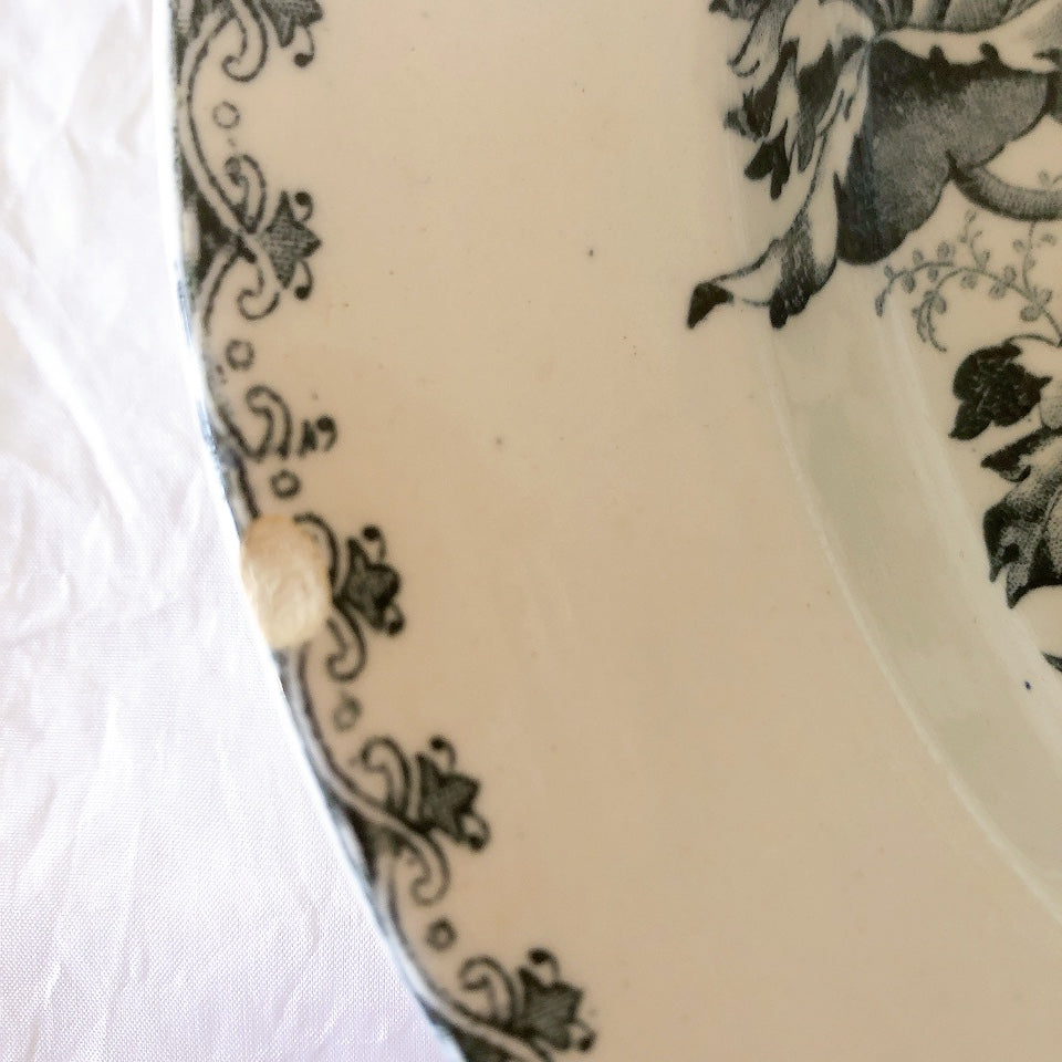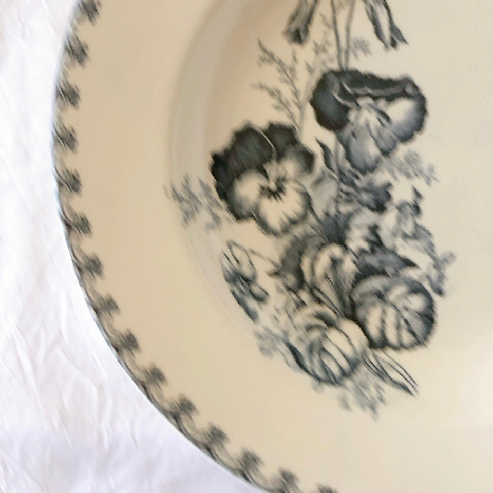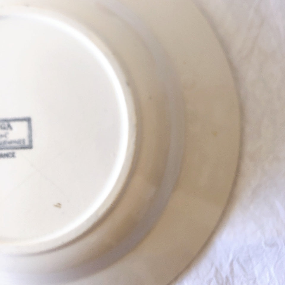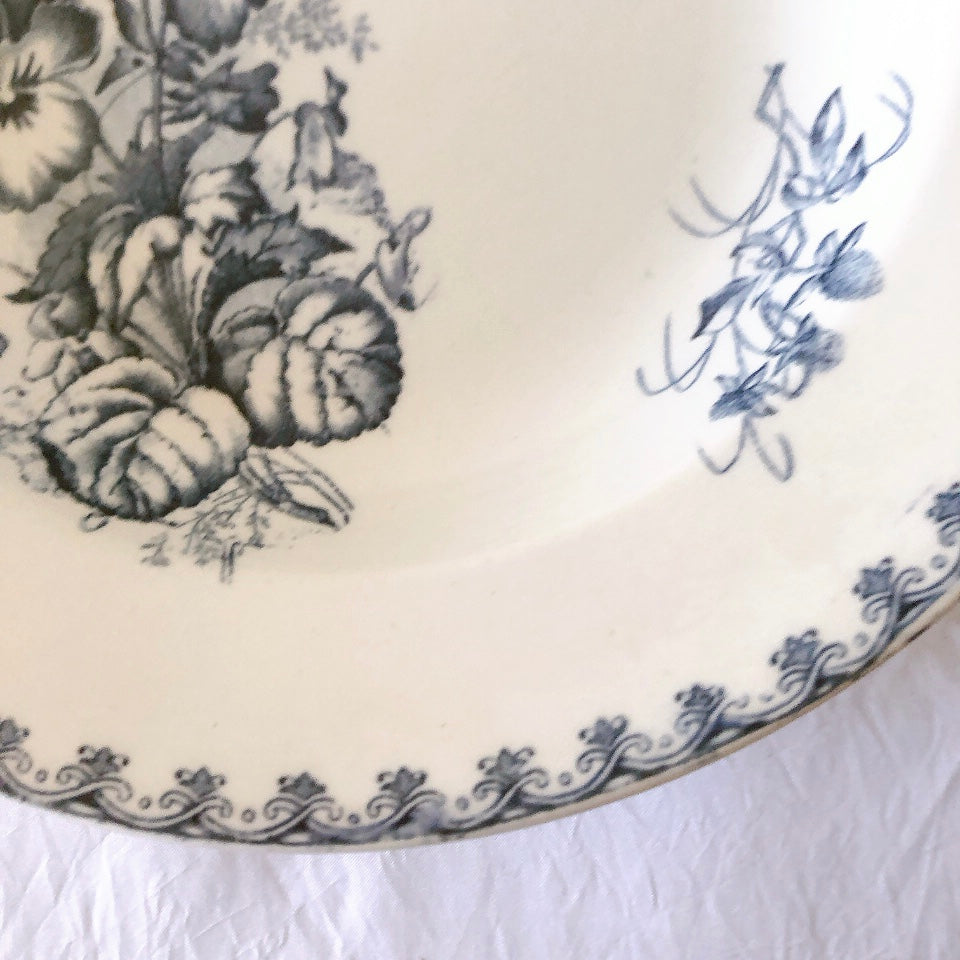 サルグミンヌ U&C時代の大変古いシリーズのプレートです。淡いオフホワイトの釉薬にリンゴの花が深いブルーグレーで描かれ、アール・ヌーヴォーの影響を感じさせる優雅に波打つ縁取りが特徴です。