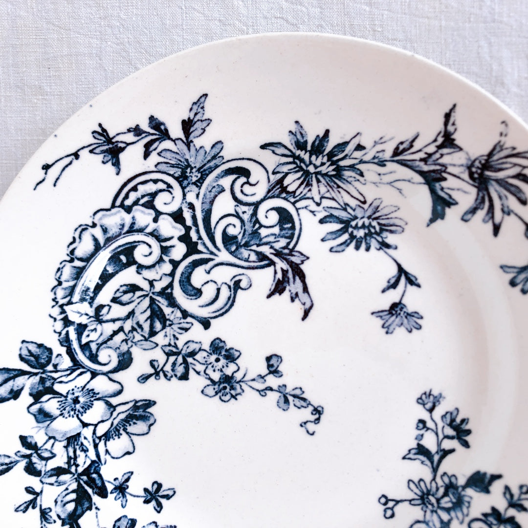 白地のプレートに藍色xグリーンのお色で植物や花が優雅に、エレガントに描かれています。