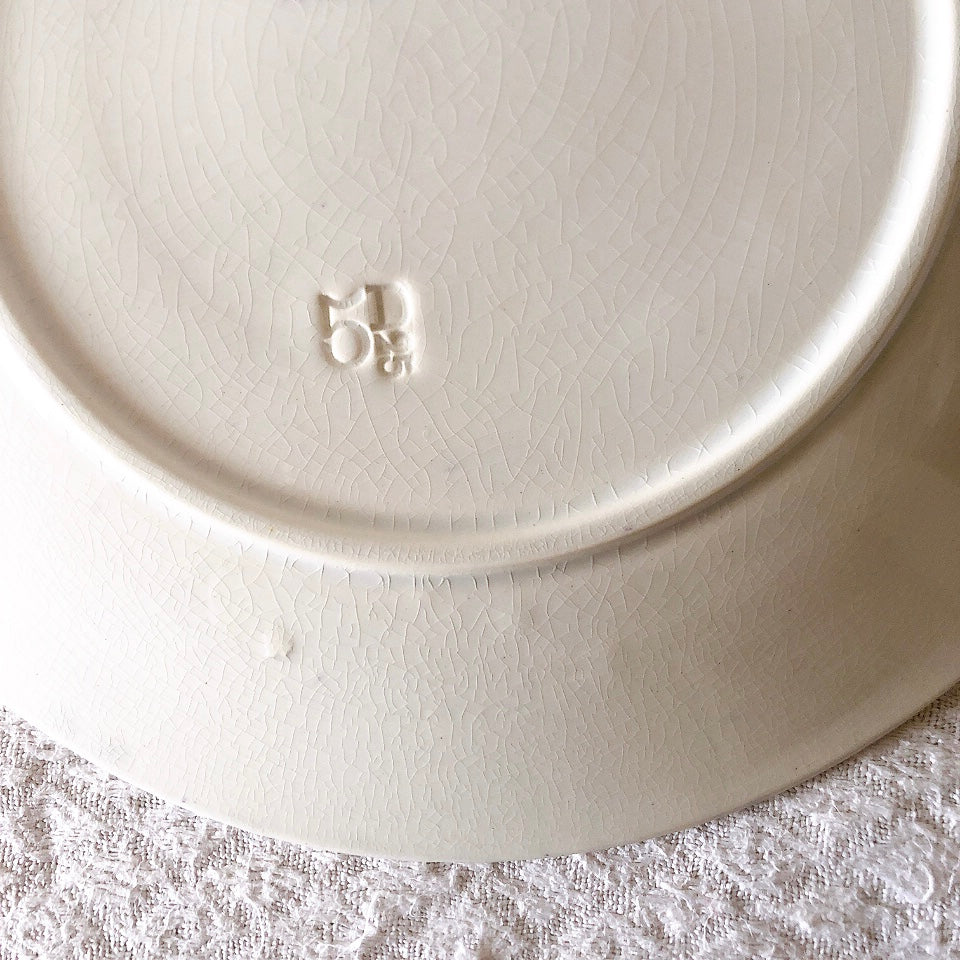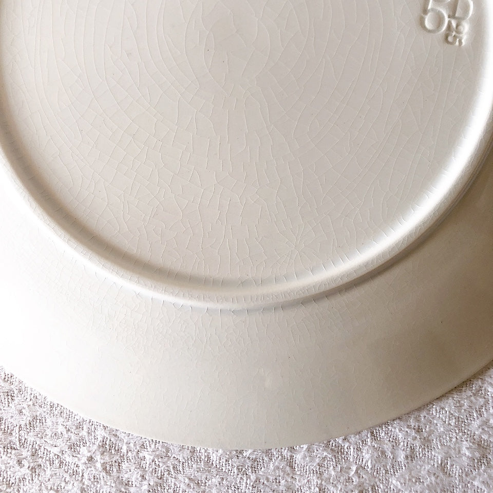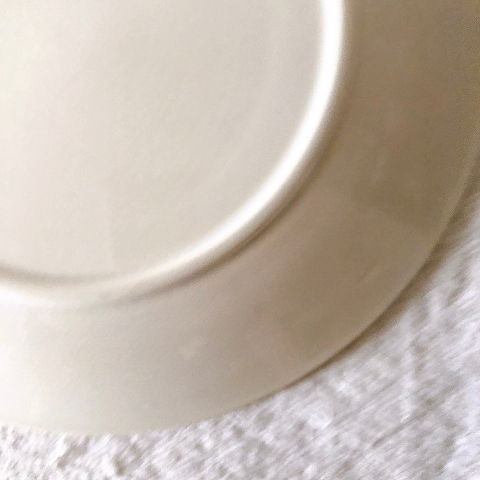 H: わずかなカトラリー傷、若干の色むら、縁に小さな製造時の膨らみ(上から釉薬で仕上げられています)、光の加減で貫入がみられます。
